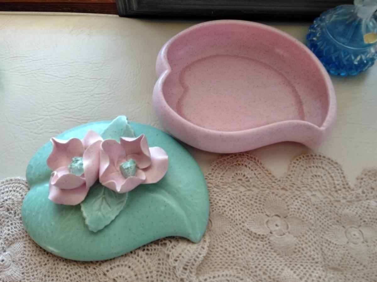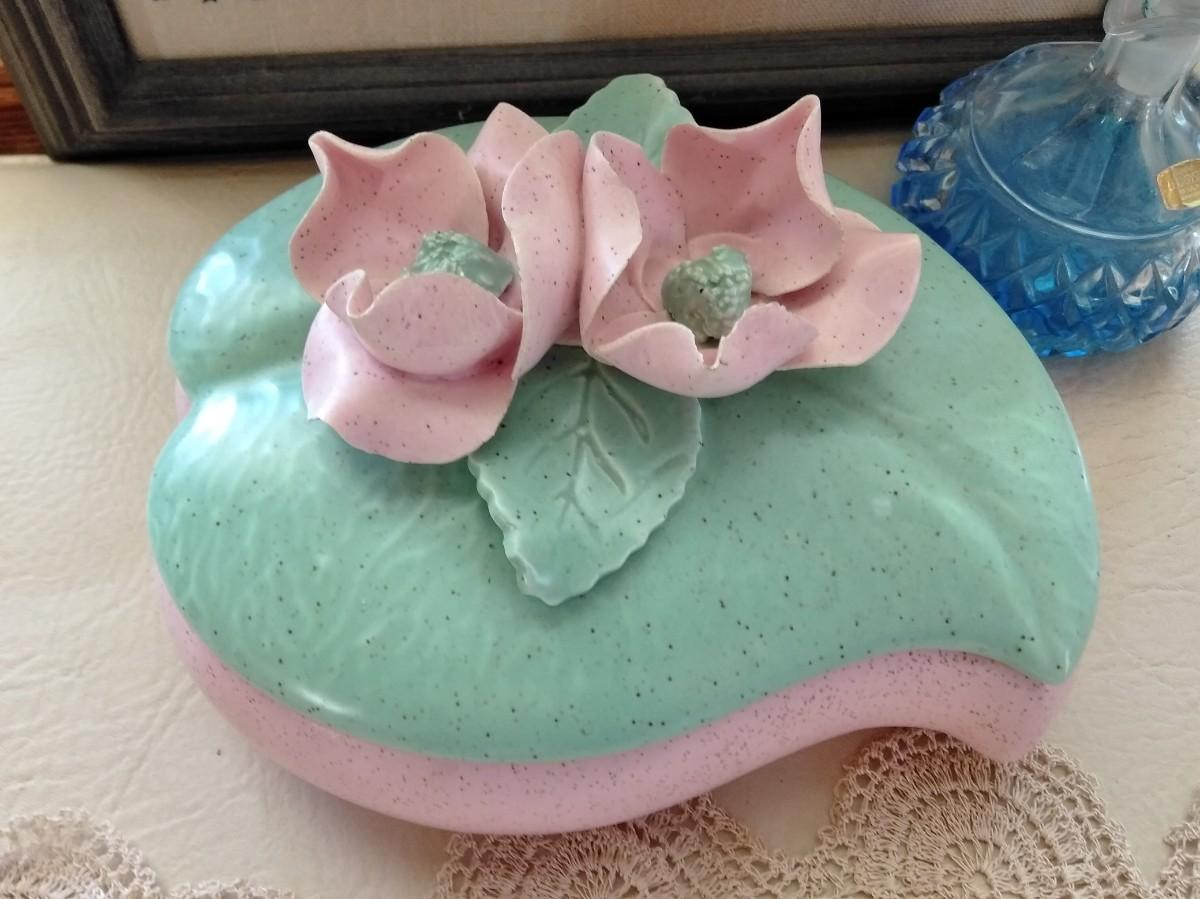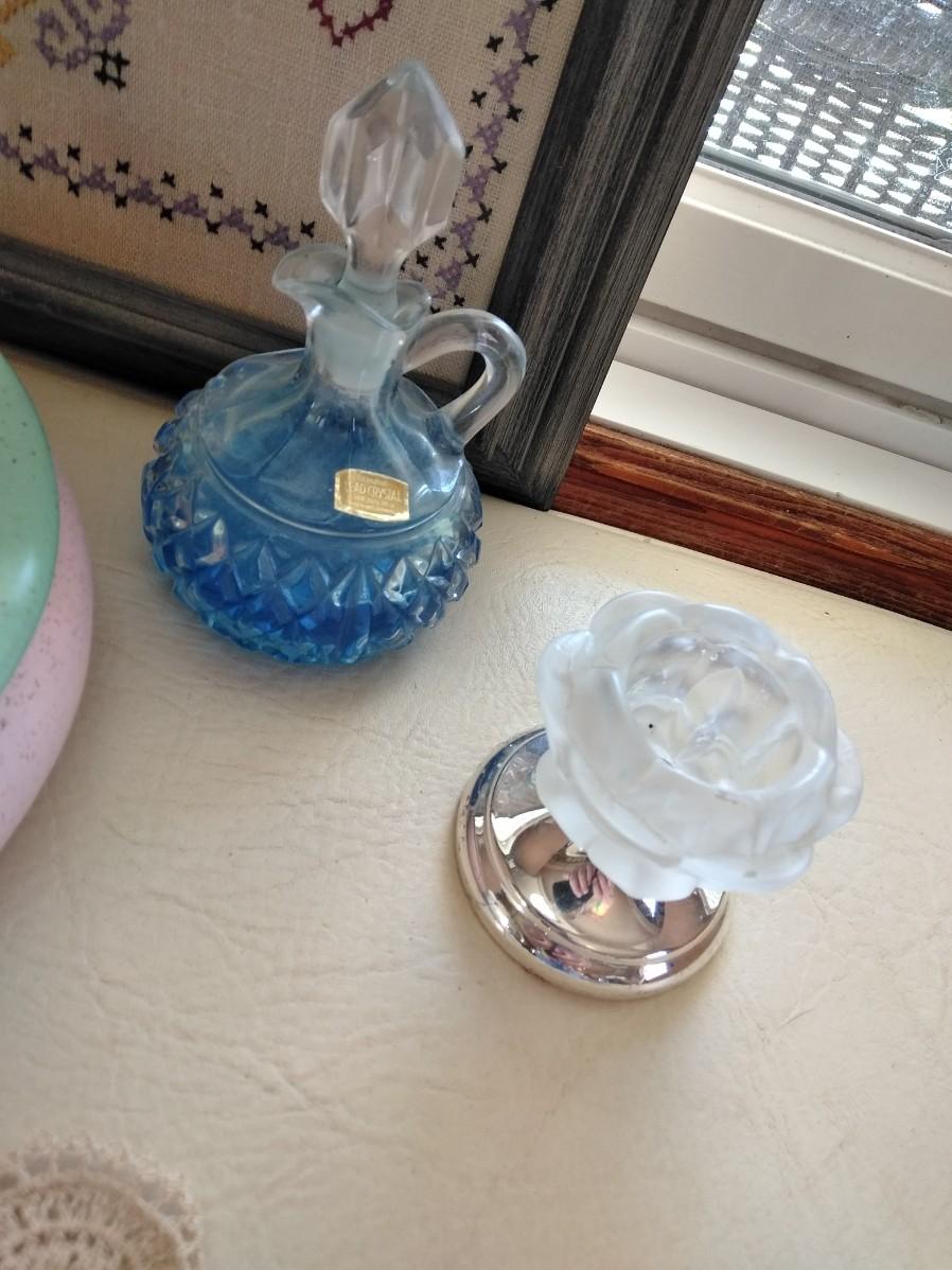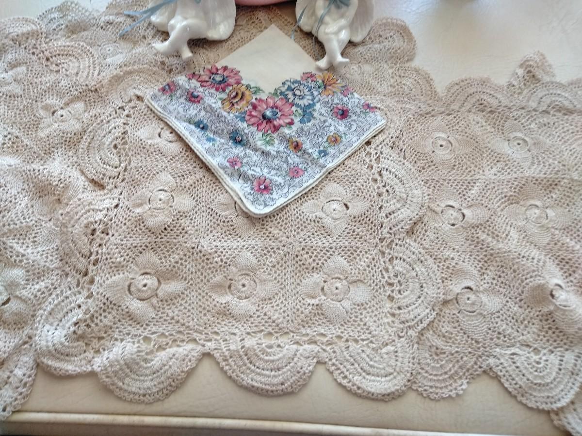 HAPPY HEARTS MAKE HAPPY HOMES FRAMED EMBROIDERED WALL HANGING, VINTAGE LIDDED USA MARKED DISH WITH FLOWERS, TWO SHELF SITTING ANGELS, PURFUME BOTTLE, ROSE CANDLE HOLDERS, AND A COLLECTION OF KNITTED DOILIES.