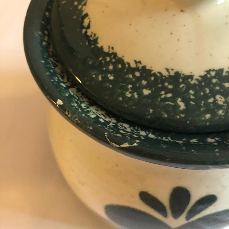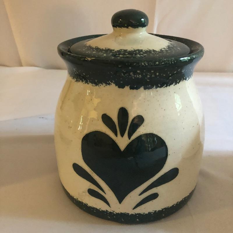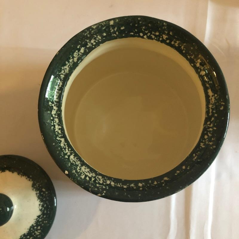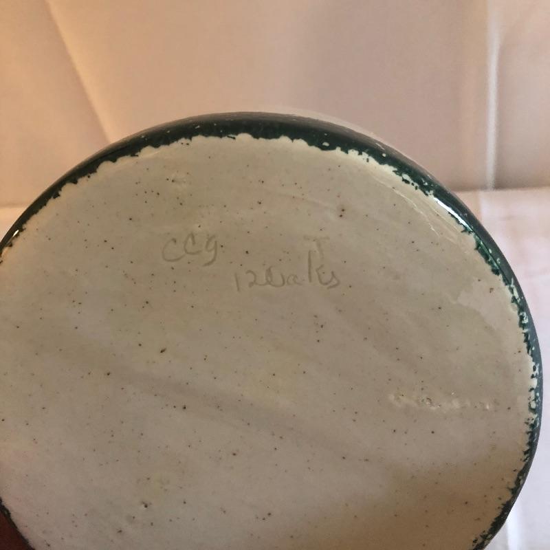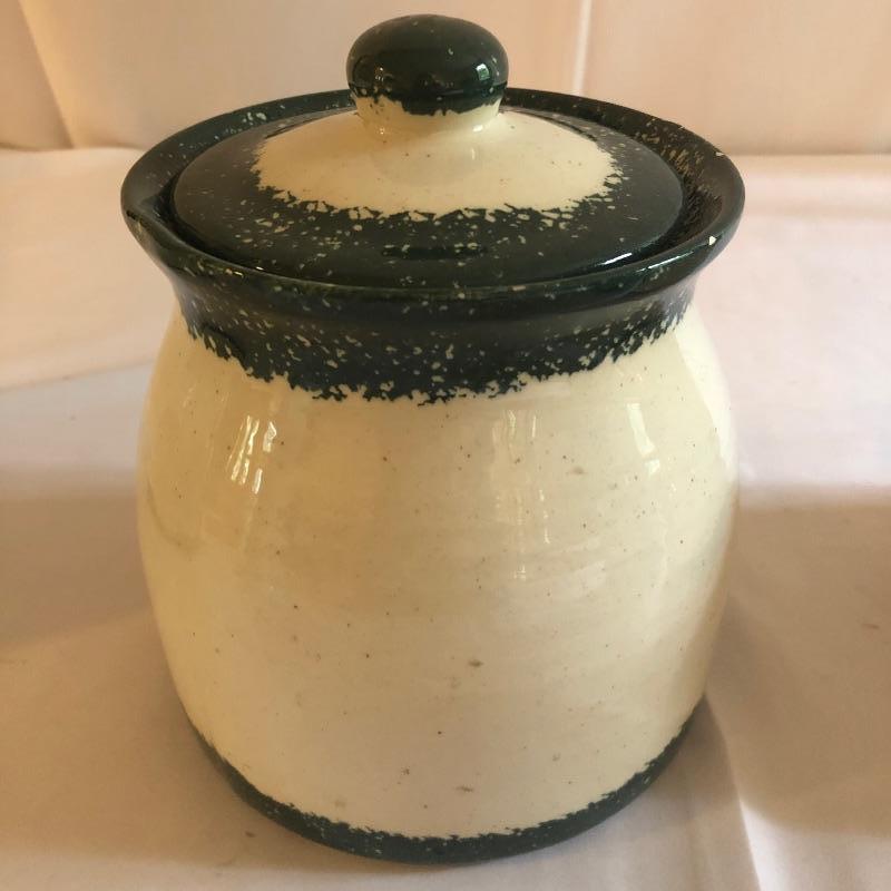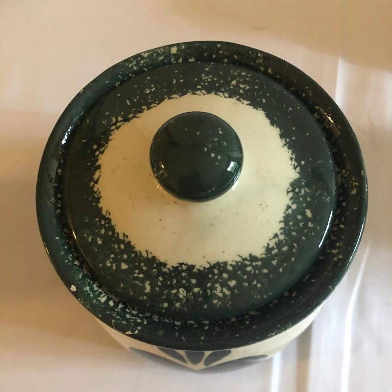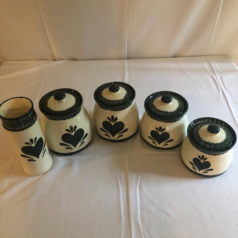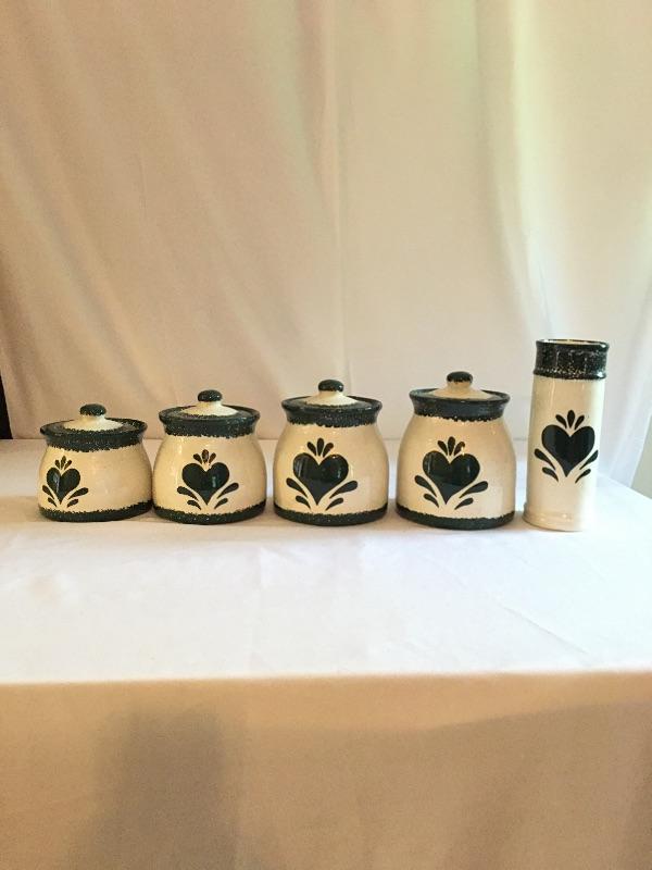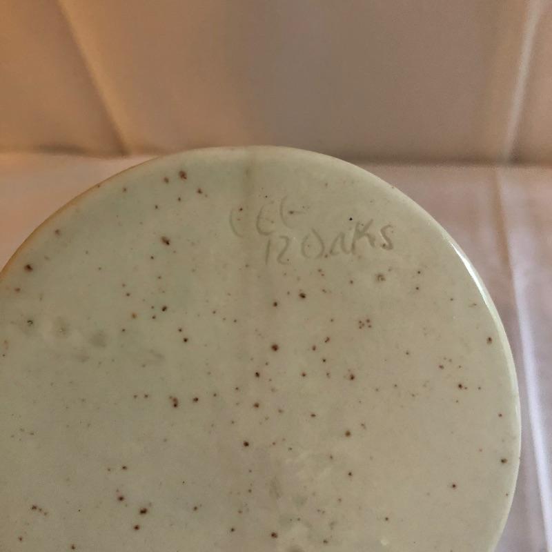 Add these precious containers to your countertop while keeping frequently used items close at hand! This lot includes four lidded glazed ceramic pots in cream and green (sizes vary large, medium, small, smaller) and a tall glazed ceramic canister. These lovely matching pieces will add lots of charm to your kitchen. All are signed and marked 12 Oaks. Tall canister measures 4”D x 10.25”H. Shipping available.