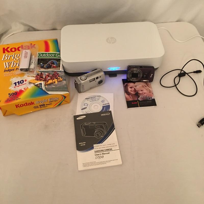 Lot includes HP photo printer, Kodak and Samsung digital camera, Kodak paper and phone back up buddy charger. Samsung camera could not be tested as batteries are dead. Printer is less than a year old.