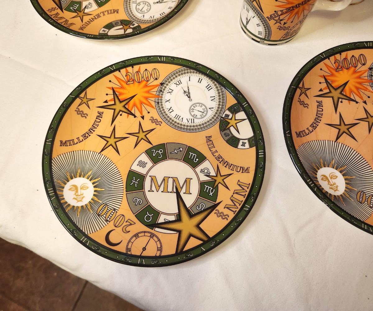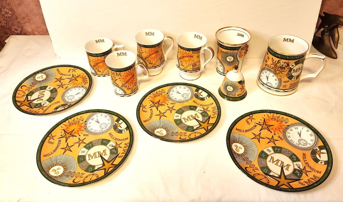 Nice group of bone china created to commemorate the Millenium - Sutherland, England. You get all you see here - 4 dessert plates, 2 mugs, Vase, Tankard, 2 footed mugs. New - never used. Plates are 8" across. 11 pieces in all. These were only sold in England. Good dealer lot here. Break it up and make some money.