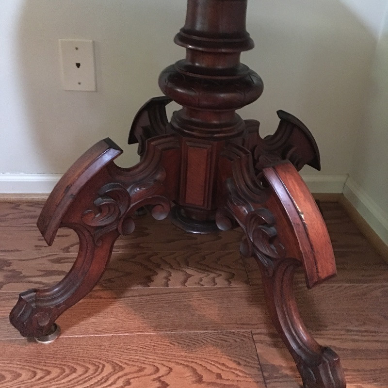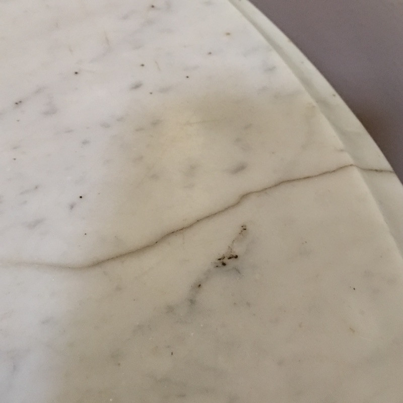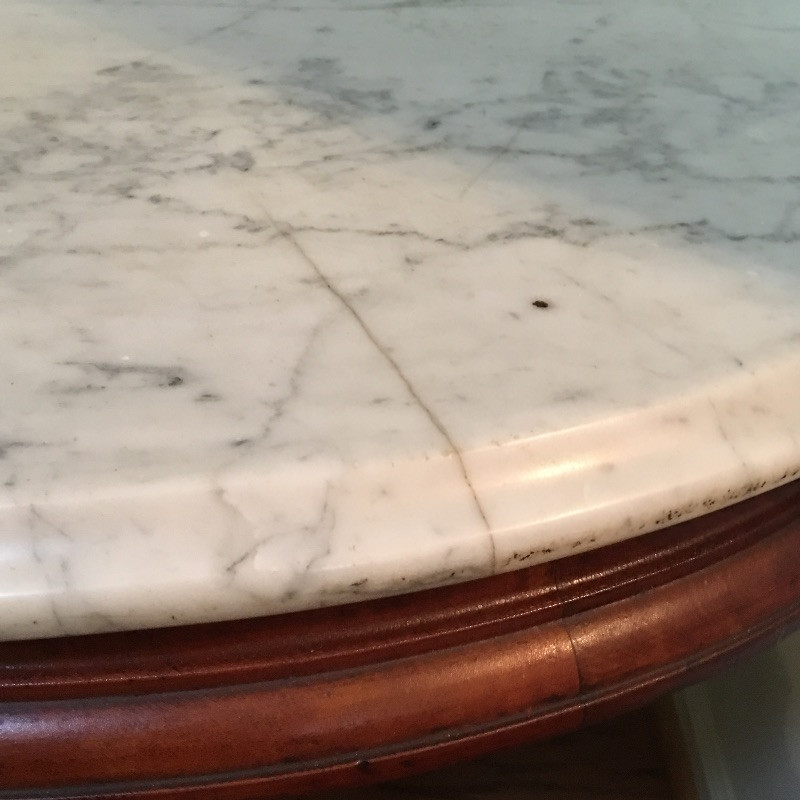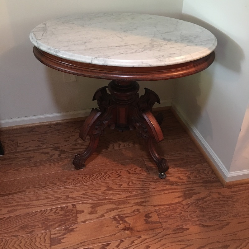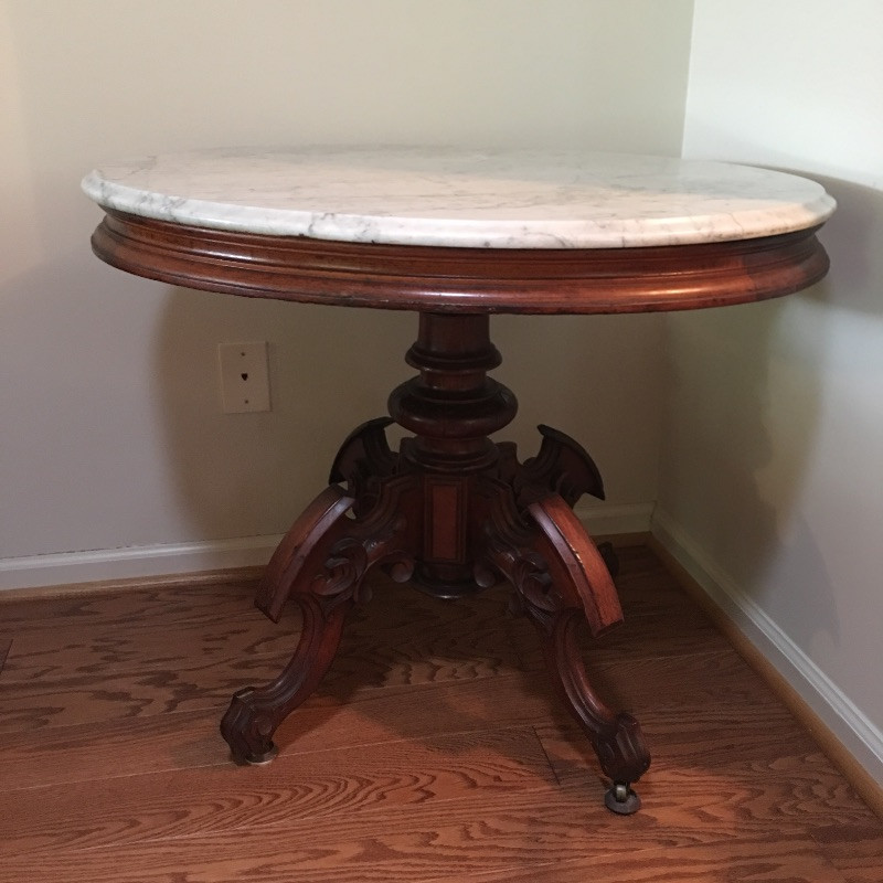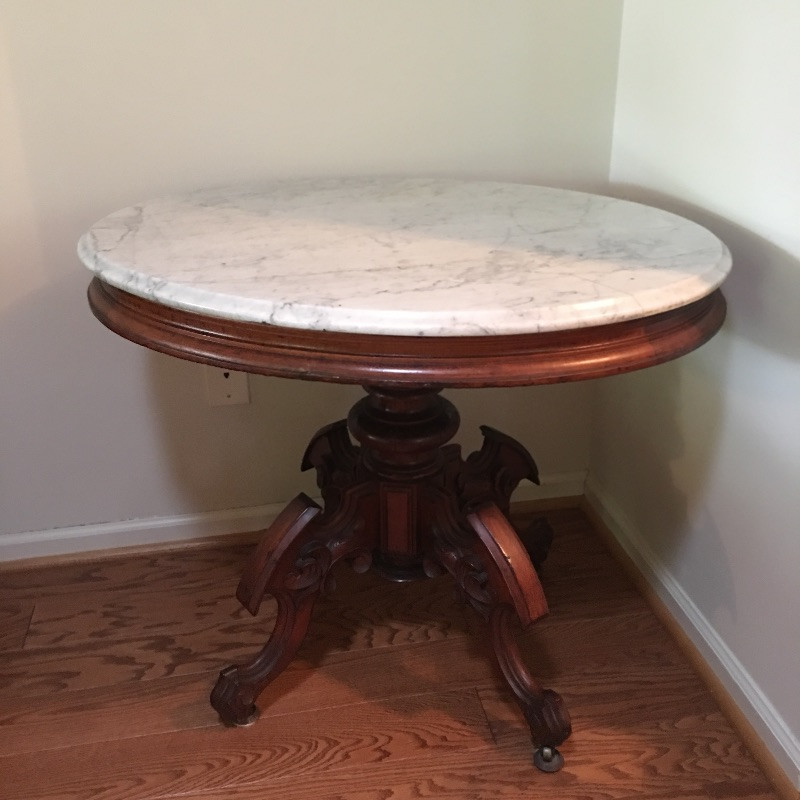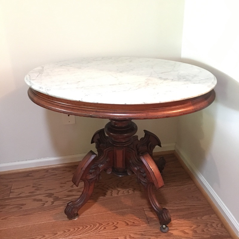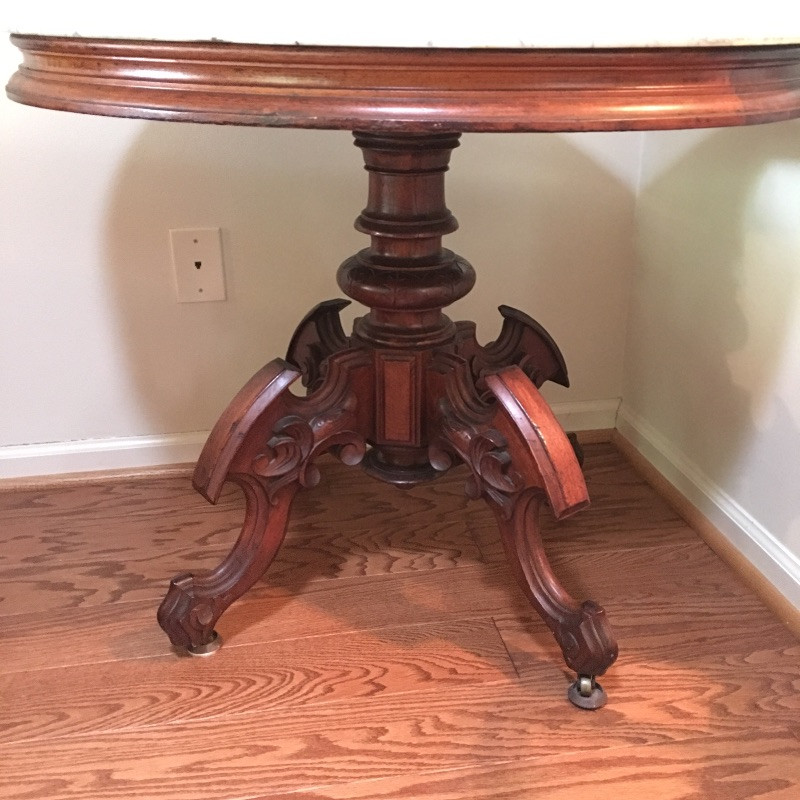 Impressive vintage marble topped table with intricate designs on base of table. Marble top has cracks that don’t seem to alter the integrity of the top. A beautiful table that needs no description, a picture is worth a thousand words,see pictures.