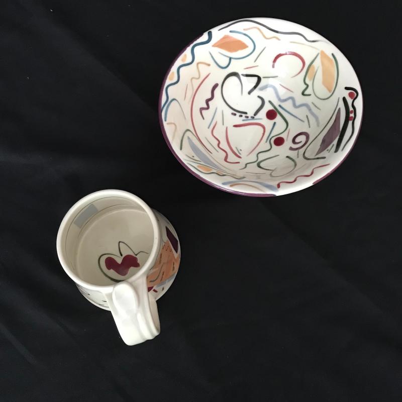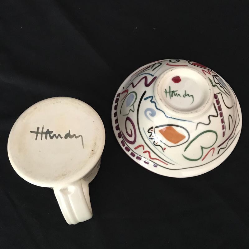 Use these fun and colorful bowl and mug set to start your day. Both signed “Handy”. Shipping available.