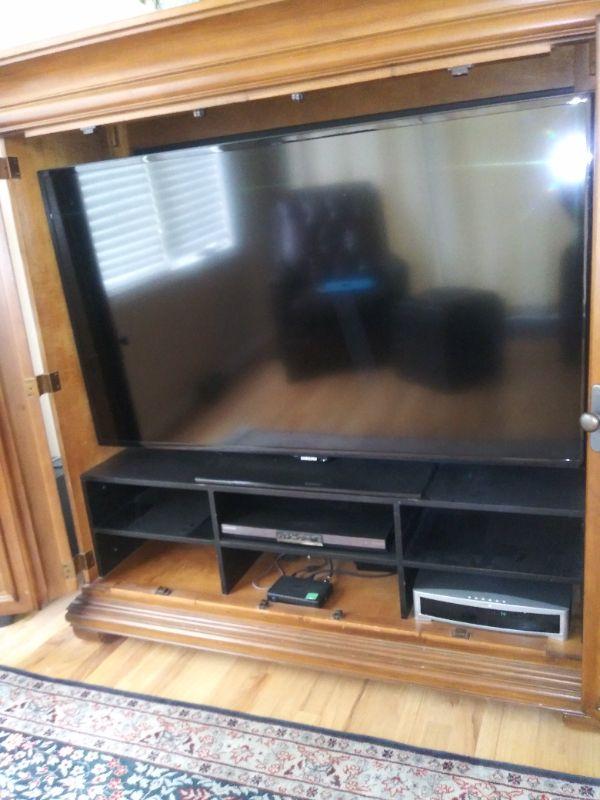 It accommodates this 55in flat screen and has six Cubbies for electronic components