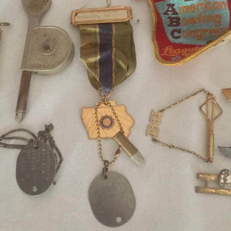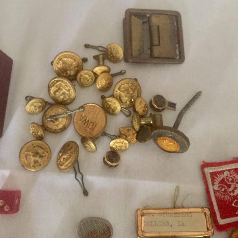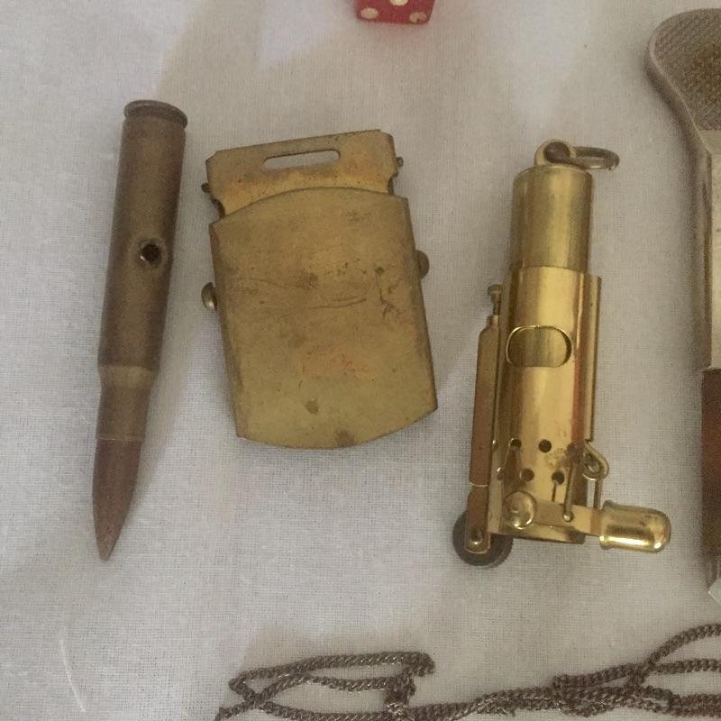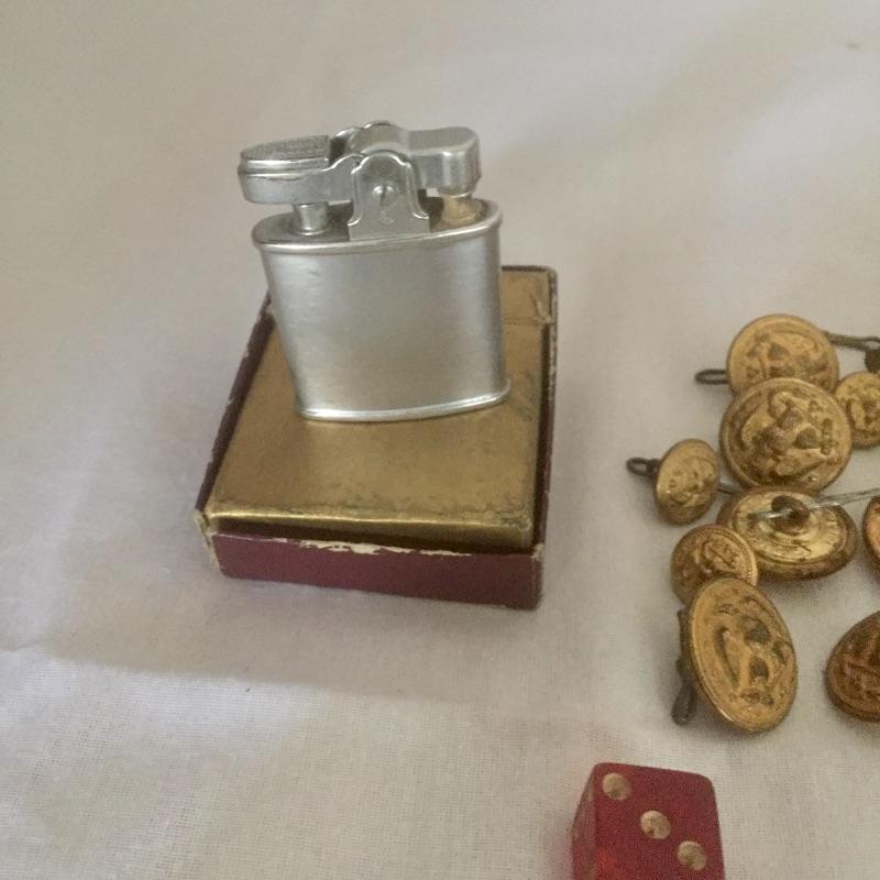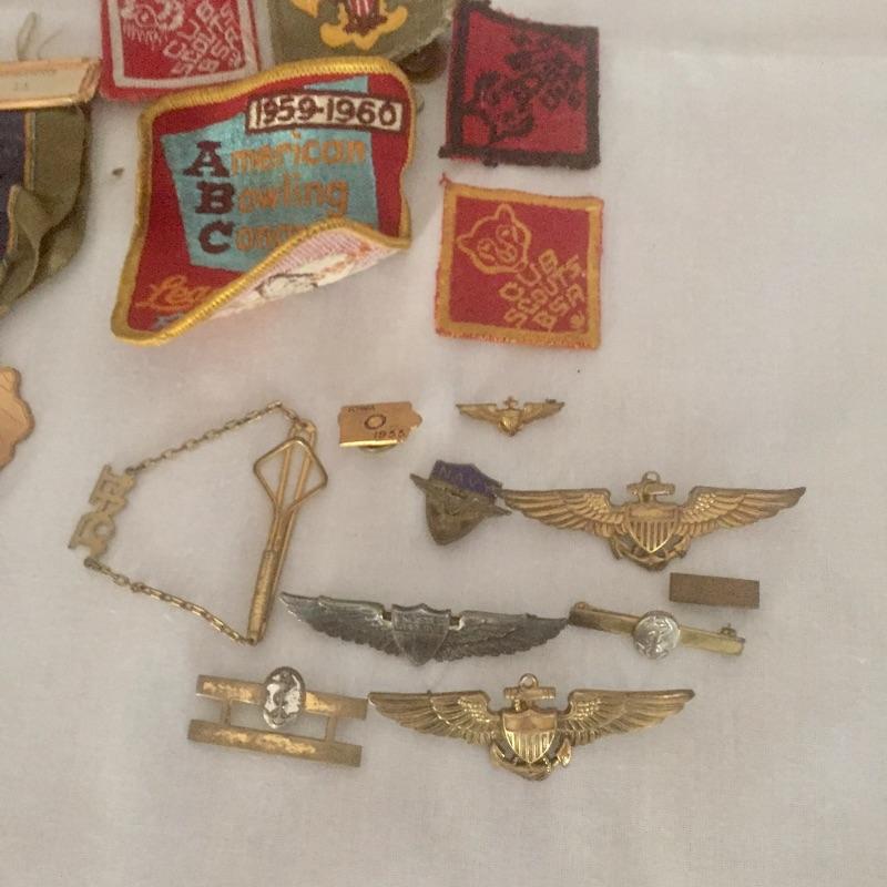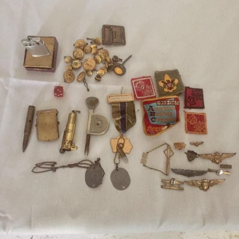 A unique collection of Badges, Pins, Uniform Buttons, Dog Tags, Bullet and engraved Zippo Lighter with original box and more, see images. Pins are possibly WWll Vintage Army Air Force Brass Wings.