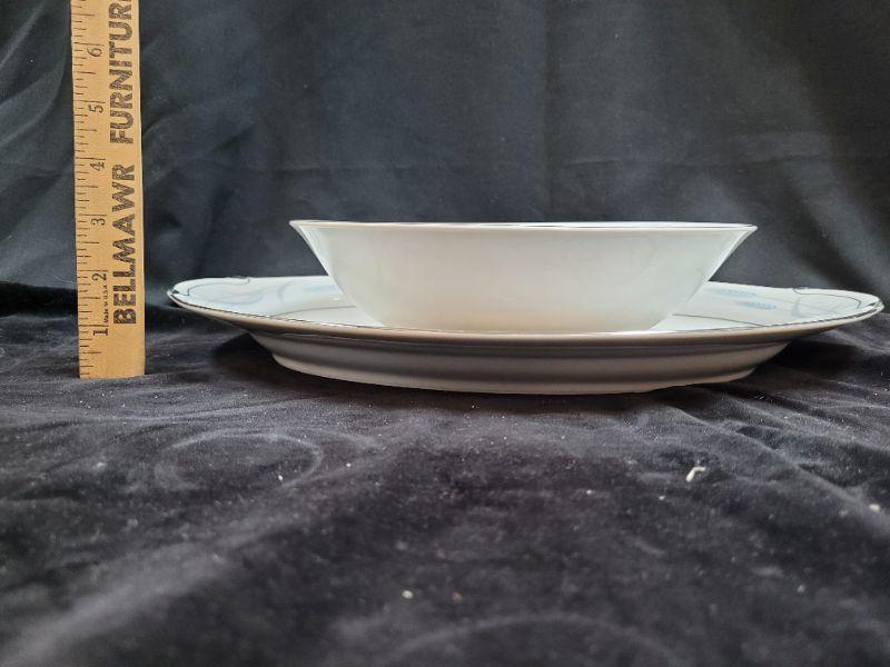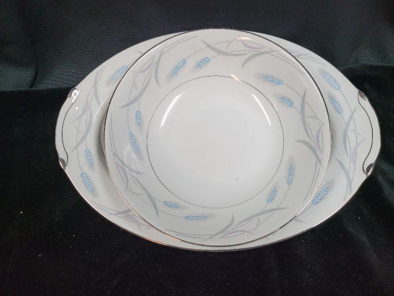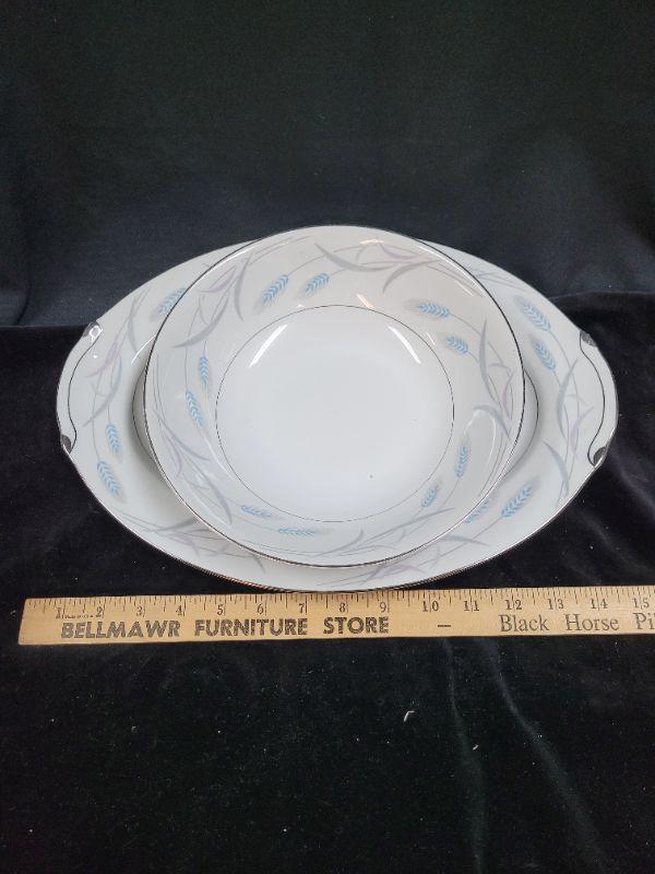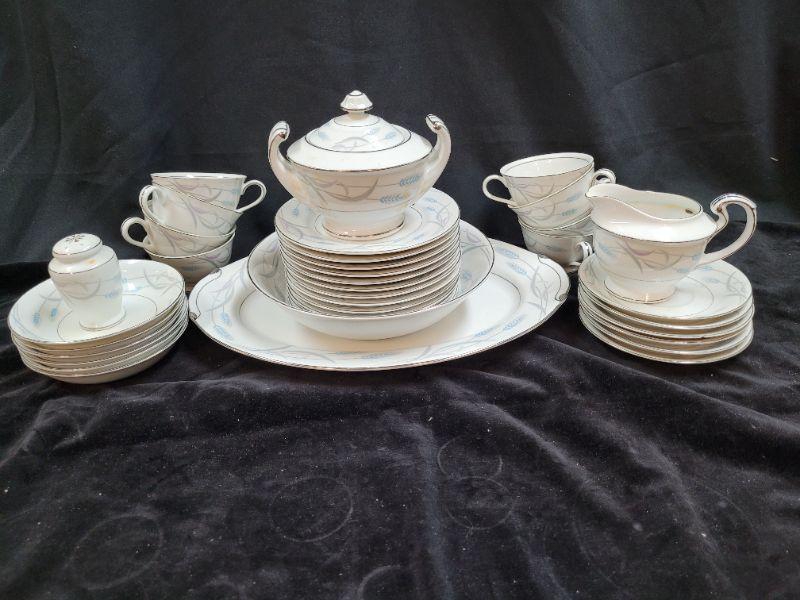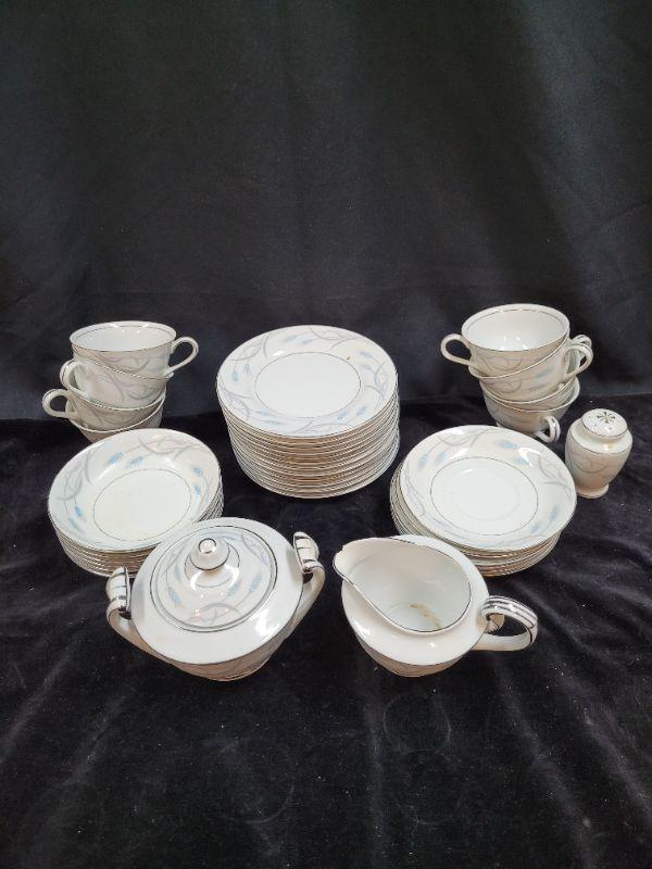37 piece lot includes 1 serving bowl, 1 serving platter, 1 sugar bowl, 1 creamer (with a chip), 1 salt shaker, 12 bread plates, 6 small bowls. 6 saucers, 8 tea cups