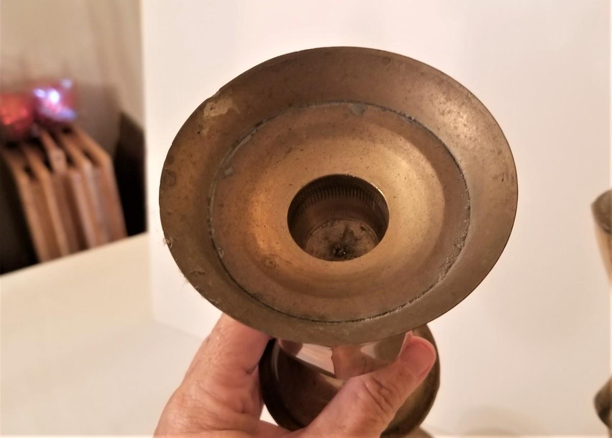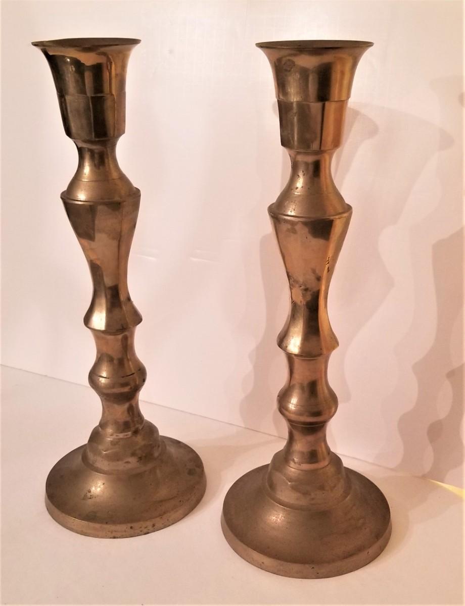 These brass (hollow) candlesticks can hold tapers or pillar candles. Both stand 18.5" tall. Made in India. Vintage condition.