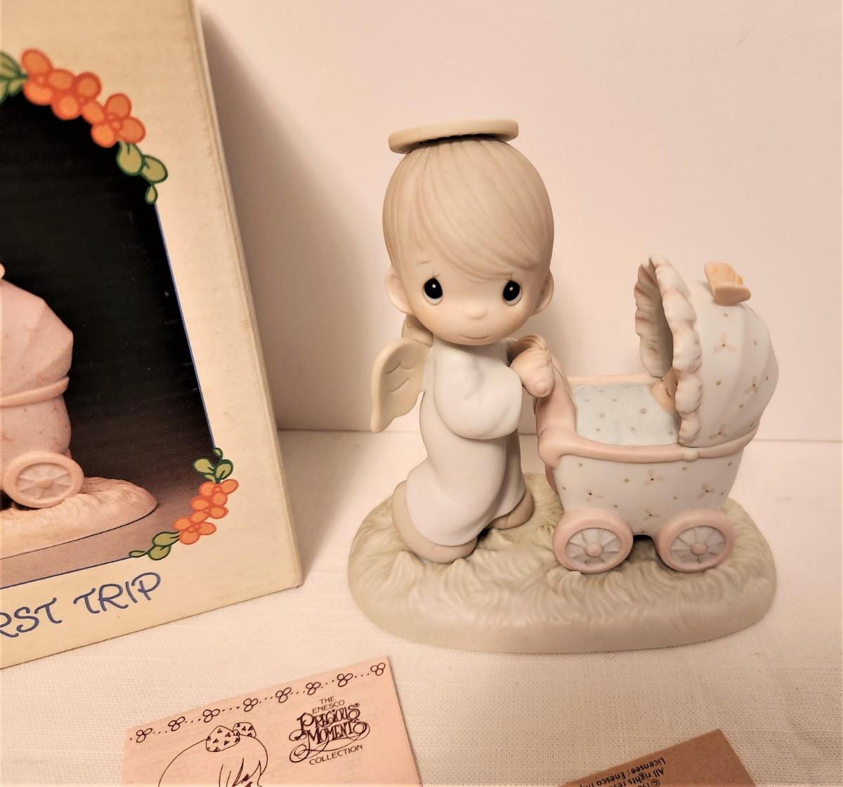 Precious Moments "Baby's First Trip" - 1985, 5.25" tall, original price 45.00, Design #16012. Comes with original box and hang tag. Good condition.