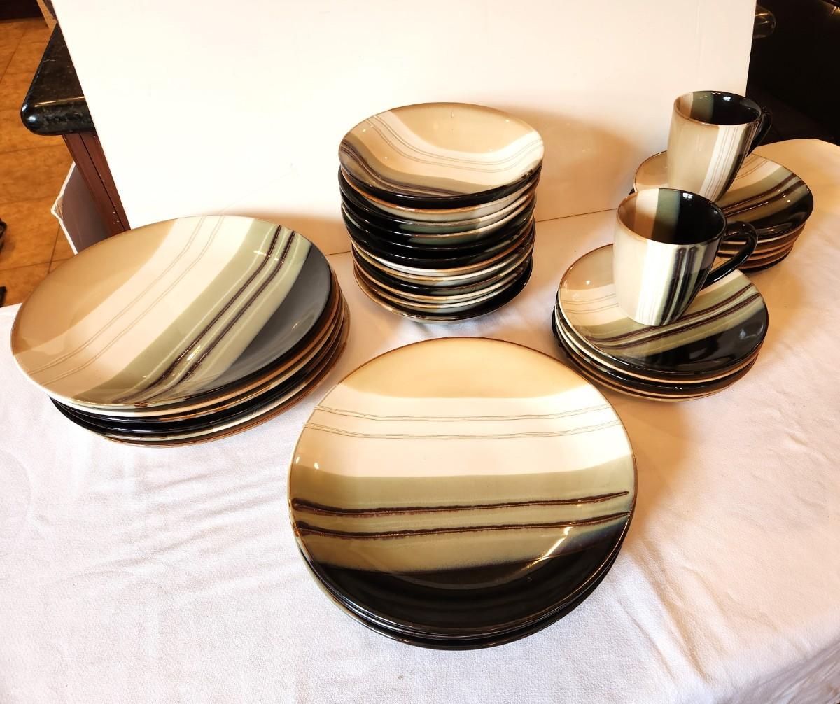 Good every day dinnerware set here - Home Trends "Jazz" set - neutral colors - 11 saucers (7.75" across), 12 bowls, 2 mugs, 10 dinner plates (10.75" across). All in gently used conditions - no chips.