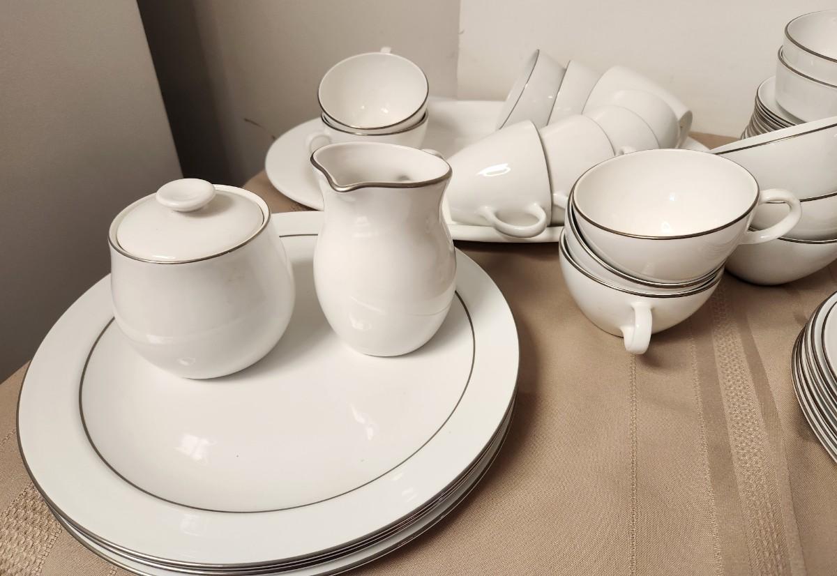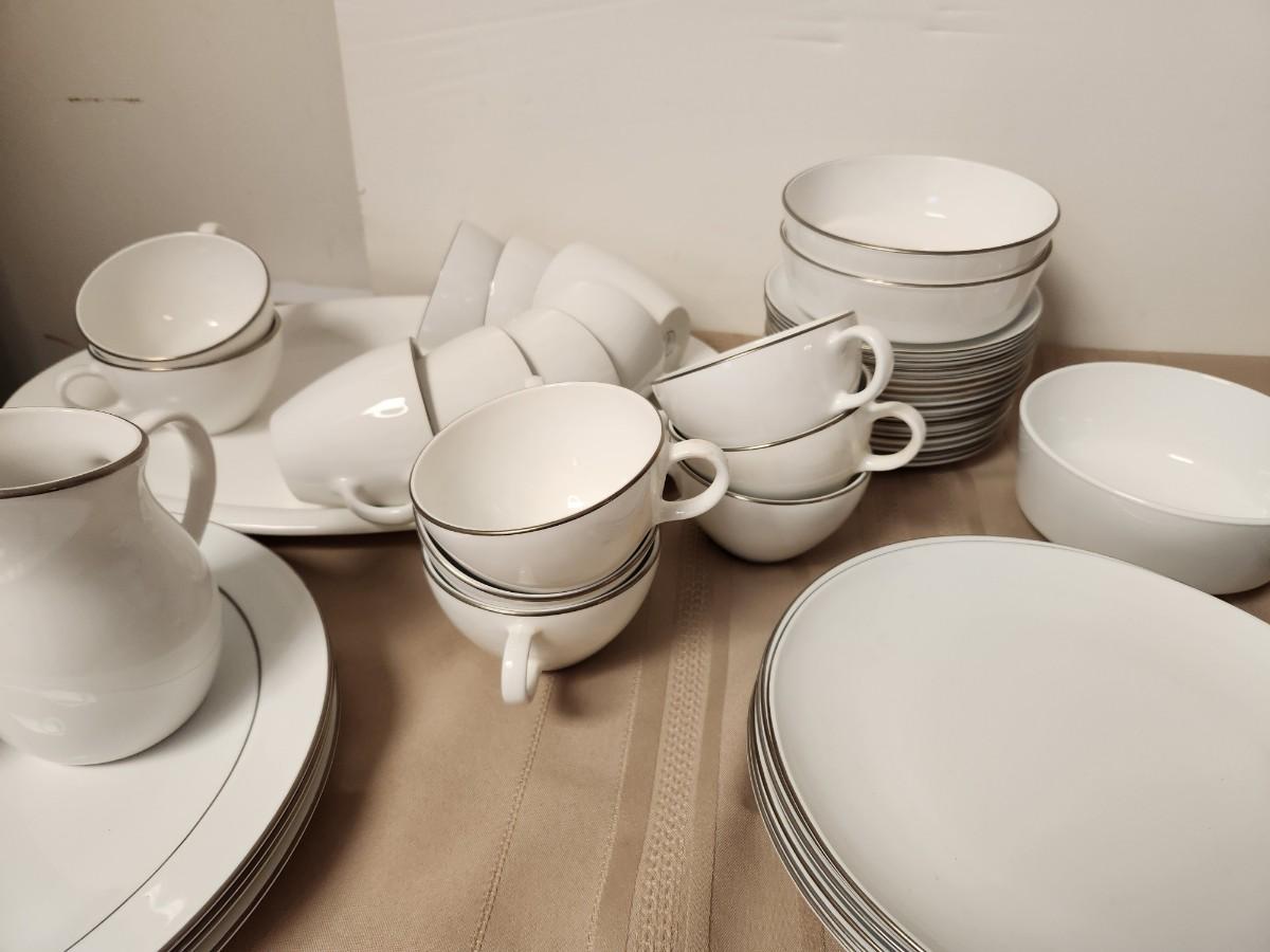 You get all you see here - vintage Corning Ware dinnerware set in the "Centura" pattern. 6 mugs, 8 coffee cups, 15 saucers, 4 dinner plates with double rim, cream/sugar, 3 small bowls, 4 bread/butter plates, 1 serving bowl, 6 salad plates, and 7 regular dinner plates. These are white with platinum rim. Good condition. 1960's.