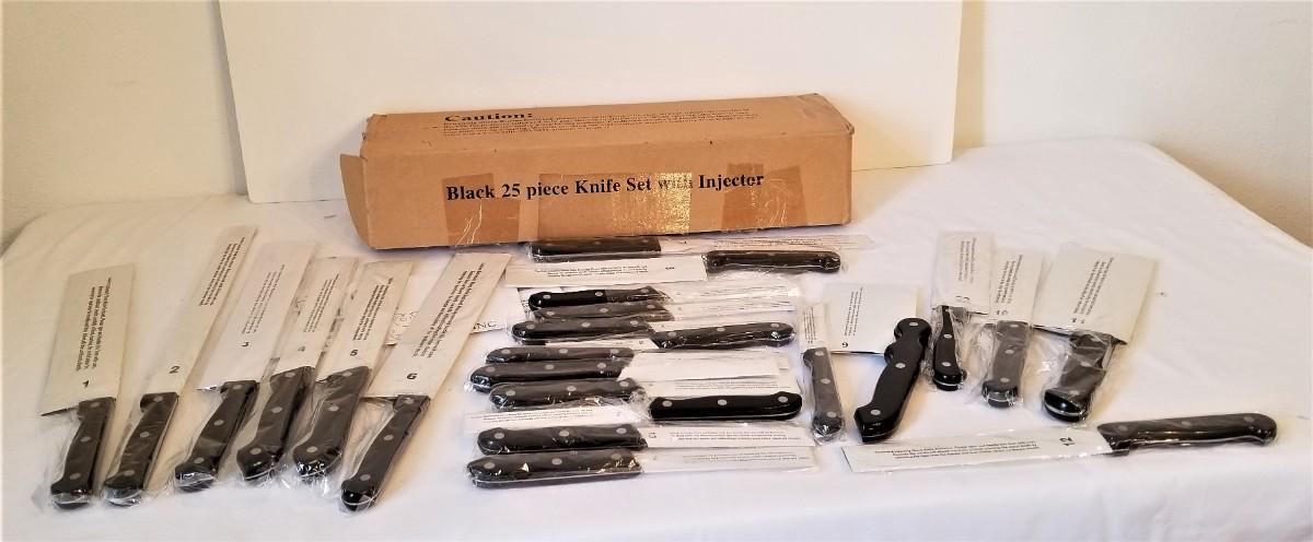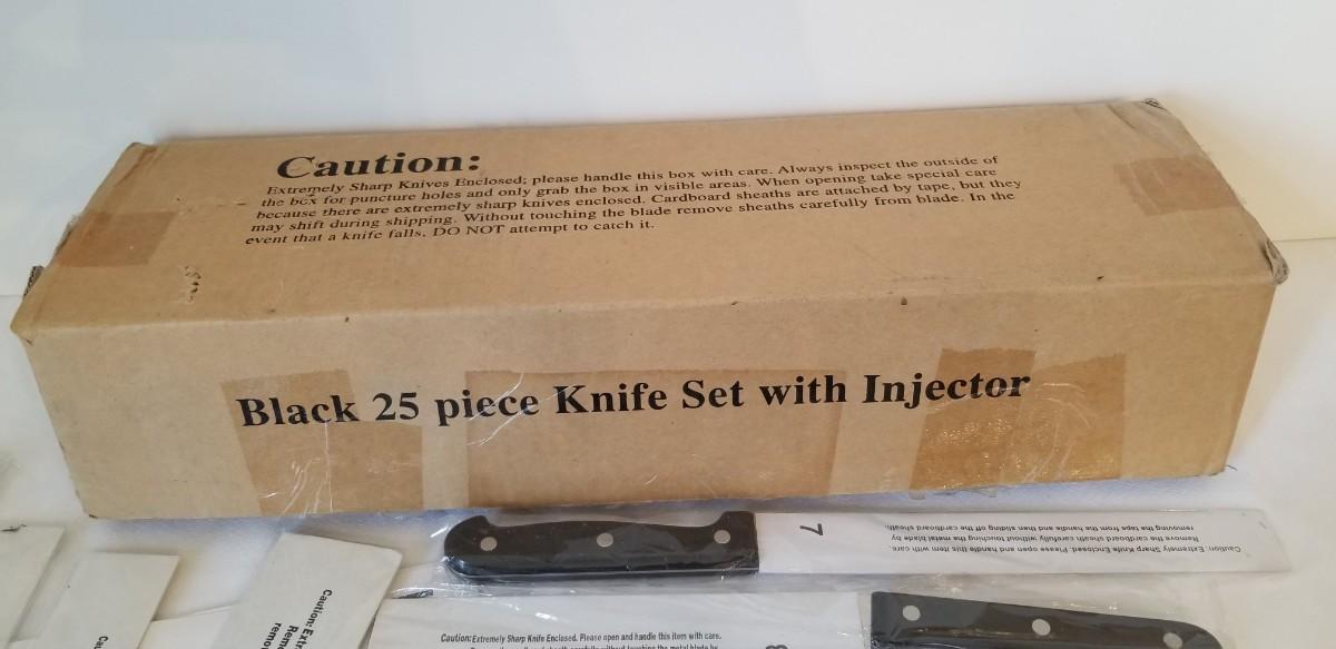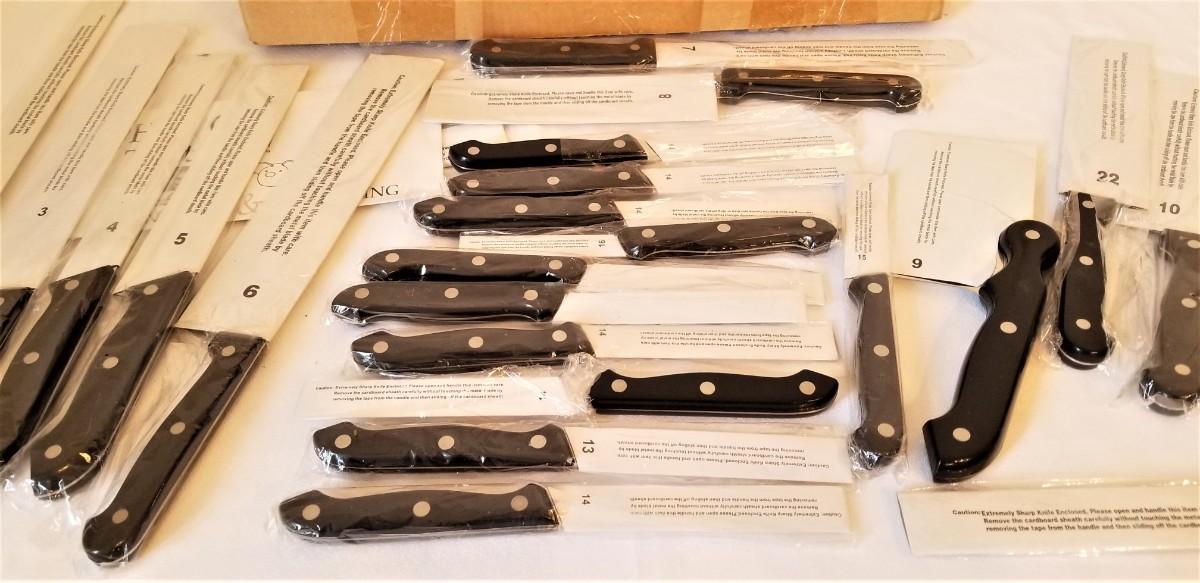 You get all you see here - 24 knives in all - new in sleeves, never used. Purchased in 2004, has receipt. This was an "as seen on tv" set. Set appears to be missing the injector and 1 knife.