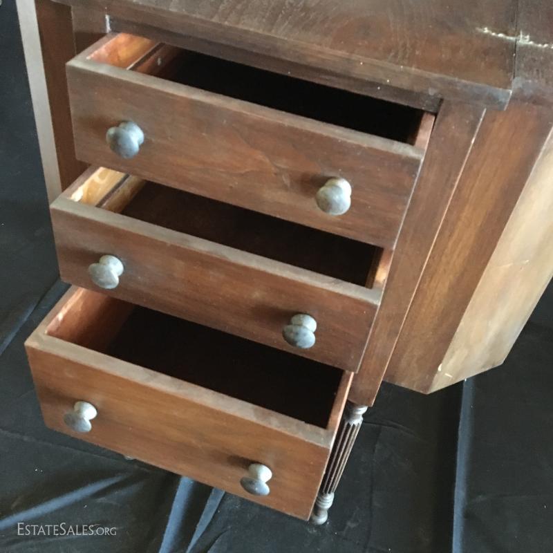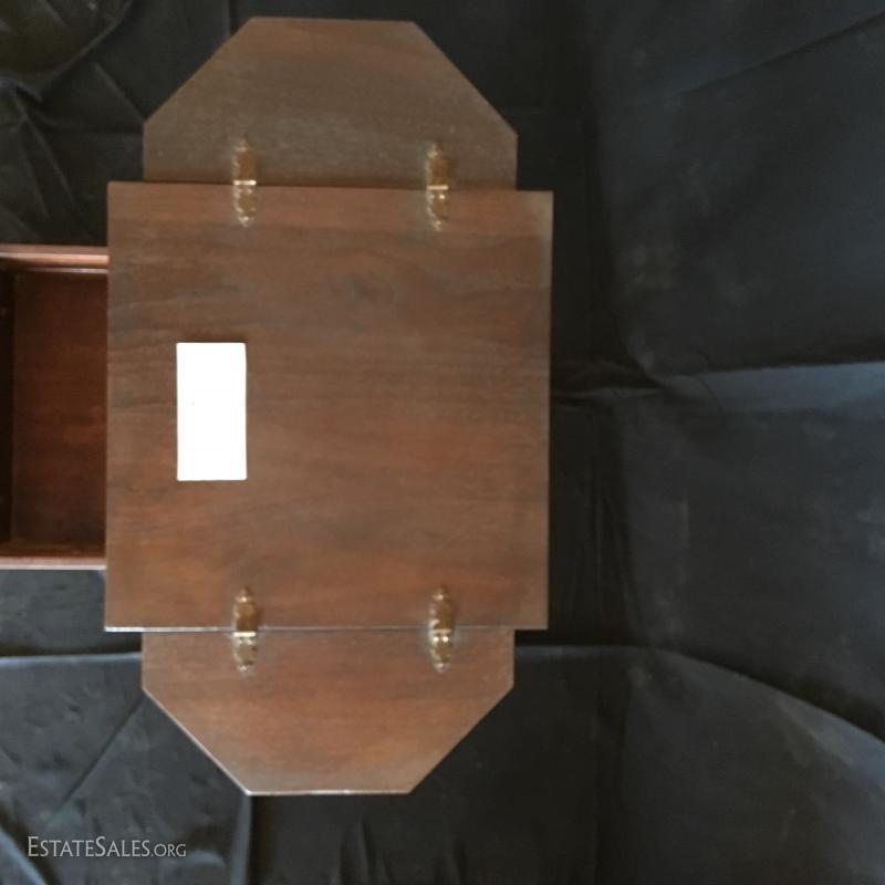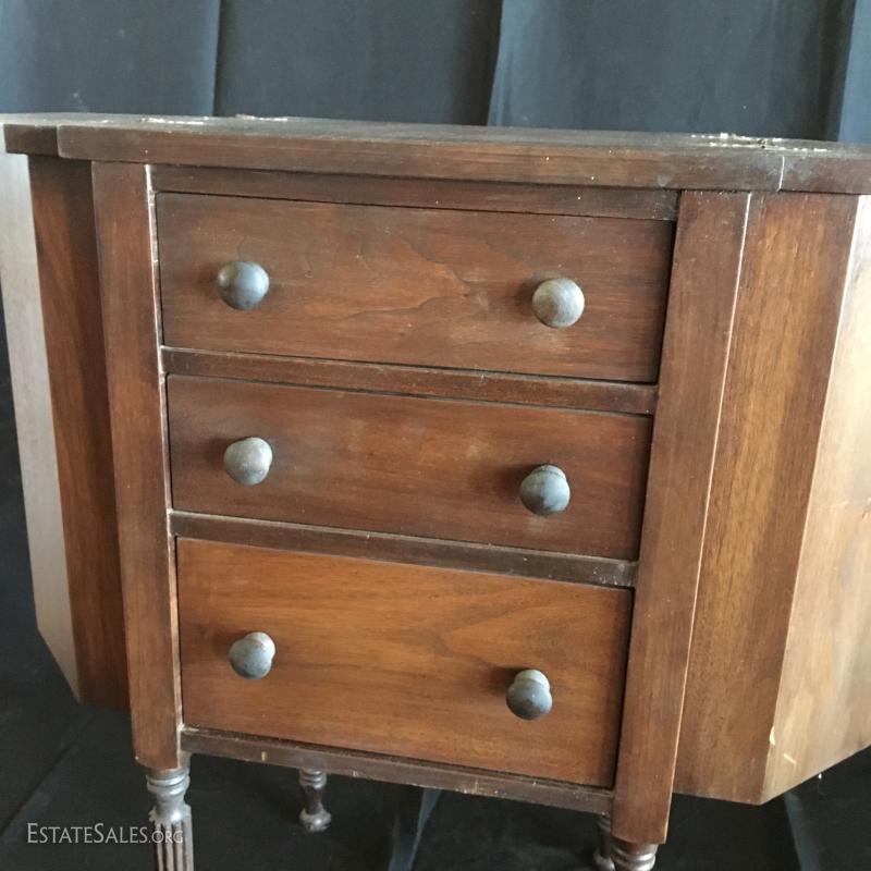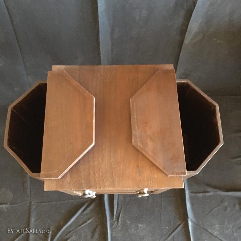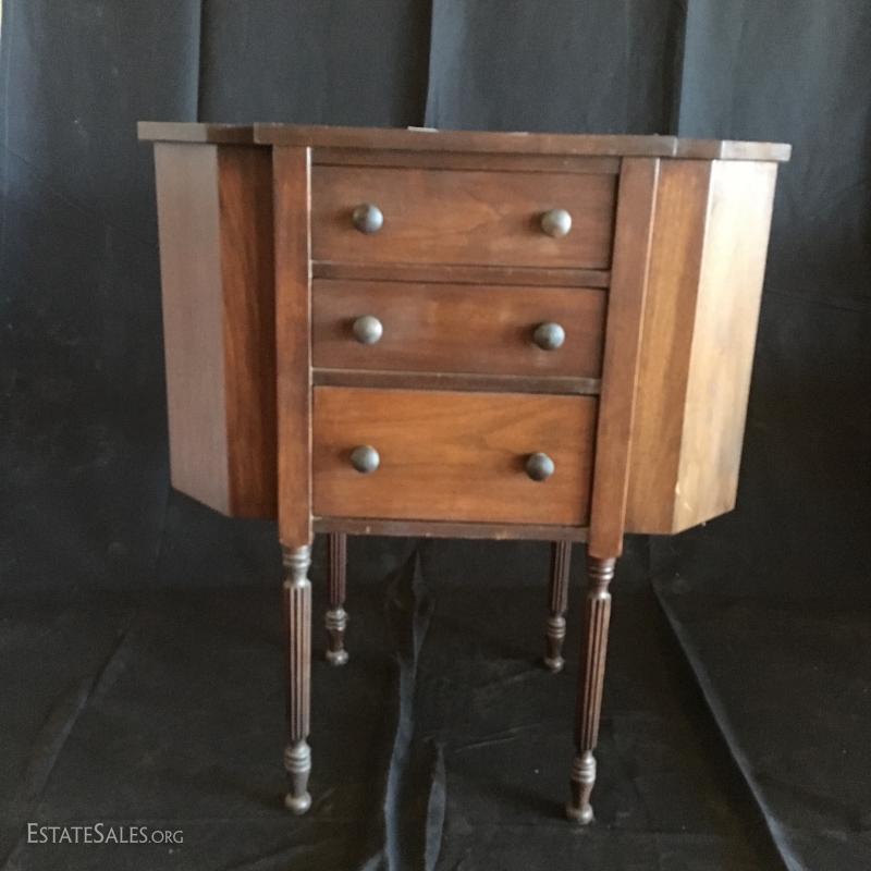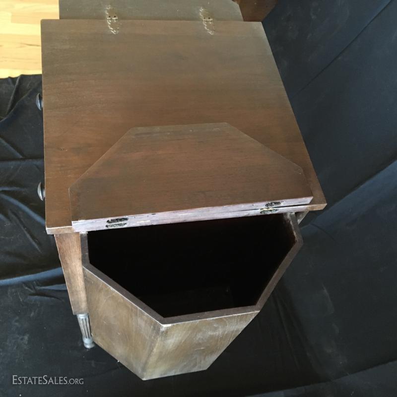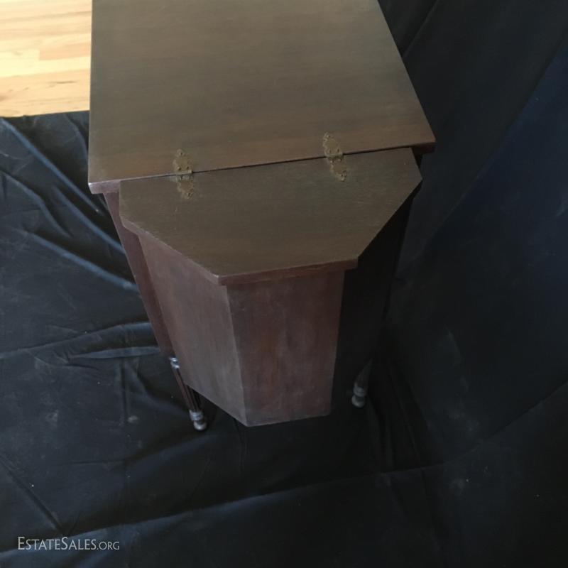 Small Wooden Table with three drawers and two side bins. Side top doors open to deep pocket. See photos. No manufacture marks. No Shipping - Local Pick up in Columbus, North Carolina 24.5"Lx14.5"wx27.5"H