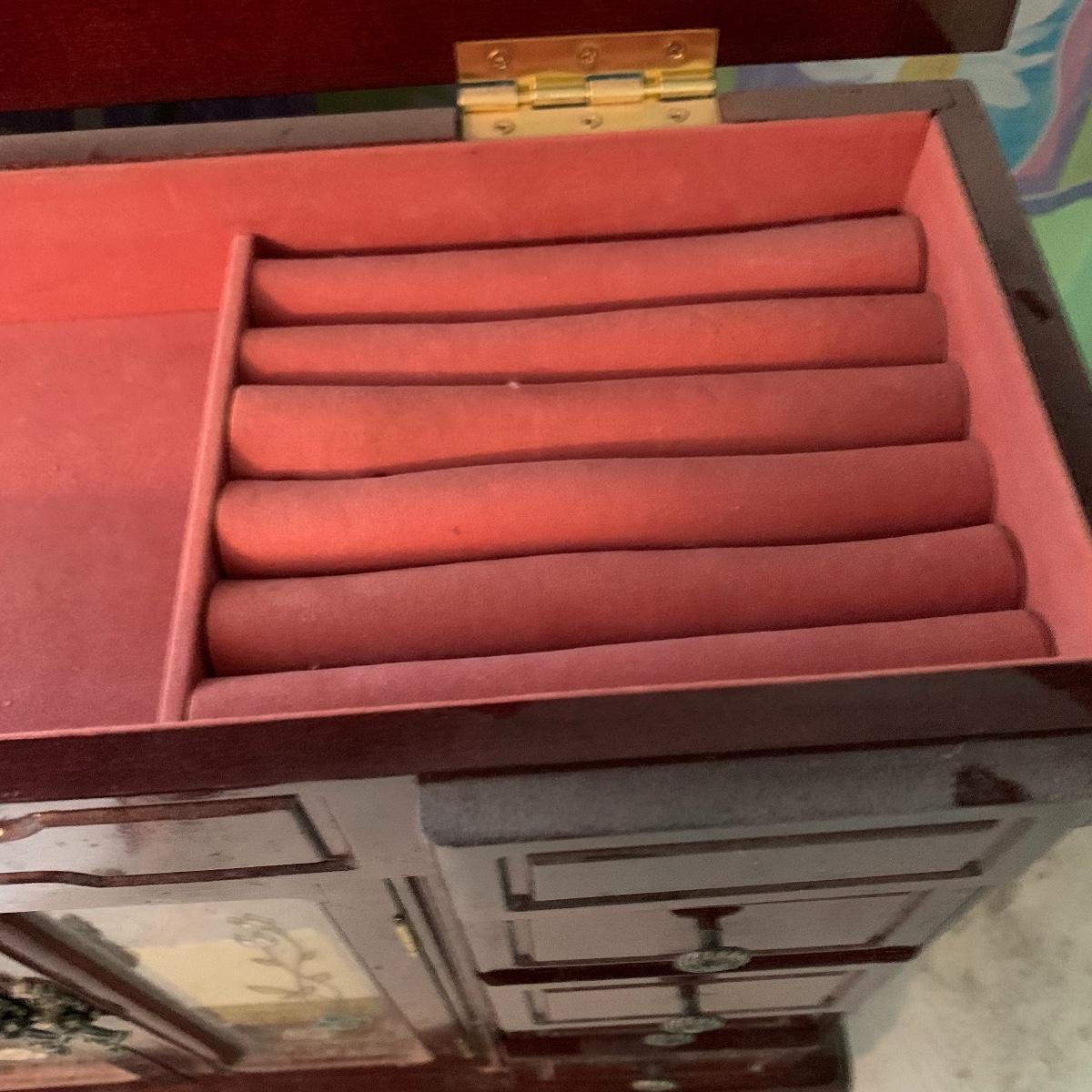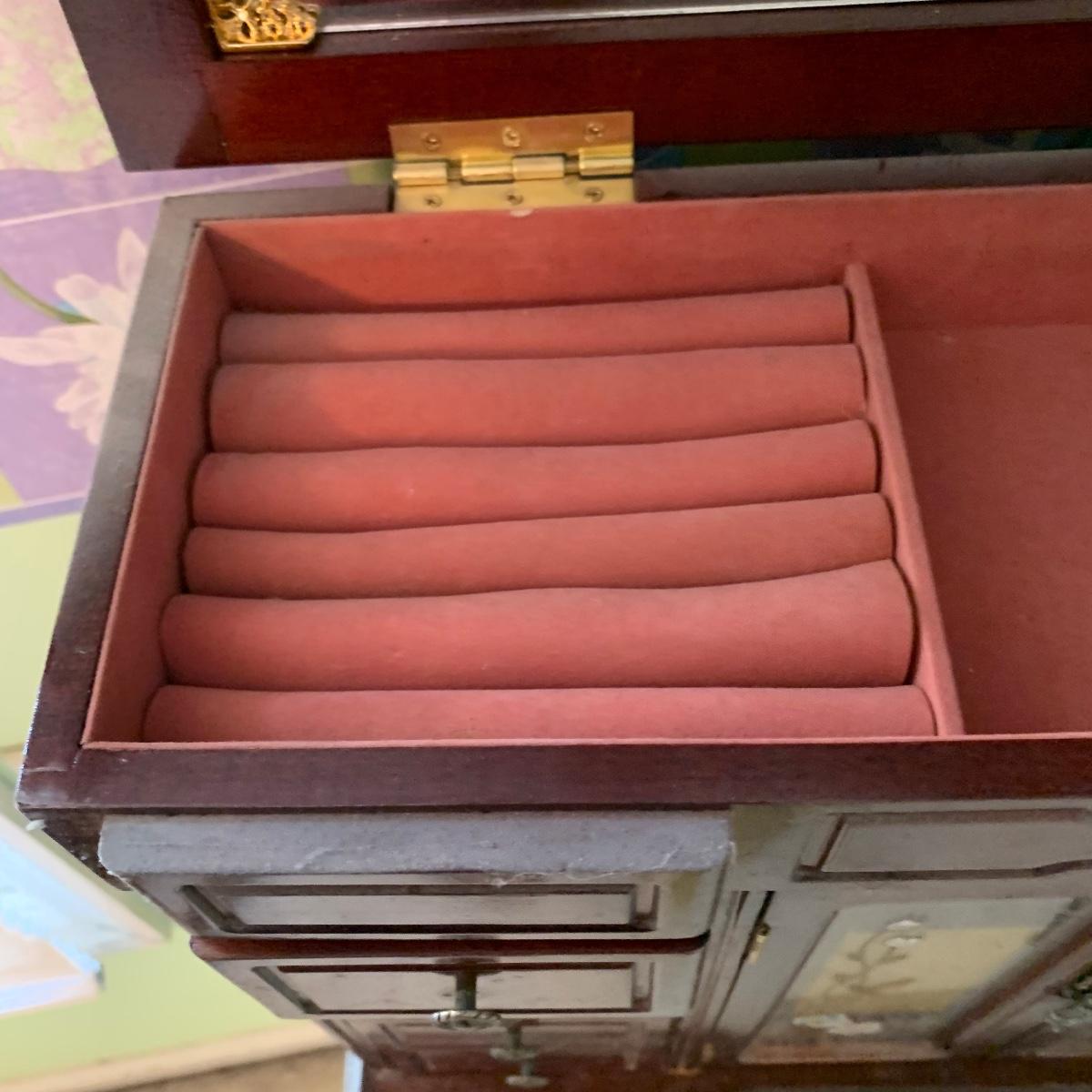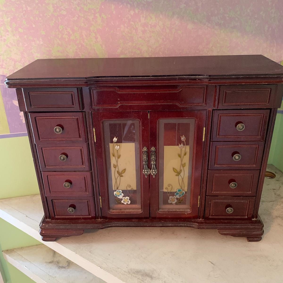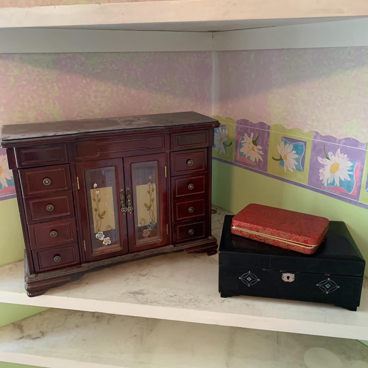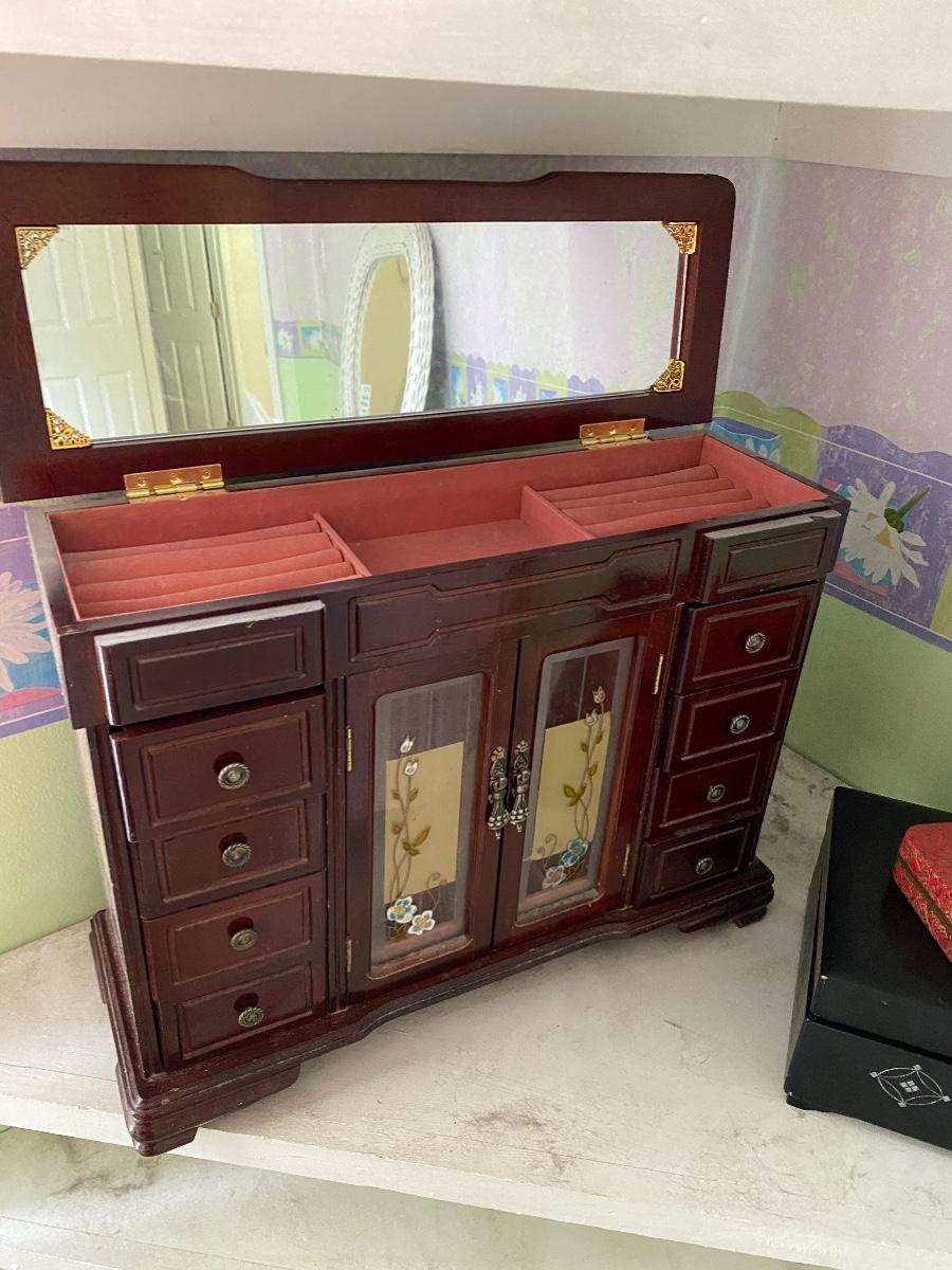 Need more jewelry storage? Here it is! The largest of the three has eight drawers, double doors on the front and storage in the top with a handy mirror. The second largest box boasts a handsome peacock motif and features storage, however this box needs new hinges. The smallest of the three has a red and gold design and has storage. This box has a stain on one side (see pic). Shipping available. 18" wide x 6" deep x 13" tall
