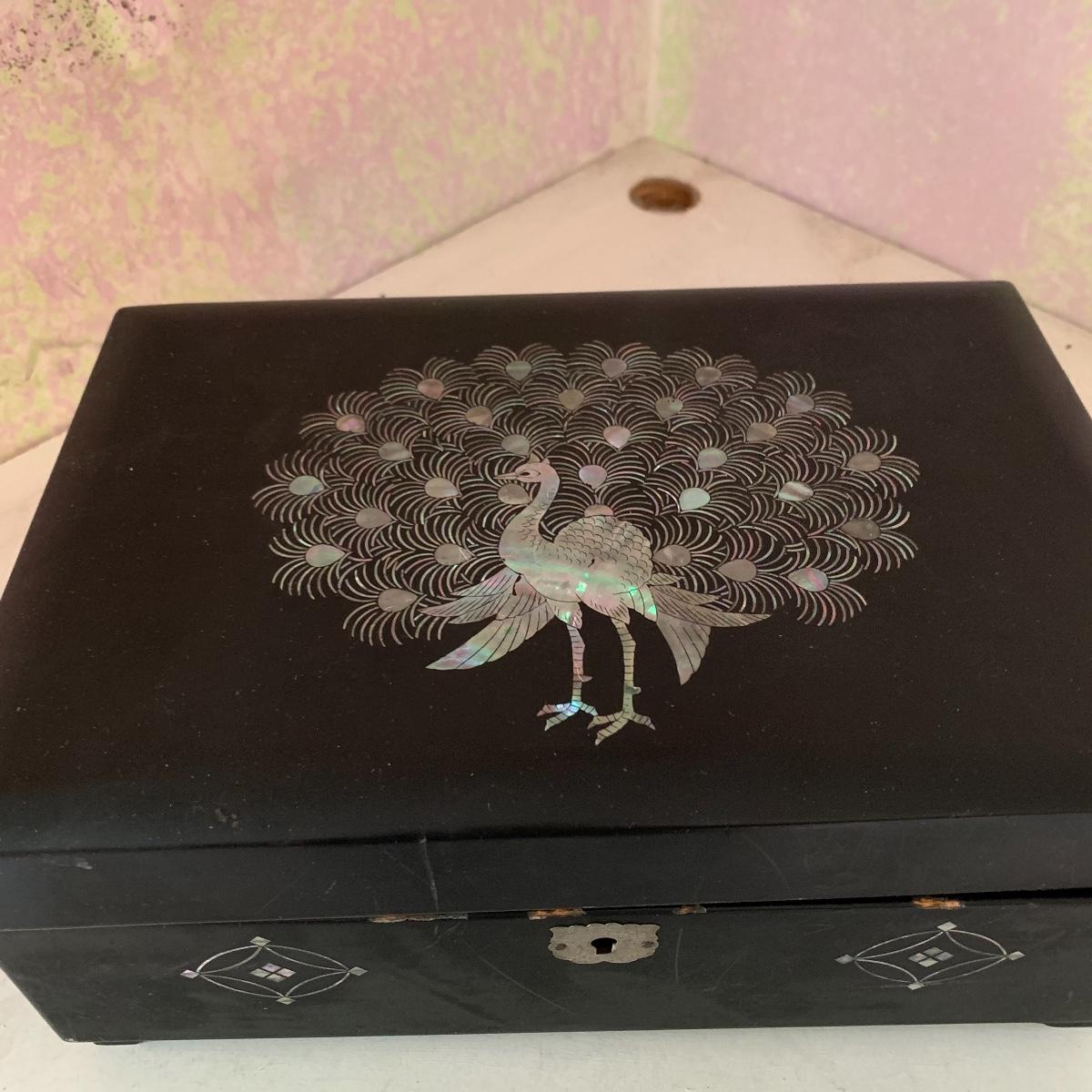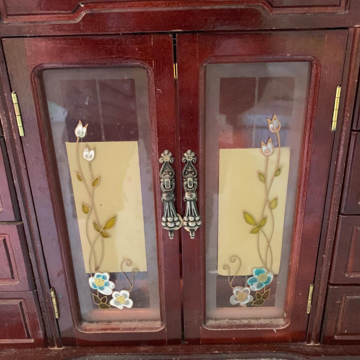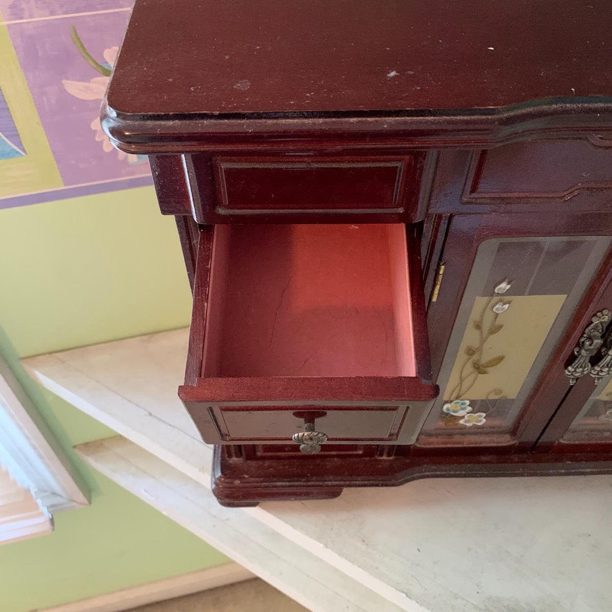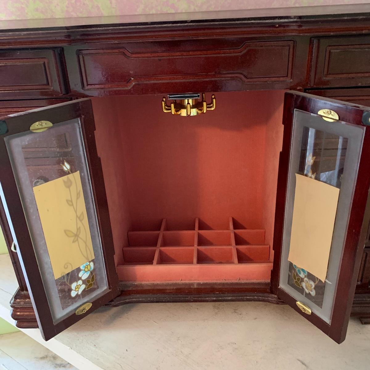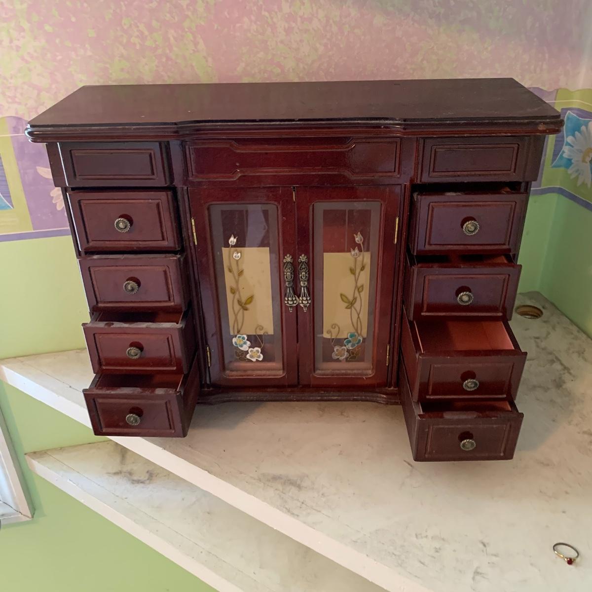 Need more jewelry storage? Here it is! The largest of the three has eight drawers, double doors on the front and storage in the top with a handy mirror. The second largest box boasts a handsome peacock motif and features storage, however this box needs new hinges. The smallest of the three has a red and gold design and has storage. This box has a stain on one side (see pic). Shipping available. 18" wide x 6" deep x 13" tall