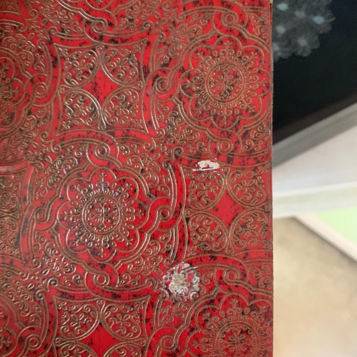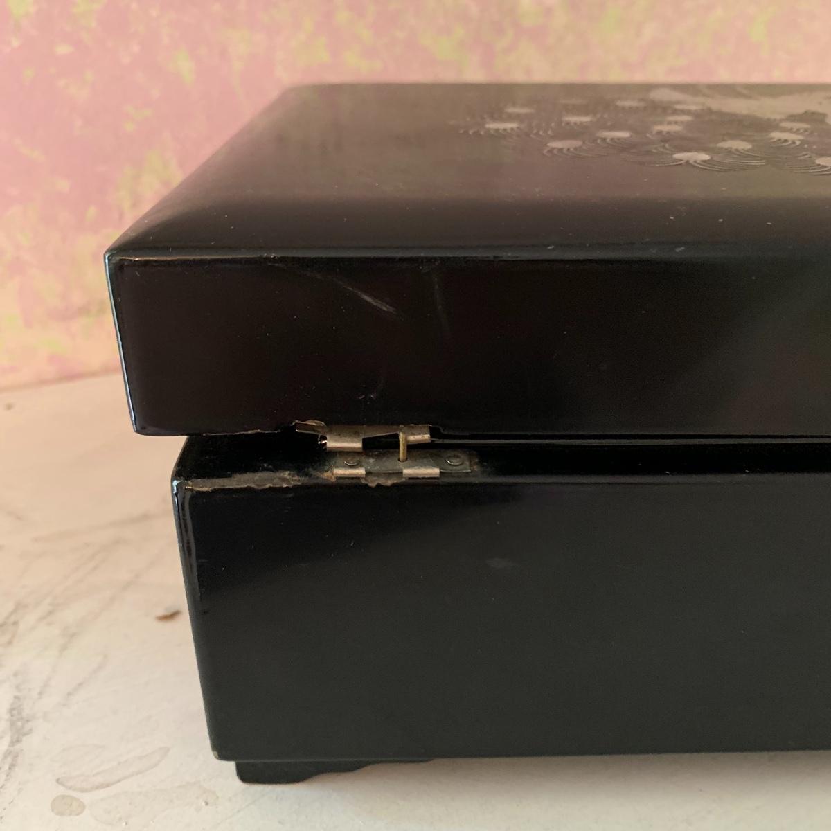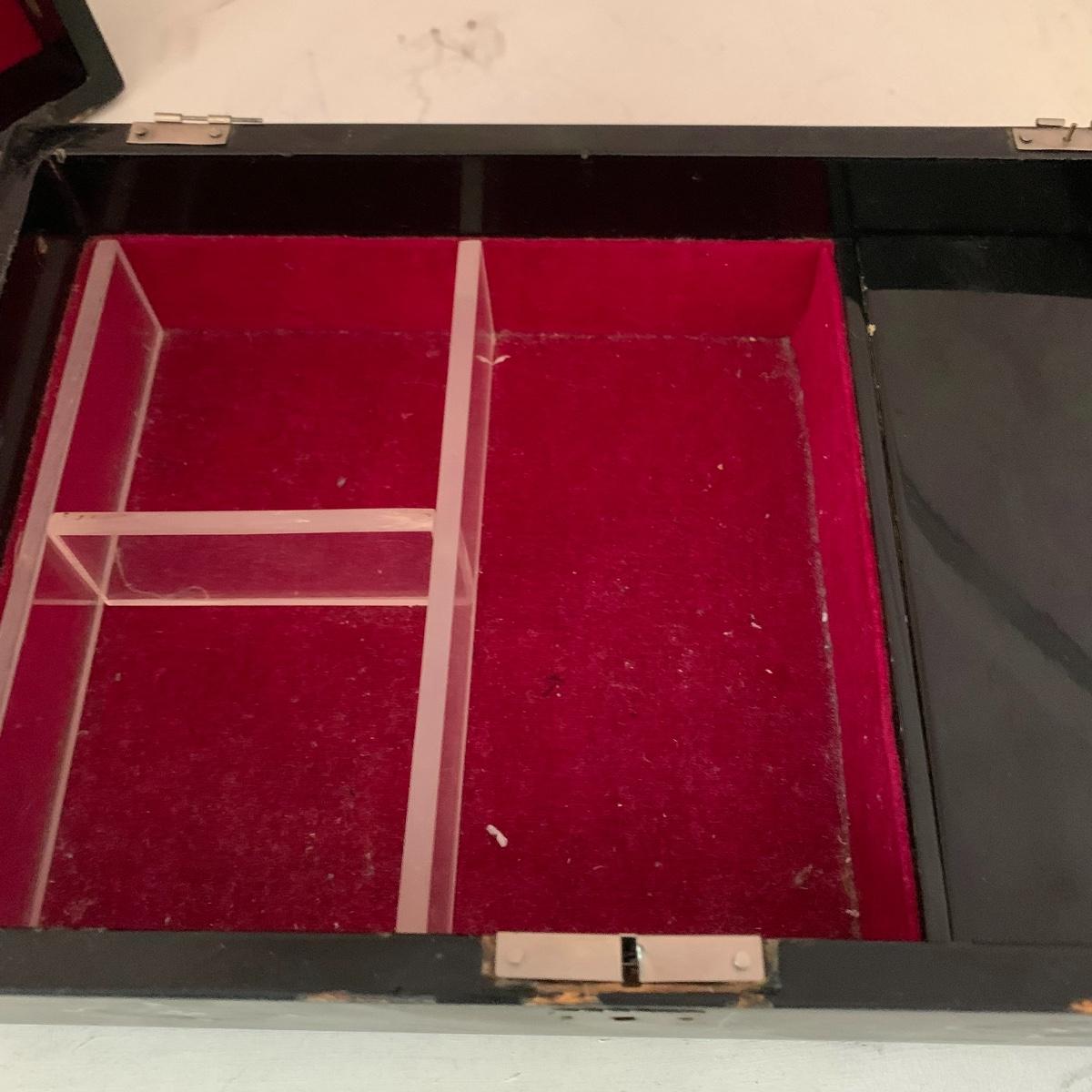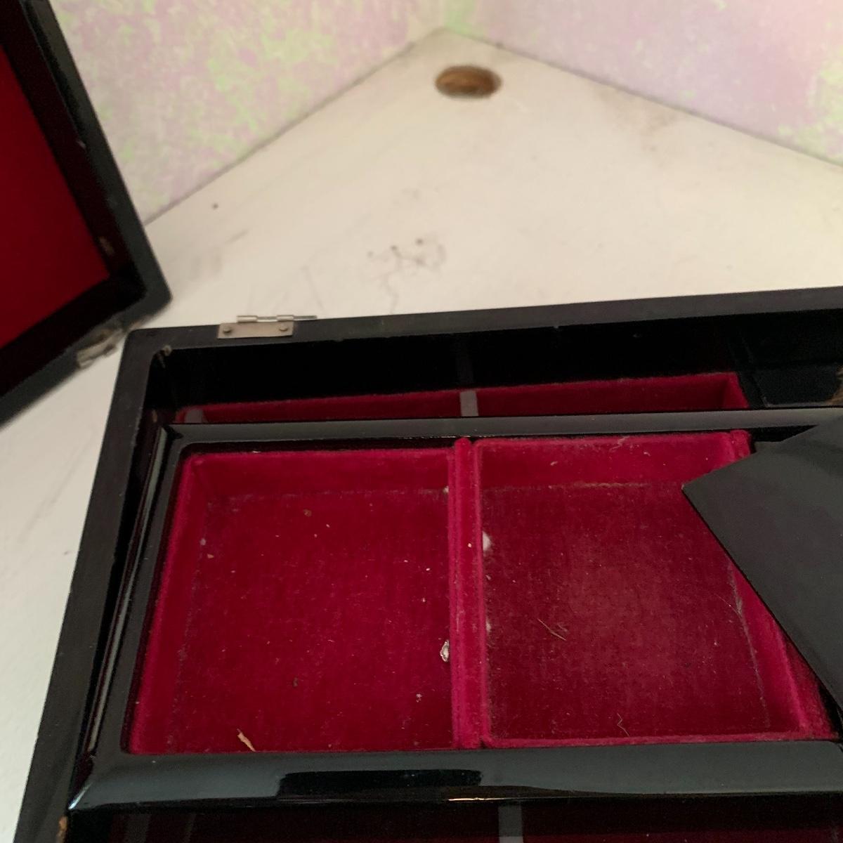 Need more jewelry storage? Here it is! The largest of the three has eight drawers, double doors on the front and storage in the top with a handy mirror. The second largest box boasts a handsome peacock motif and features storage, however this box needs new hinges. The smallest of the three has a red and gold design and has storage. This box has a stain on one side (see pic). Shipping available. 18" wide x 6" deep x 13" tall