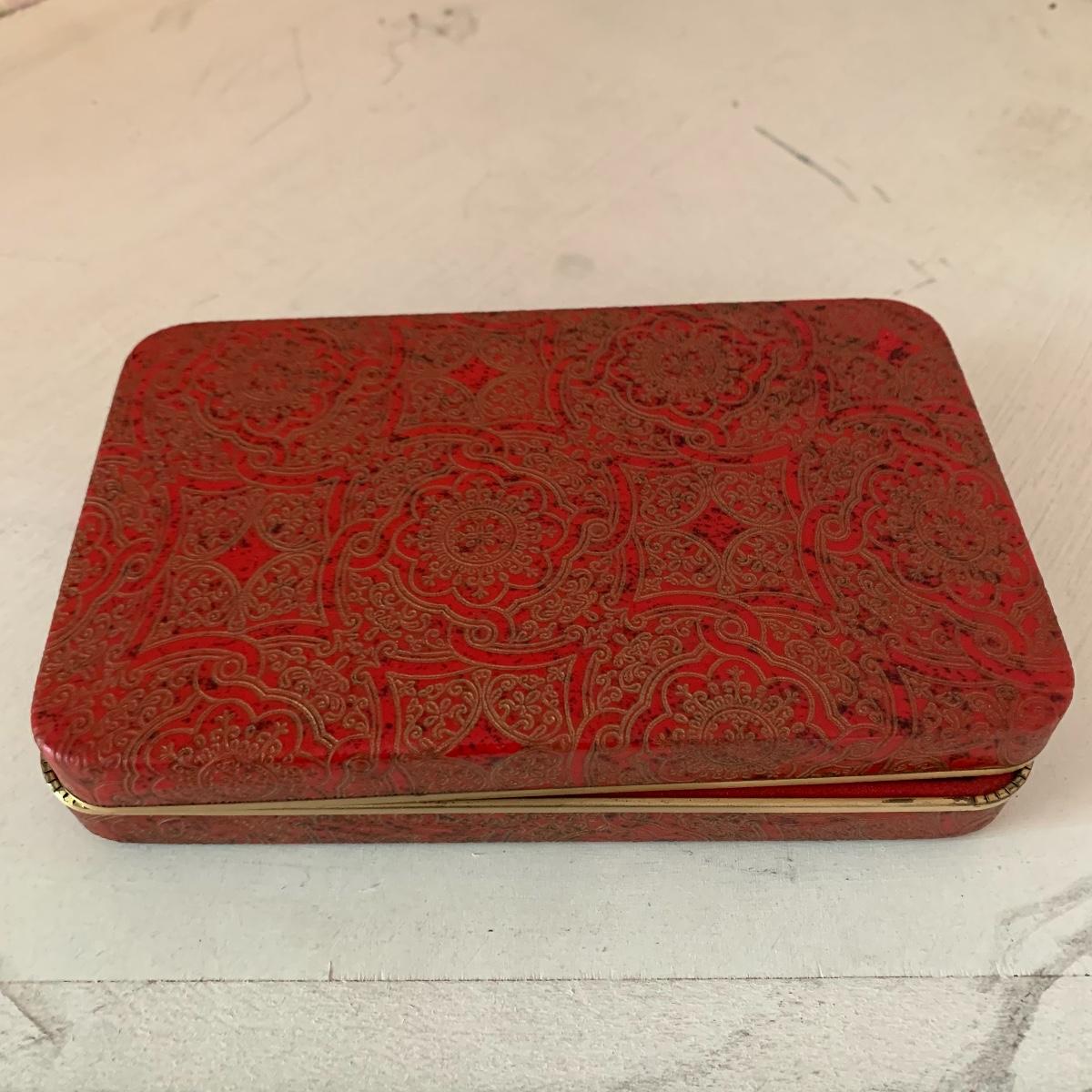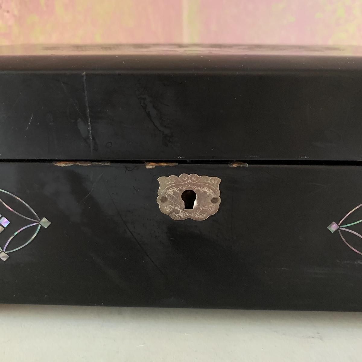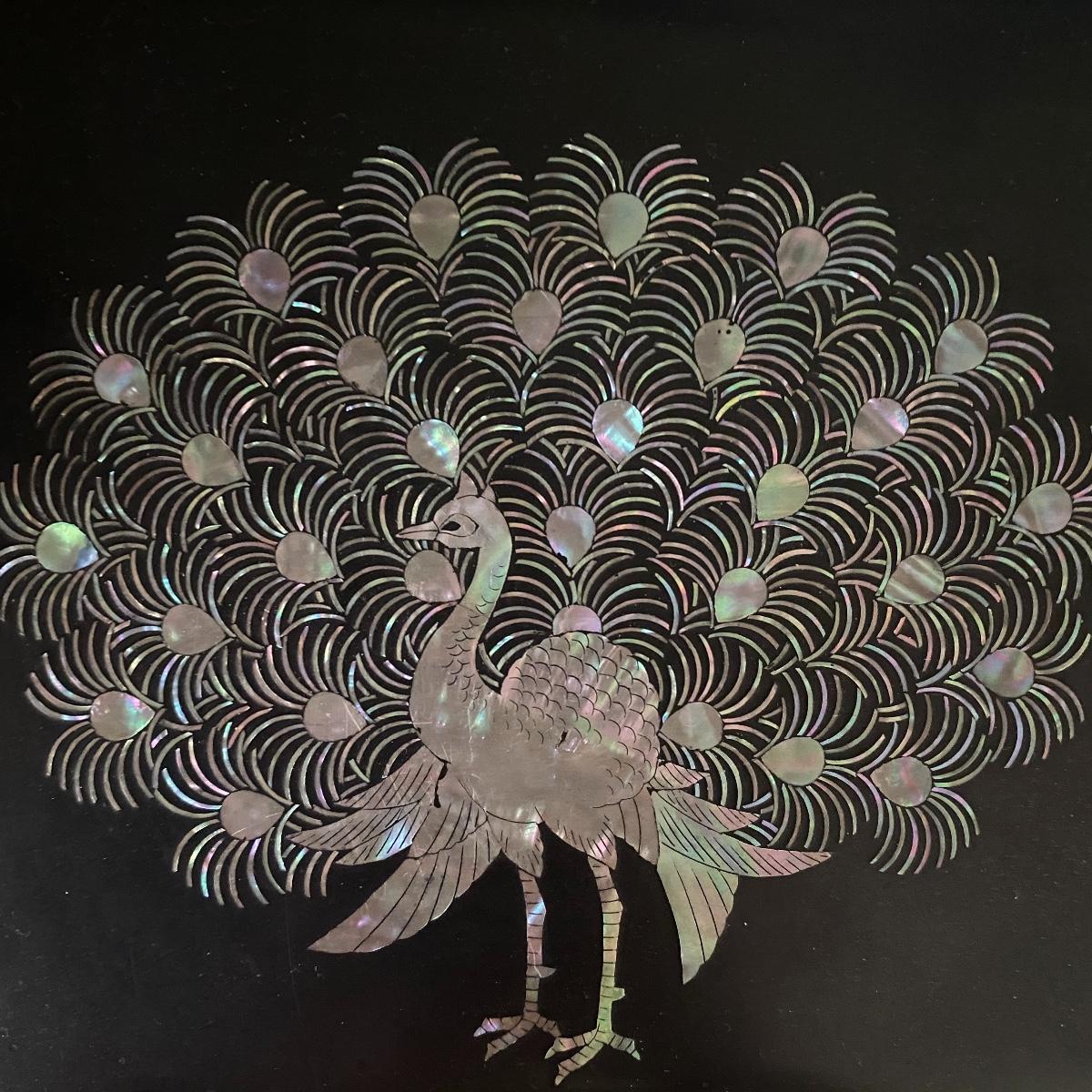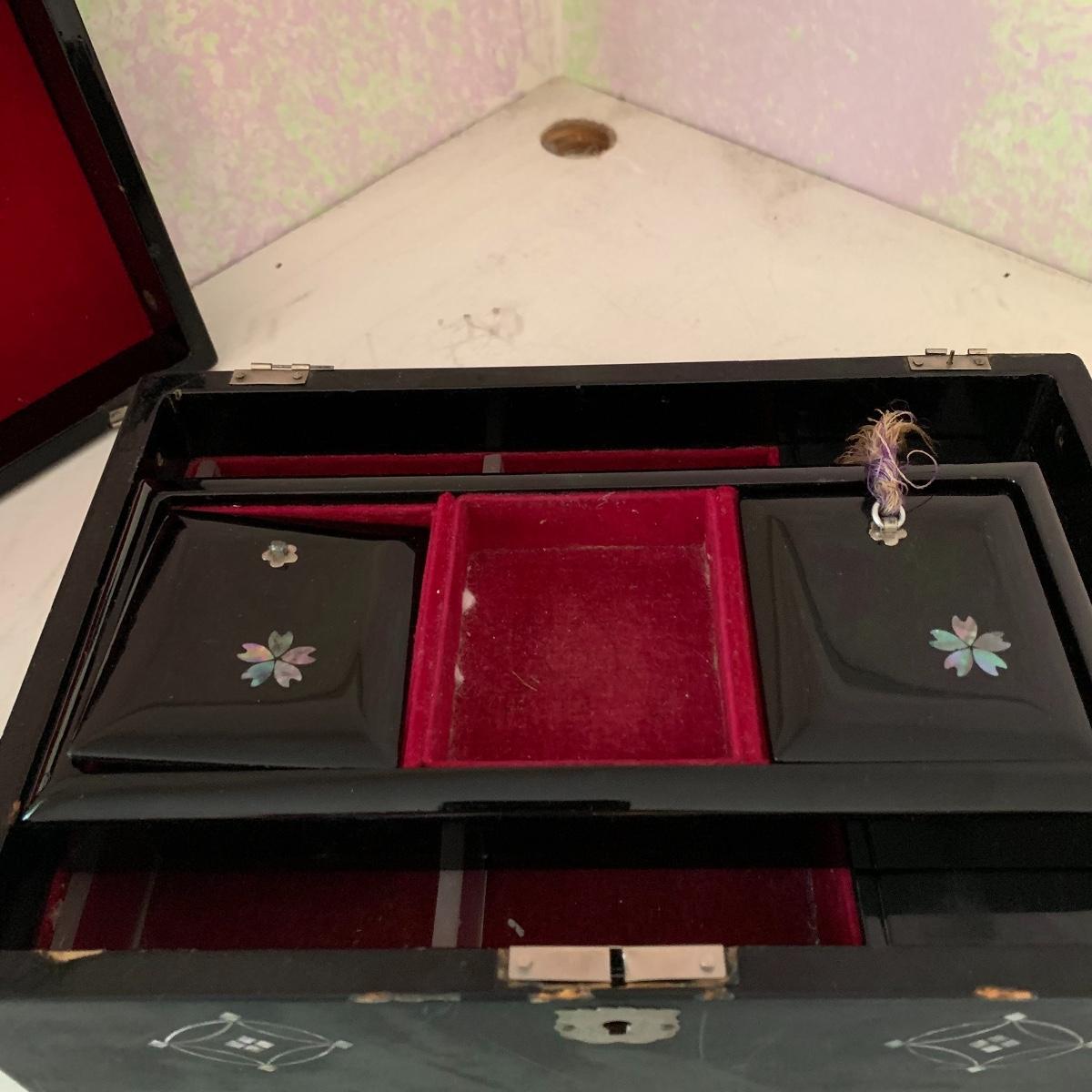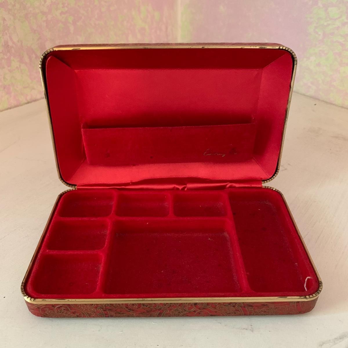 Need more jewelry storage? Here it is! The largest of the three has eight drawers, double doors on the front and storage in the top with a handy mirror. The second largest box boasts a handsome peacock motif and features storage, however this box needs new hinges. The smallest of the three has a red and gold design and has storage. This box has a stain on one side (see pic). Shipping available. 18" wide x 6" deep x 13" tall