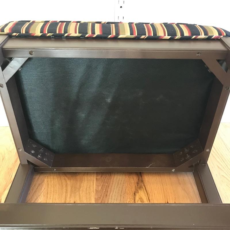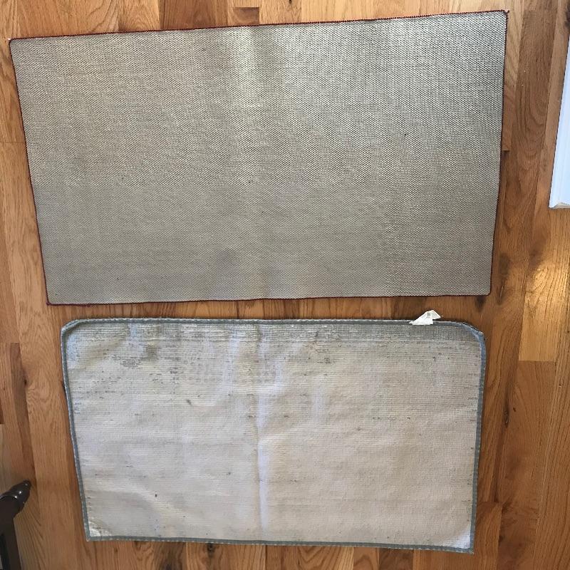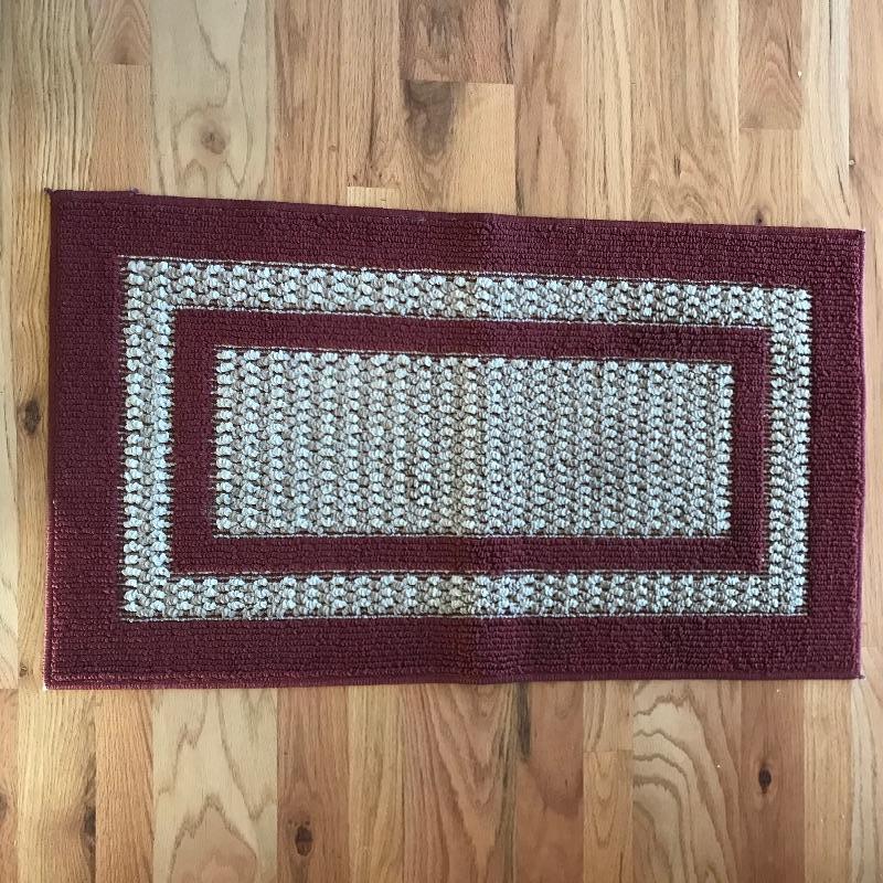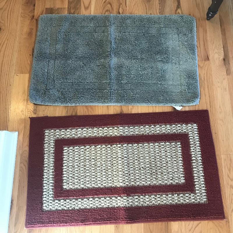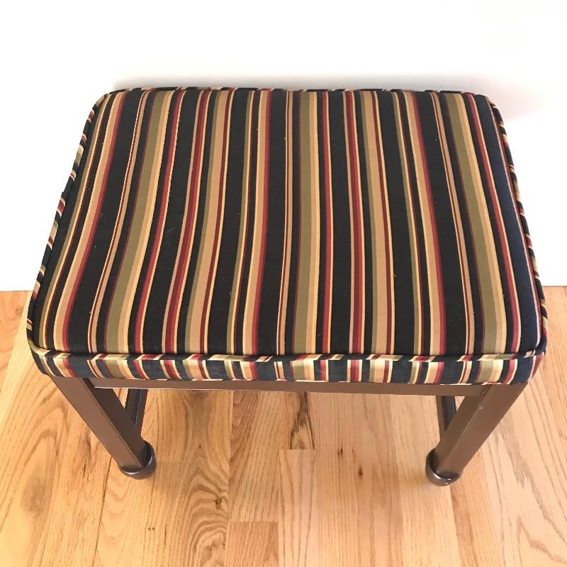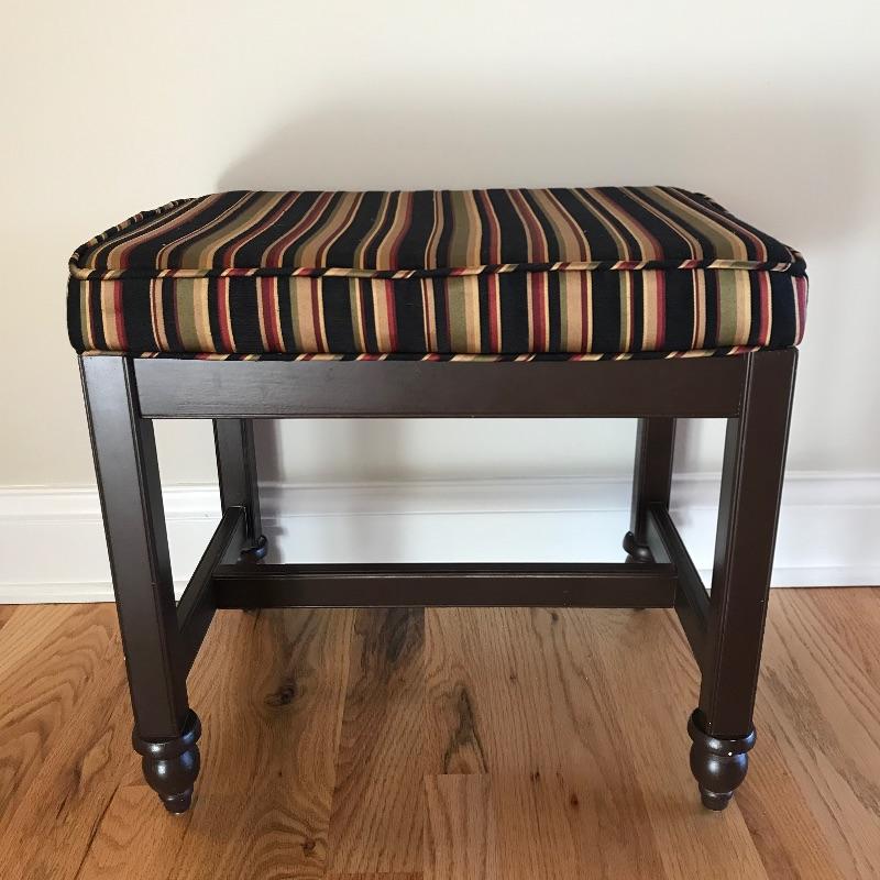 Cool striped dark stool perfect for a vanity seat measuring 19” x 15” x 18”. Paired with the stool are two non-slip rugs. The maroon rug is about 35.5” x 20.25”. The blue-gray rug is slightly smaller and shows a little wear, just on the underside. See photos. No shipping.