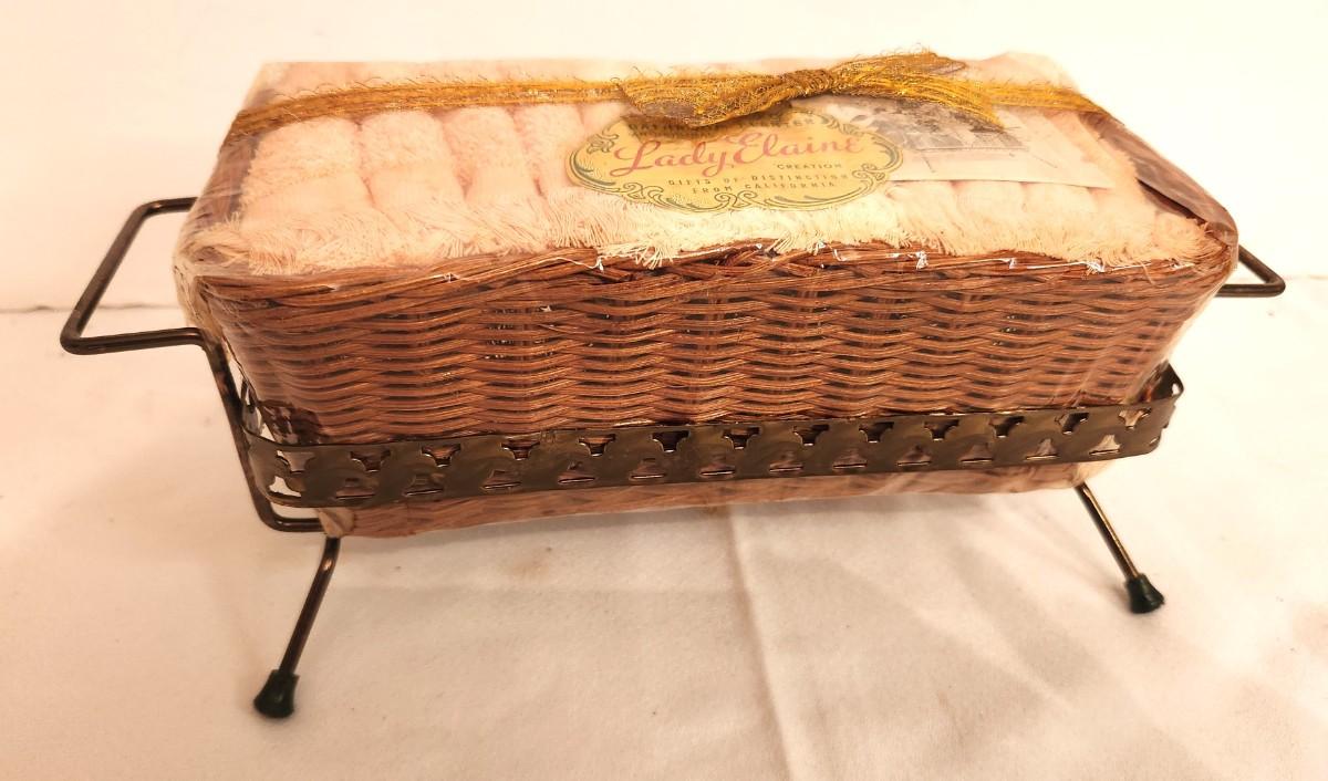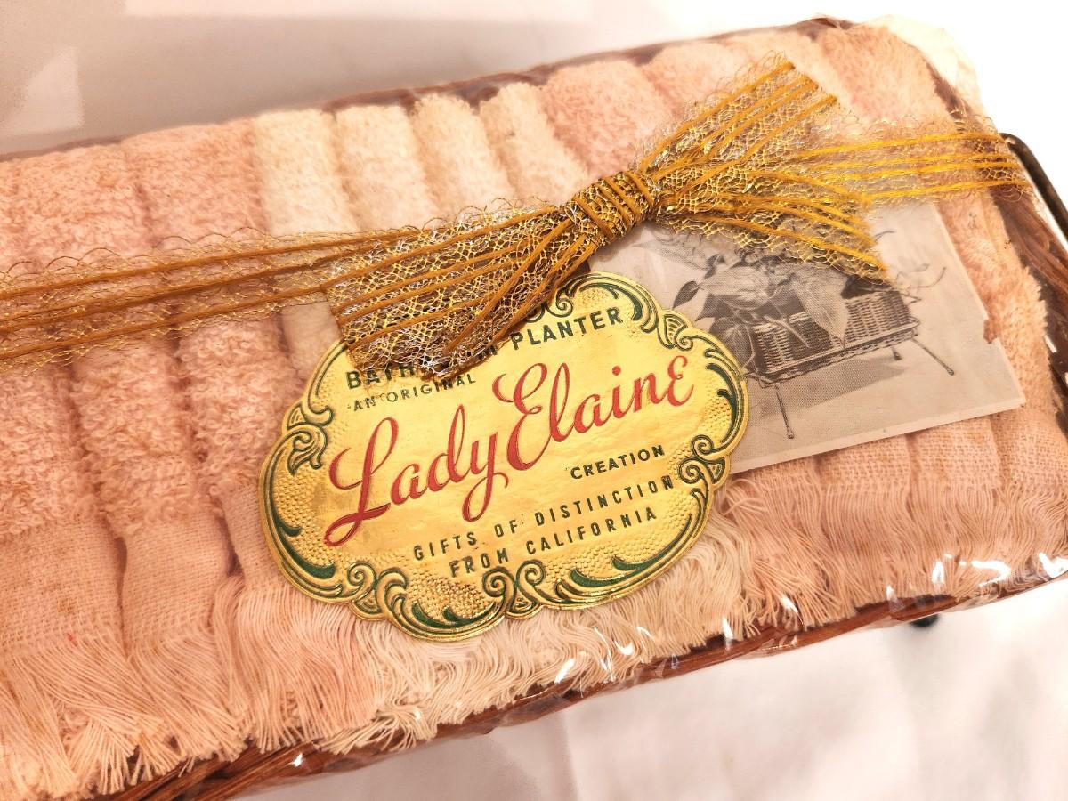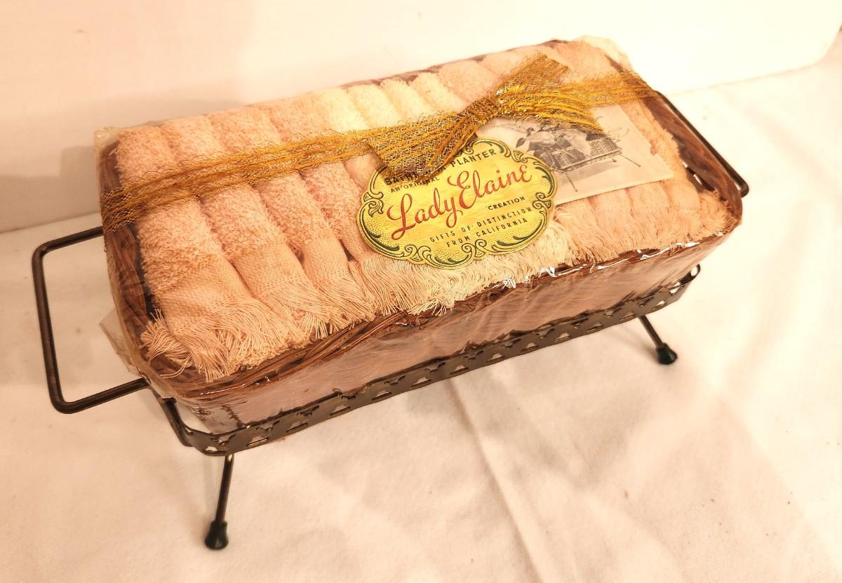 Blast from the Past Lady Elaine Bathroom planter with 12 pink/white face cloths - new old stock in original packaging - so Mid Century. 12" long, 4.5" tall.