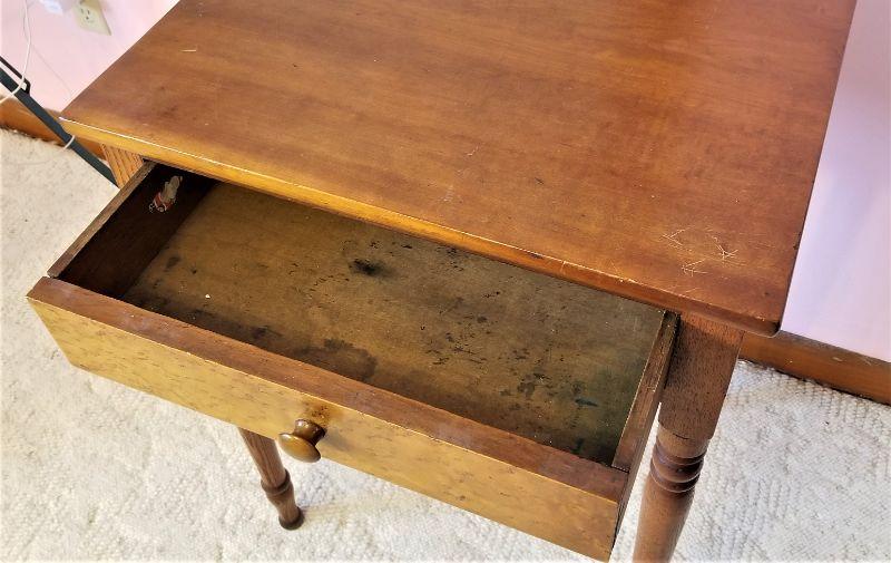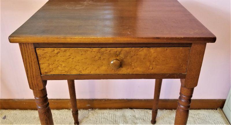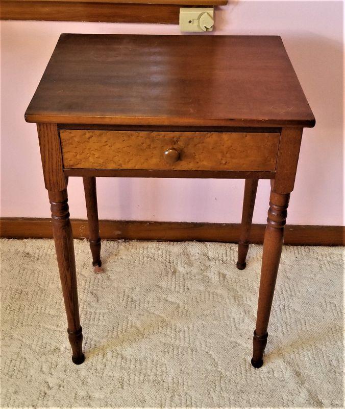 Nice vintage maple table with drawer - dove-tailed drawer construction. No maker named. Measures 21.5" x 17.25 " - 29.5" tall. Drawer front looks like bird's eye maple. Solid wood.
