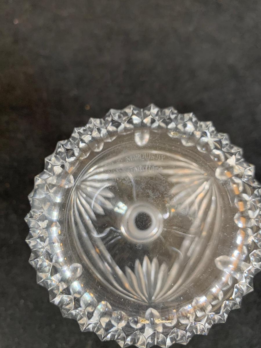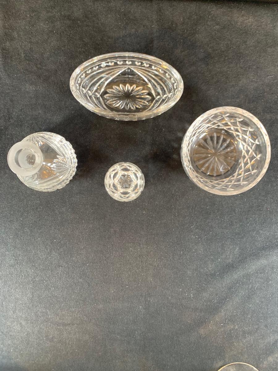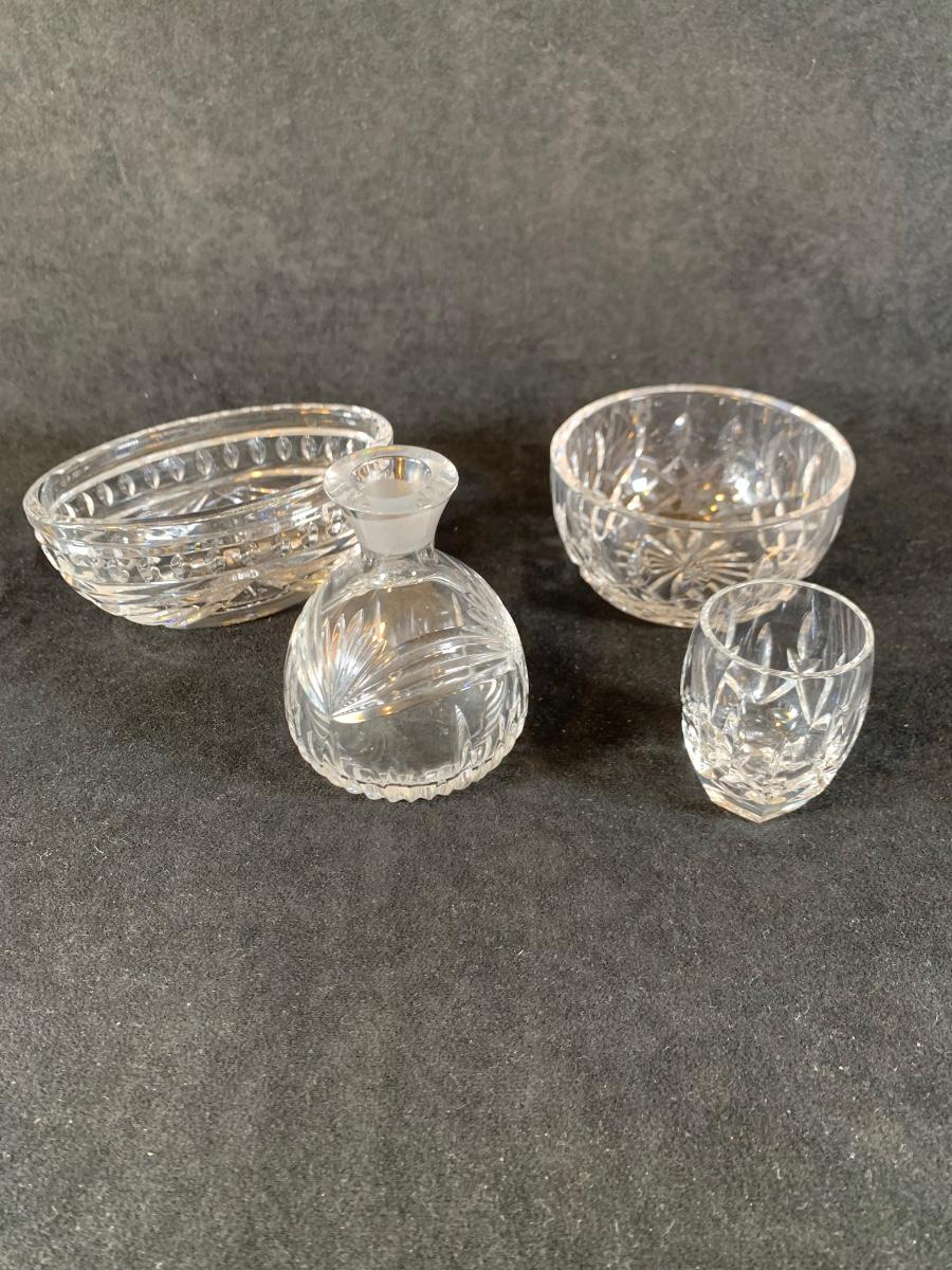 Lot includes Waterford Crystal small oval dish, small round dish, shot glass and Marquis by Waterford Crystal Perfume Bottle. Perfume bottle is missing the stopper.