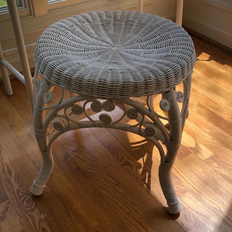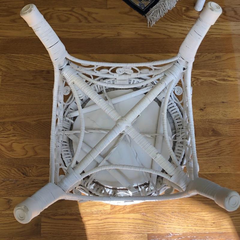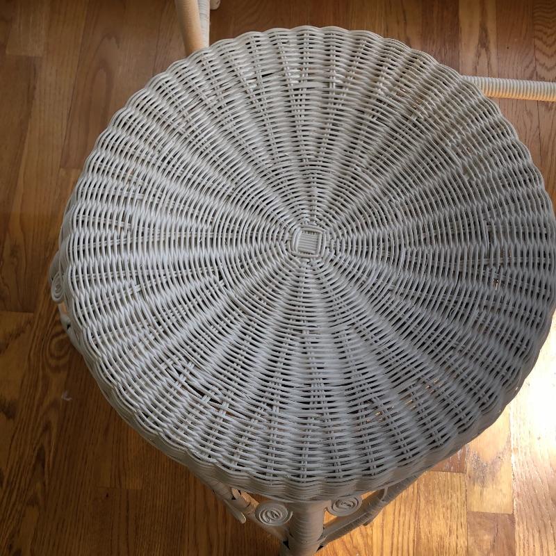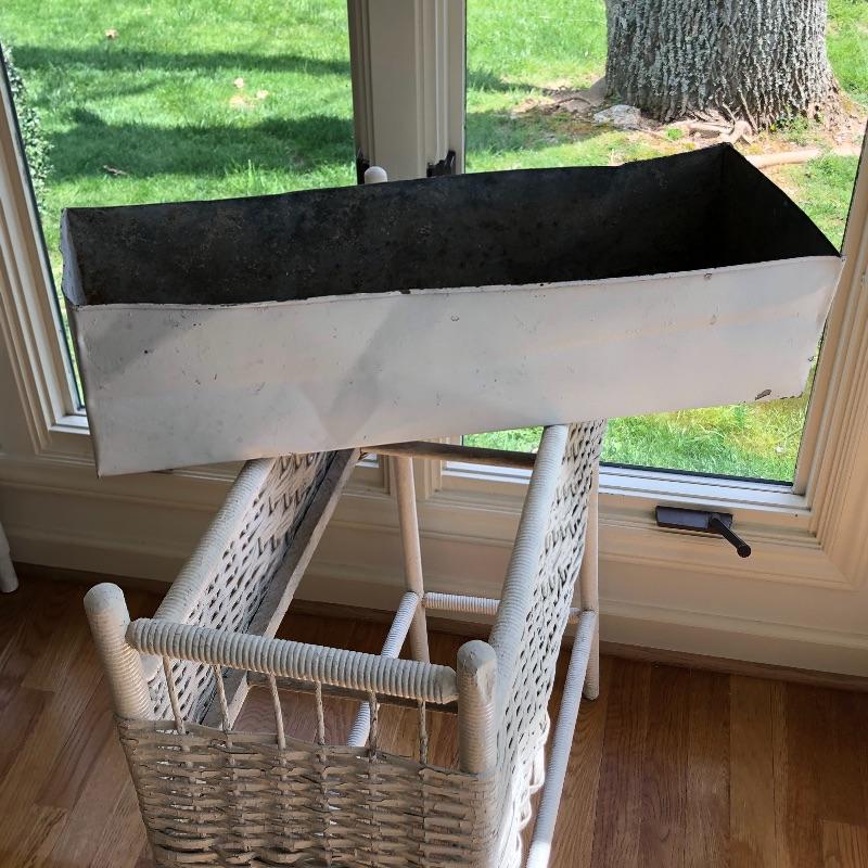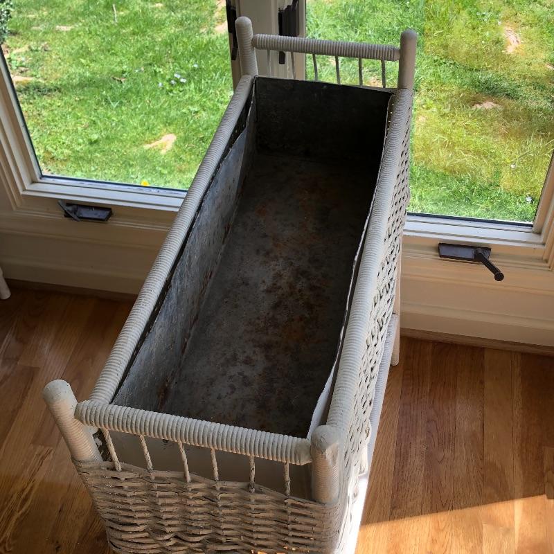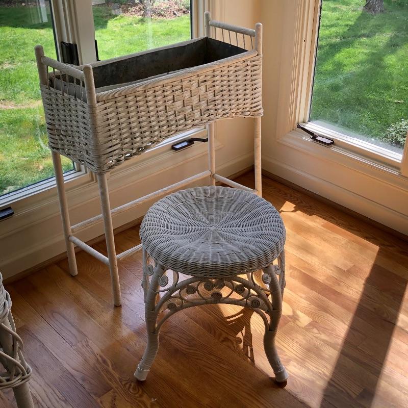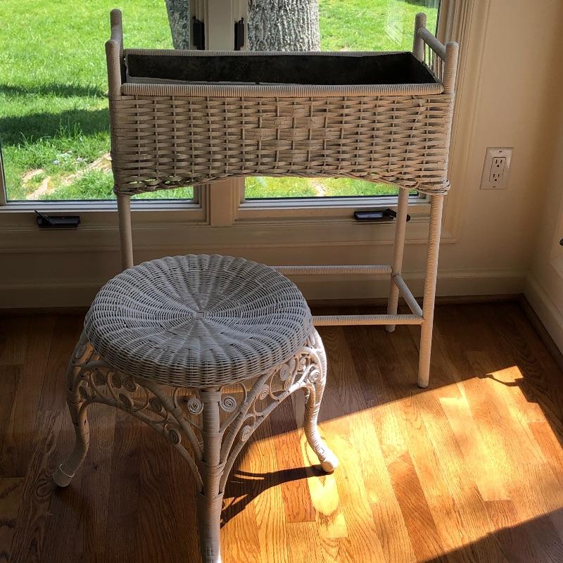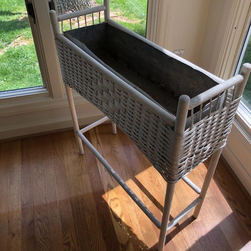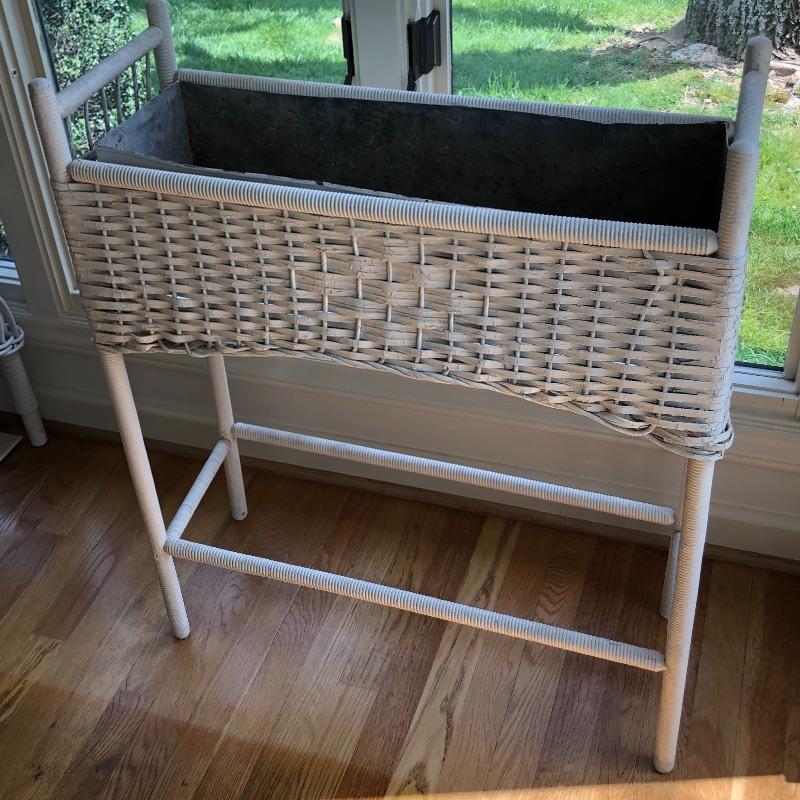 This wicker duo are white wicker plant stands. The taller piece measures 10” deep x 27” wide x 29” tall with a 6” deep metal liner.
