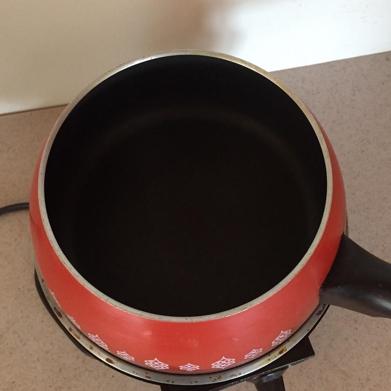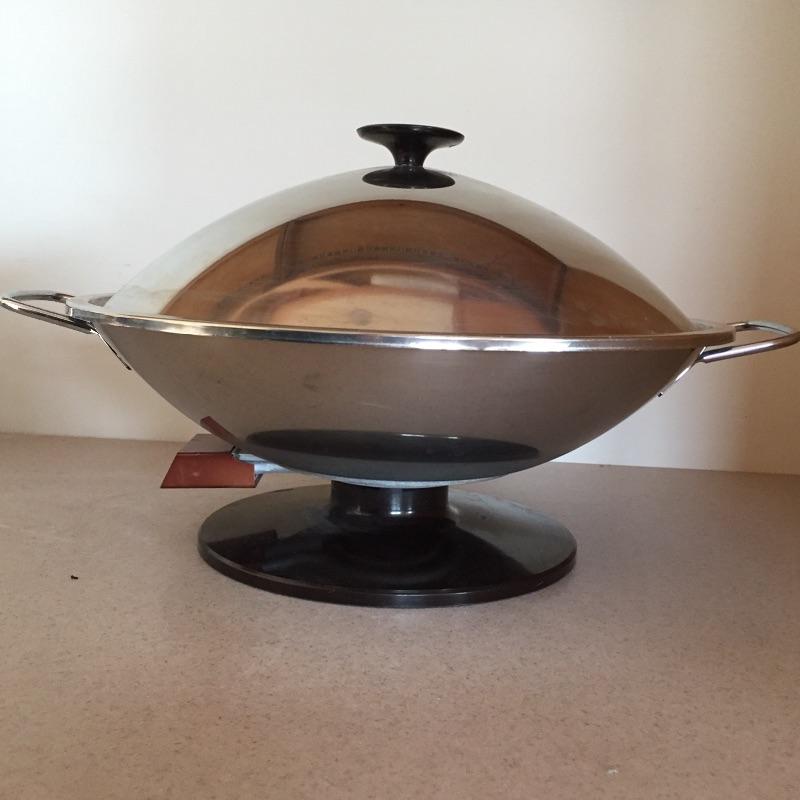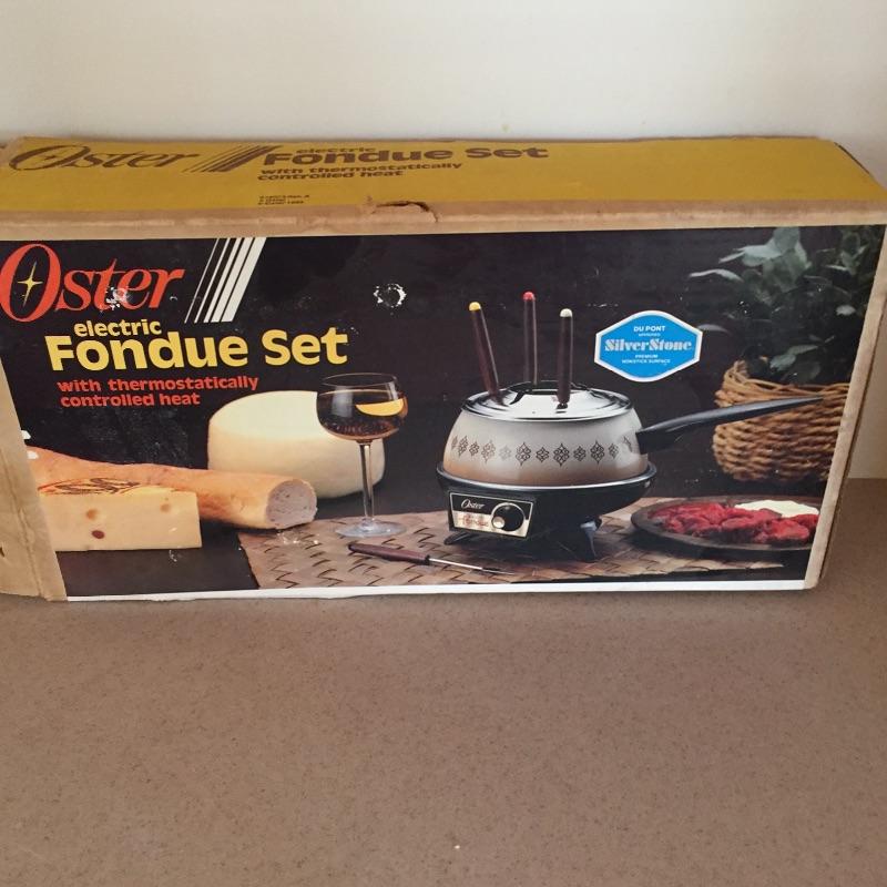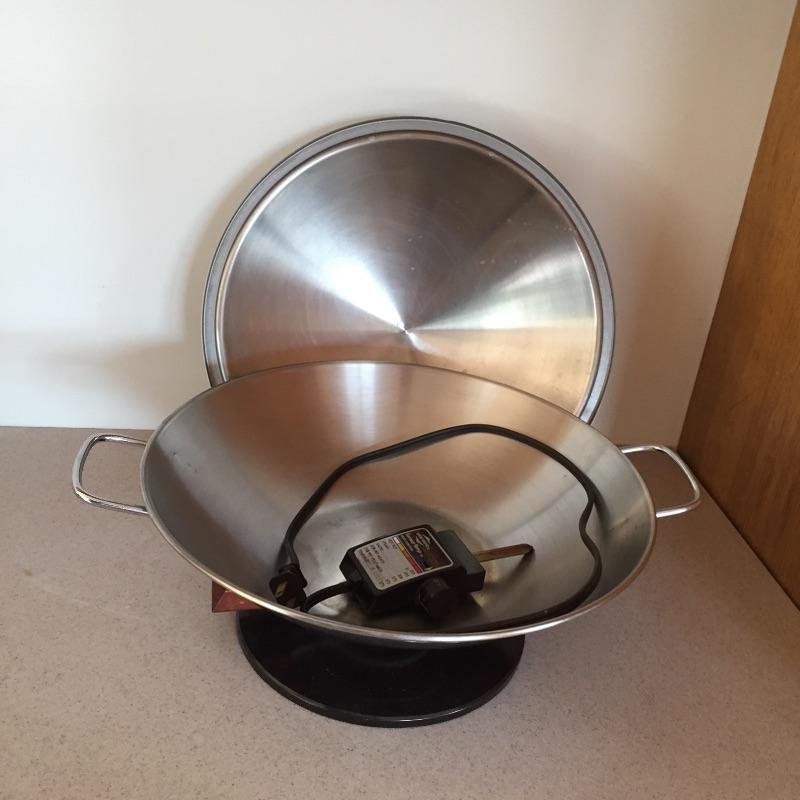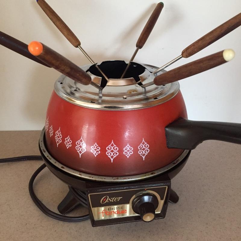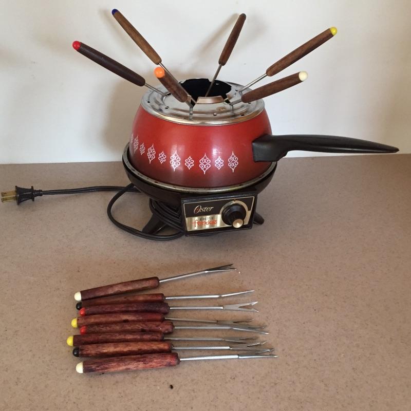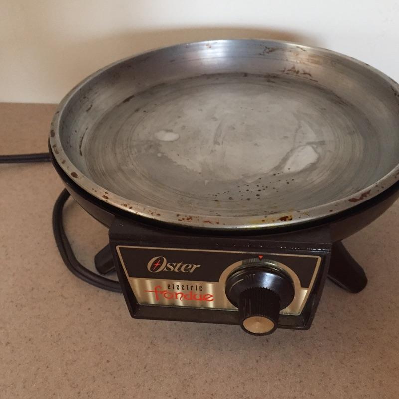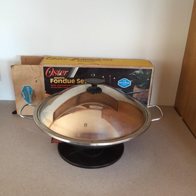 Electric wok and electric fondue set. Oster Electric Fondue set makes heating a cinch. Wok is by West Bend. Have not tested these pieces for functionality. These appliances are made for a good time with friends!