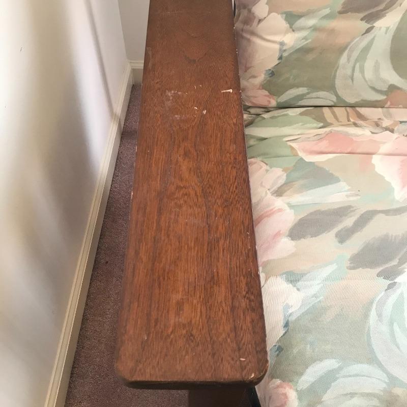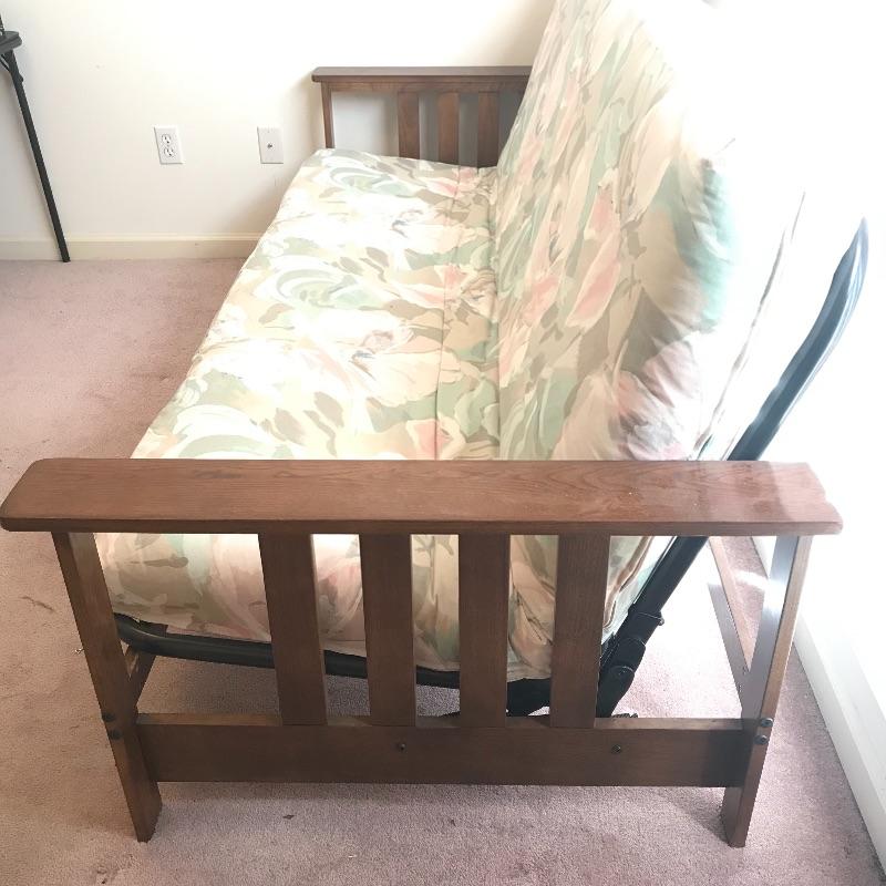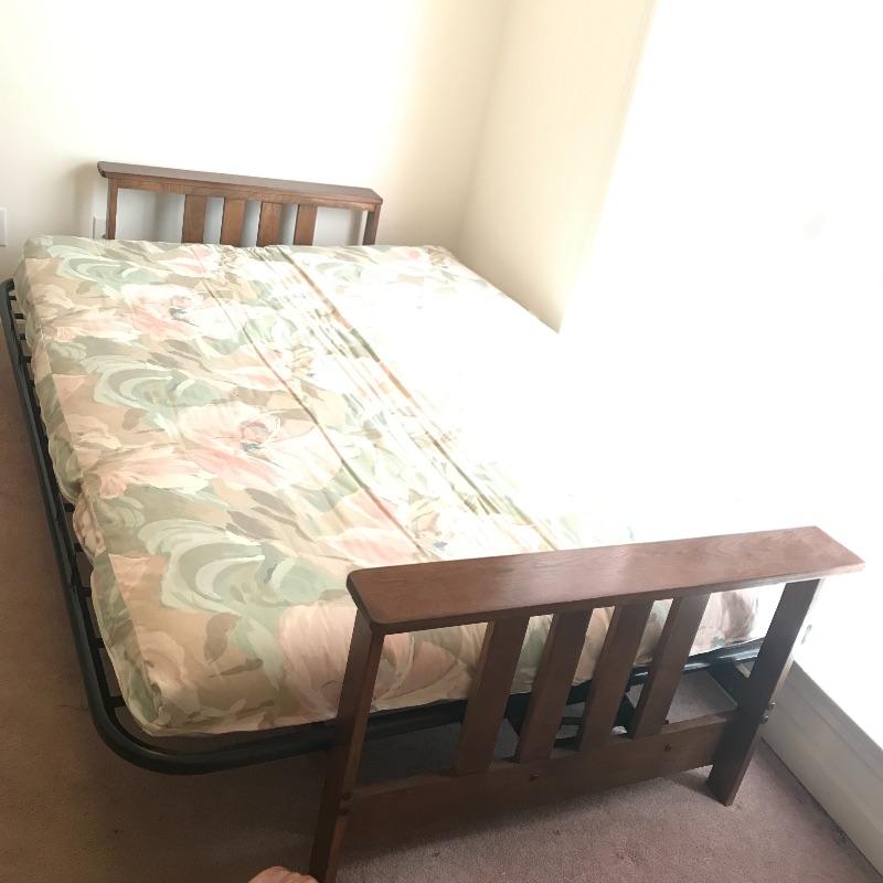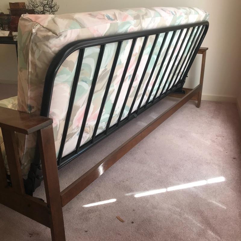 Perfect for a guest room or small area. This futon has a wooden outer frame with a metal mattress frame the measures 54” x 72”. The mattress fits the frame perfectly with delicate colors and a zipper to remove cover. You can easily change the cover for a new look. This futon appears sturdy, but frame shifts slightly when moving. Wood is in great shape with some minimal wear noted in photos. No shipping.