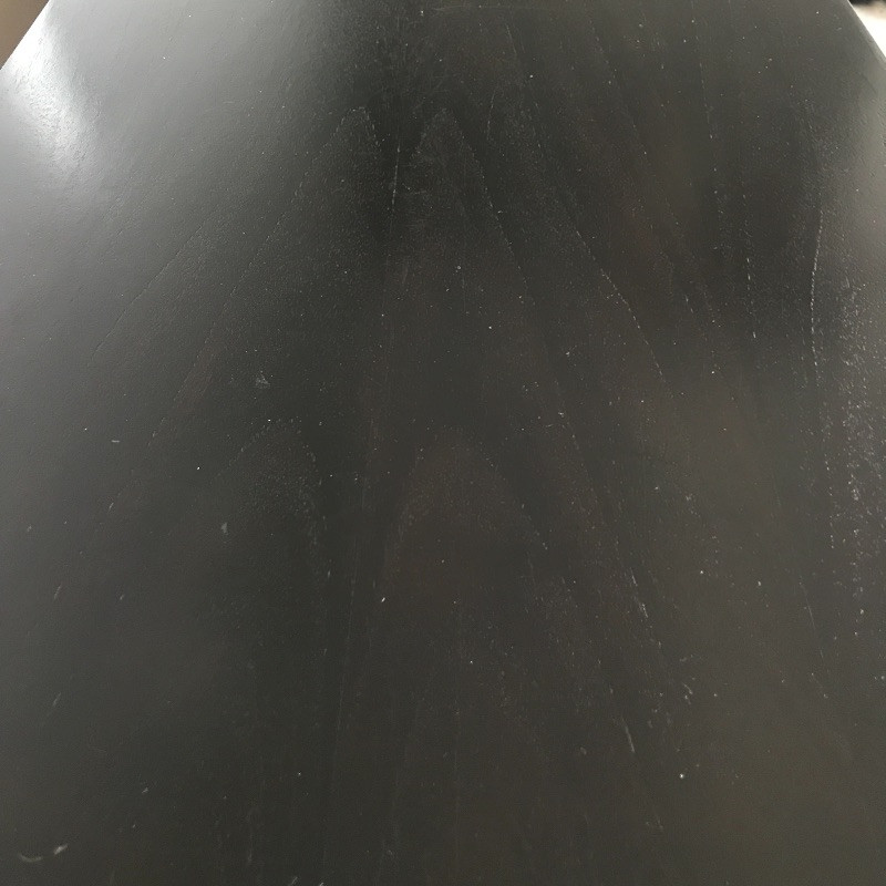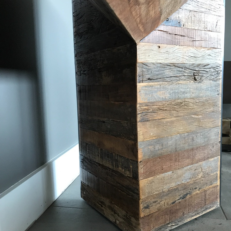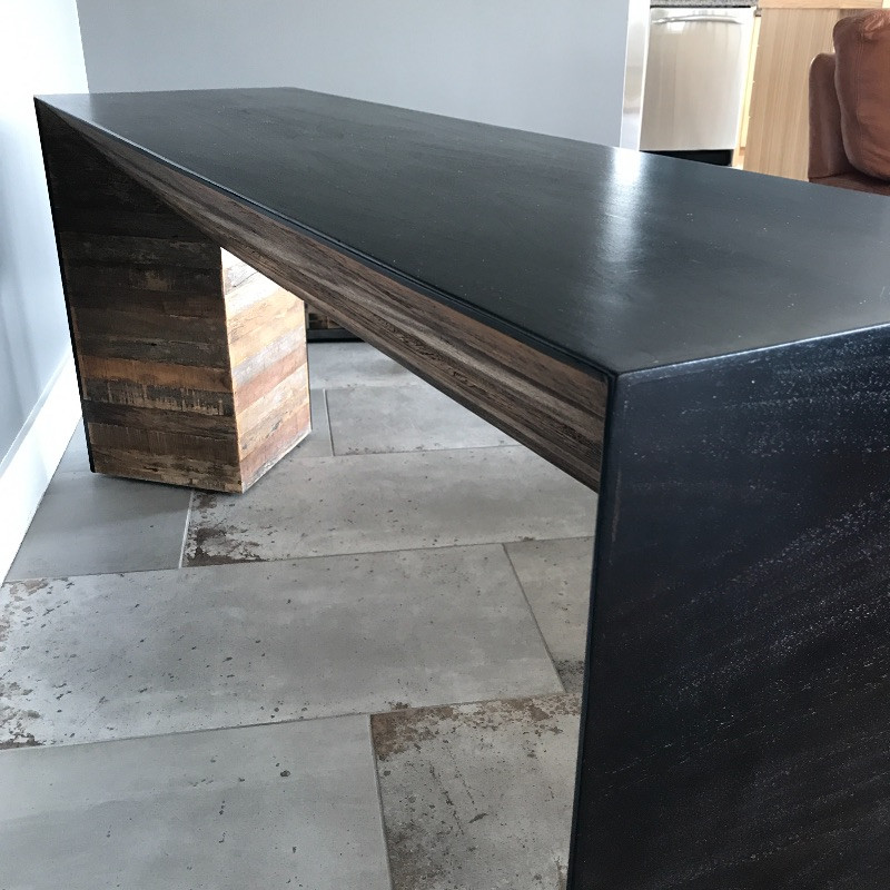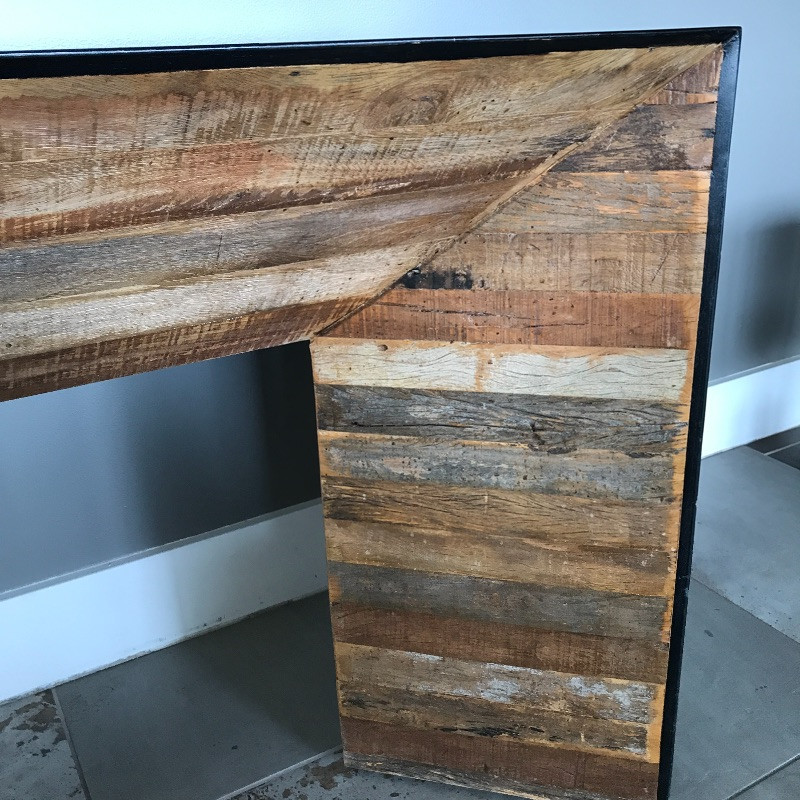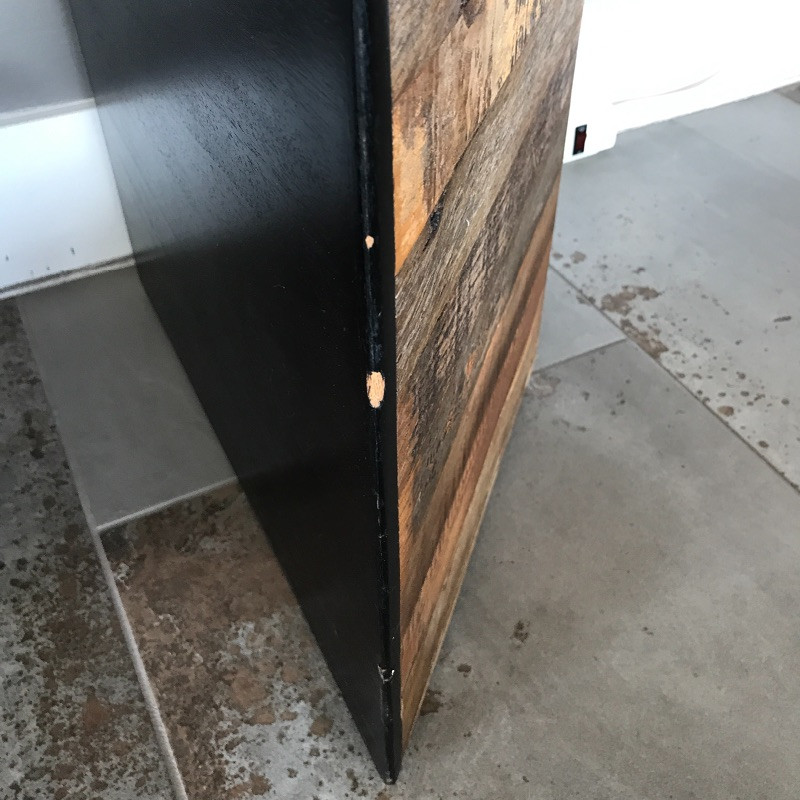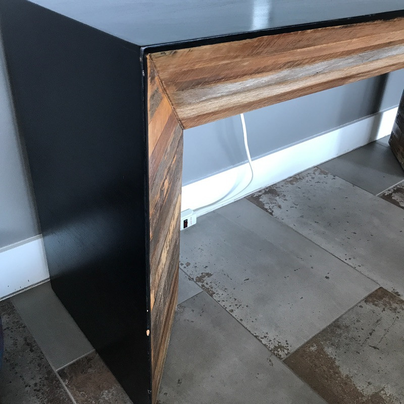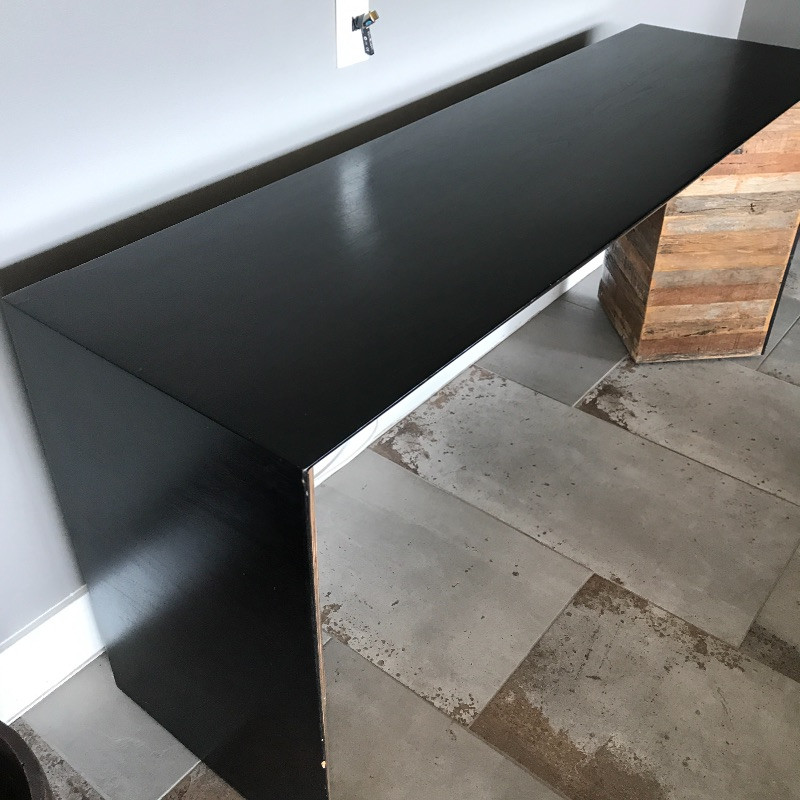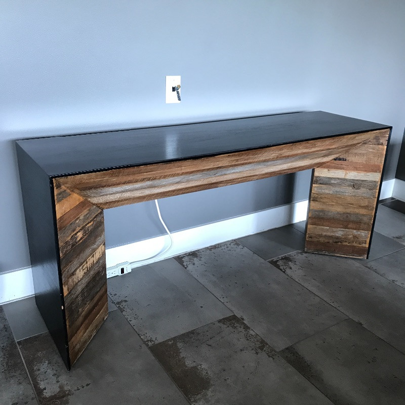 This stylish wooden console table has a lovely rough wood detail. The wood is on both sides so you would not have to put this piece up against a wall. There are a few minor chips on the black paint on the edges that could be easily touched up, see images. Measures 62” x 18” x 28”.