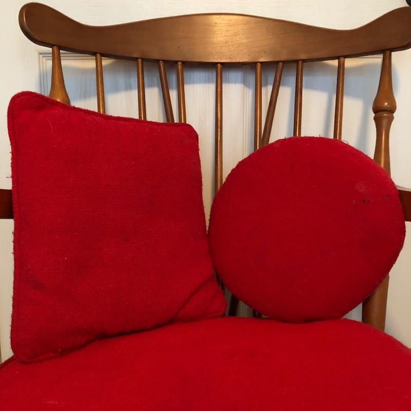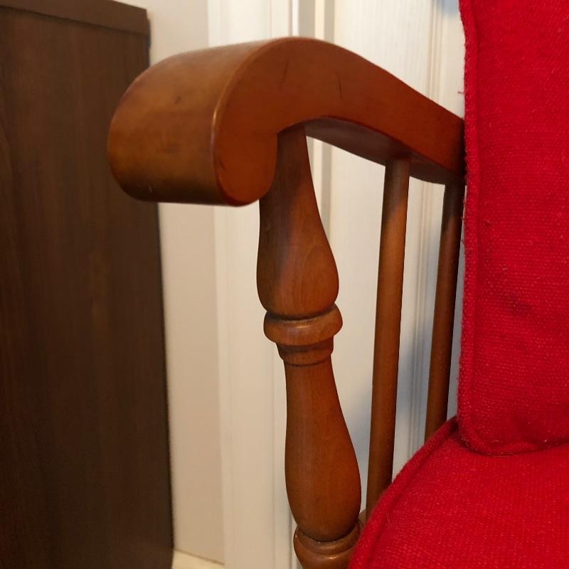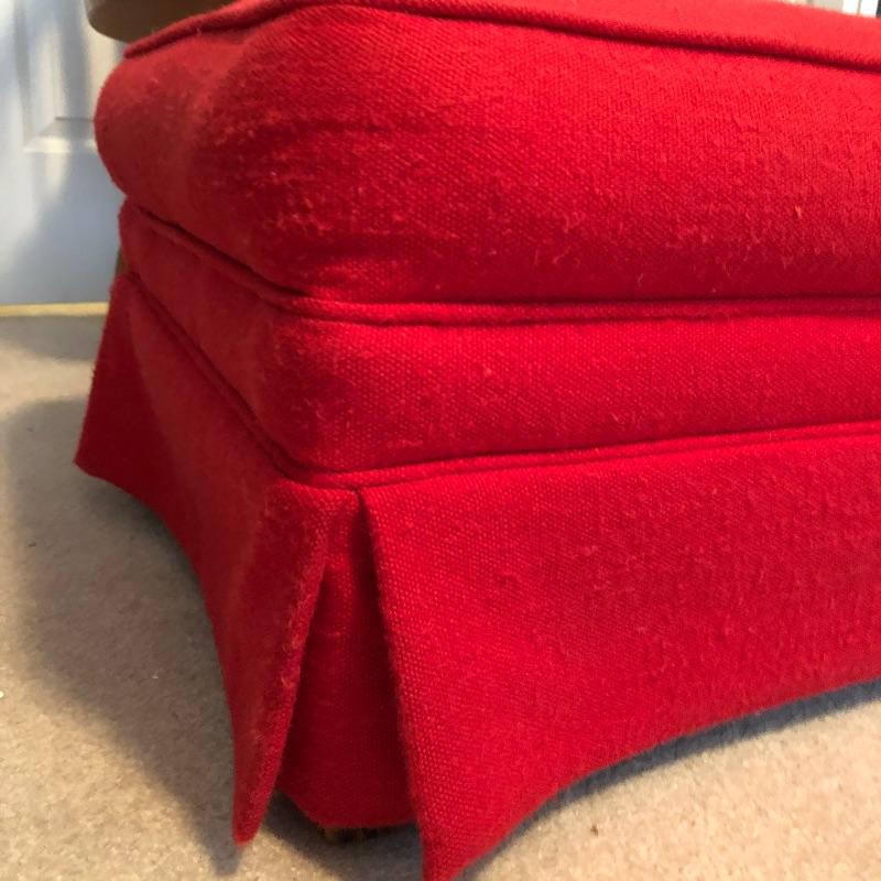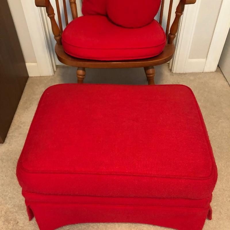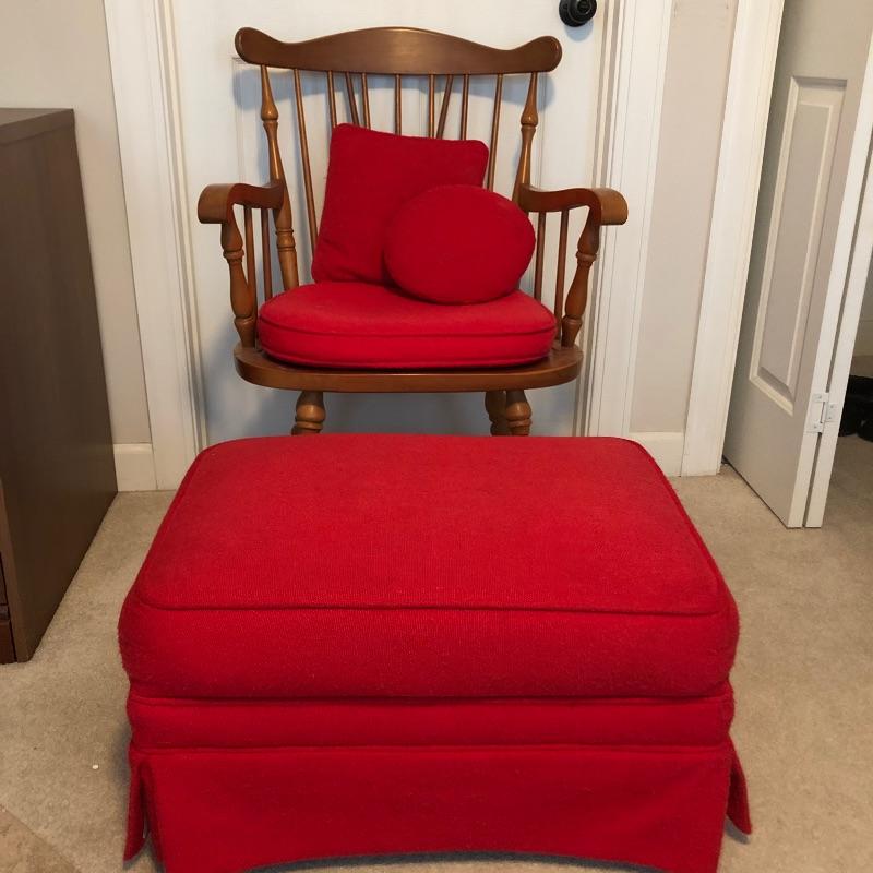 This beautiful chair (21” x 18” x 34.5”) is a sturdy wooden piece with bright, beautiful red cushions that mesh very well with the shade of wood. It comes with a matching red ottoman (24x20x13 in.) that makes this chair perfect for some R&R! The intricate designs on the legs and arms really add to the piece and put it all together. There are so many different things you could do with this chair! Local pickup only.