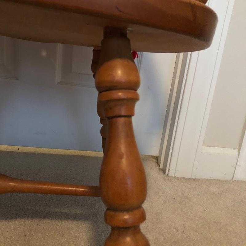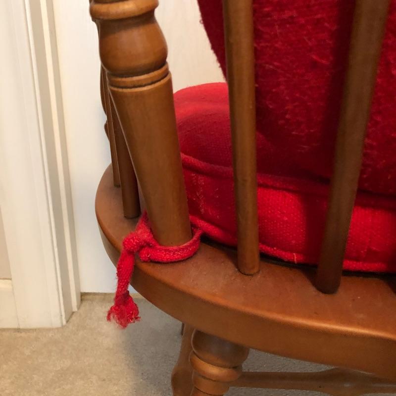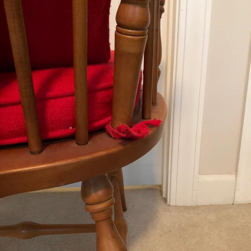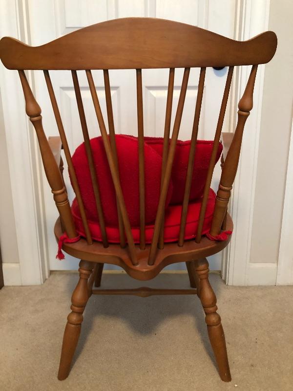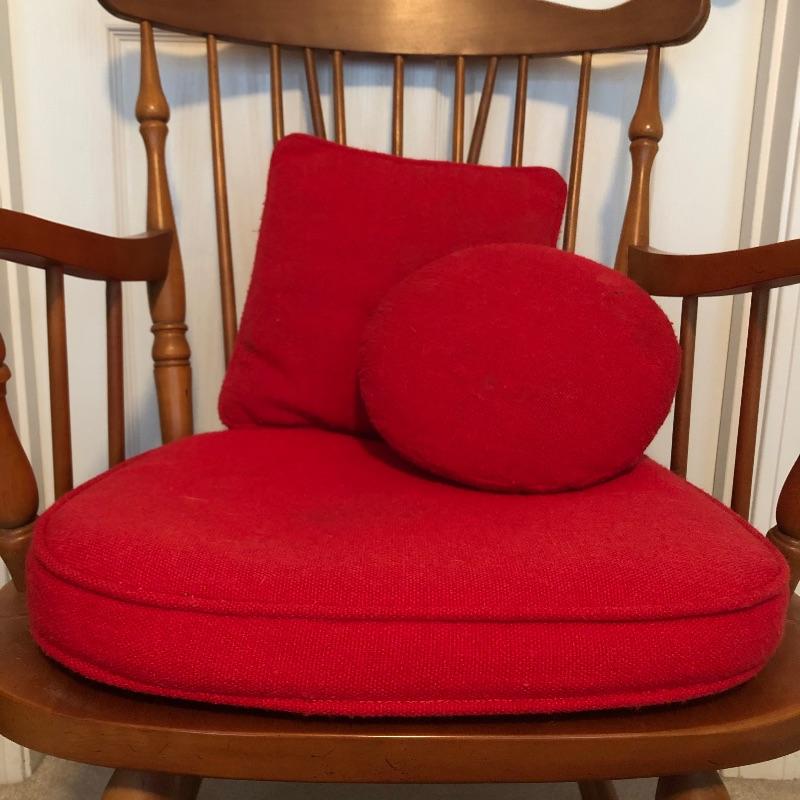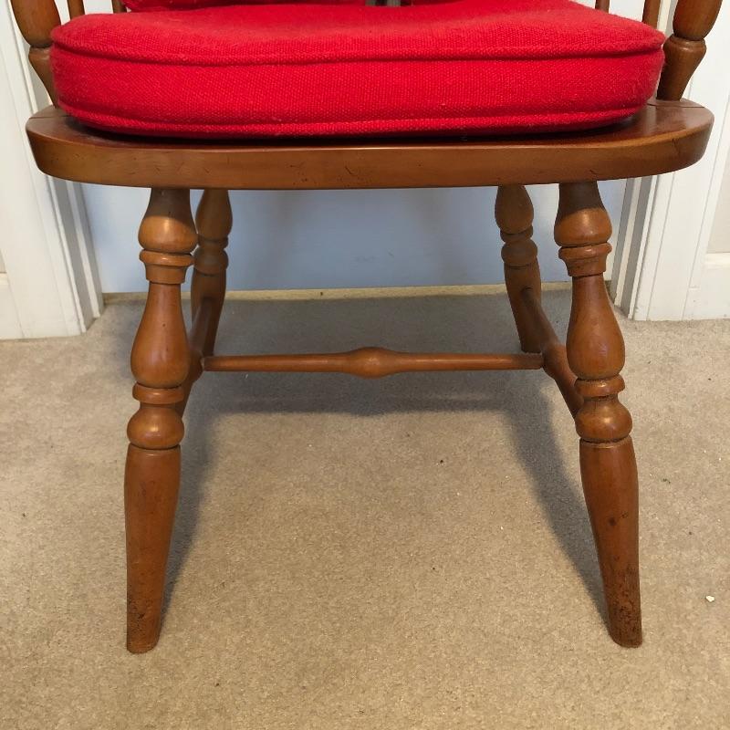 This beautiful chair (21” x 18” x 34.5”) is a sturdy wooden piece with bright, beautiful red cushions that mesh very well with the shade of wood. It comes with a matching red ottoman (24x20x13 in.) that makes this chair perfect for some R&R! The intricate designs on the legs and arms really add to the piece and put it all together. There are so many different things you could do with this chair! Local pickup only.