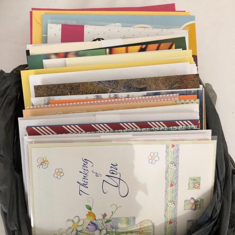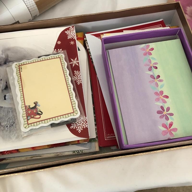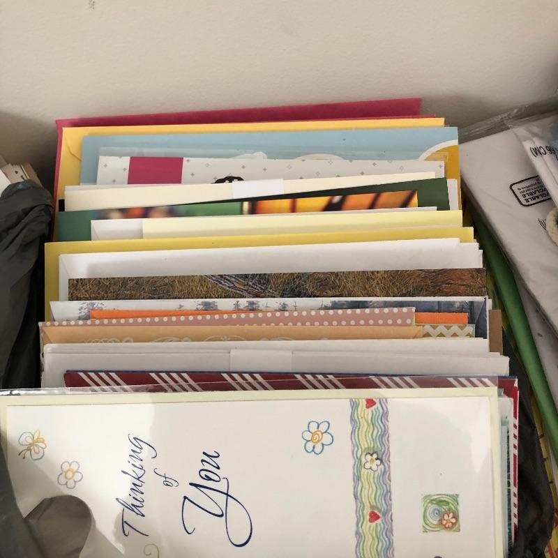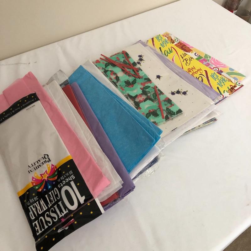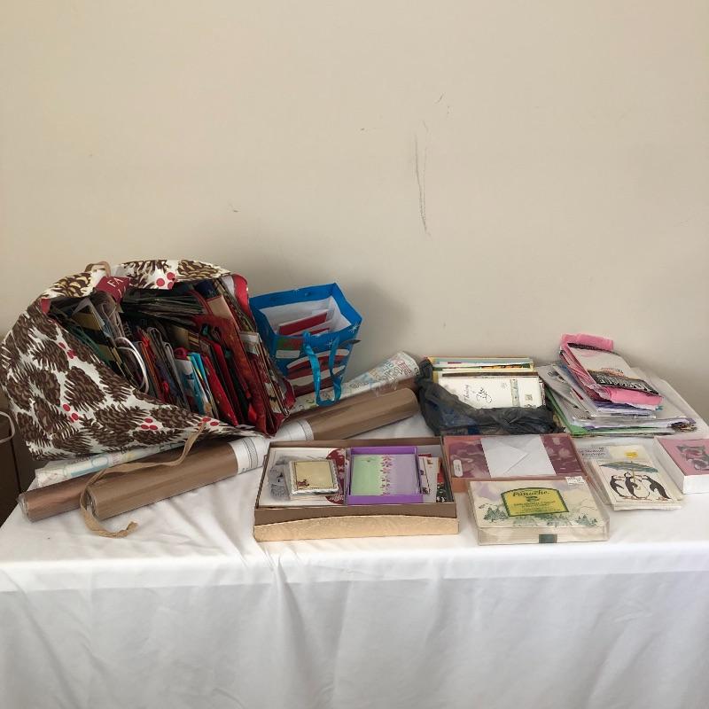 Wrap it with this lot! This lot includes gift bags, wrapping paper, cards galore, and tissue paper. Cards include Christmas, thank you and all seasons. Local pick up only.