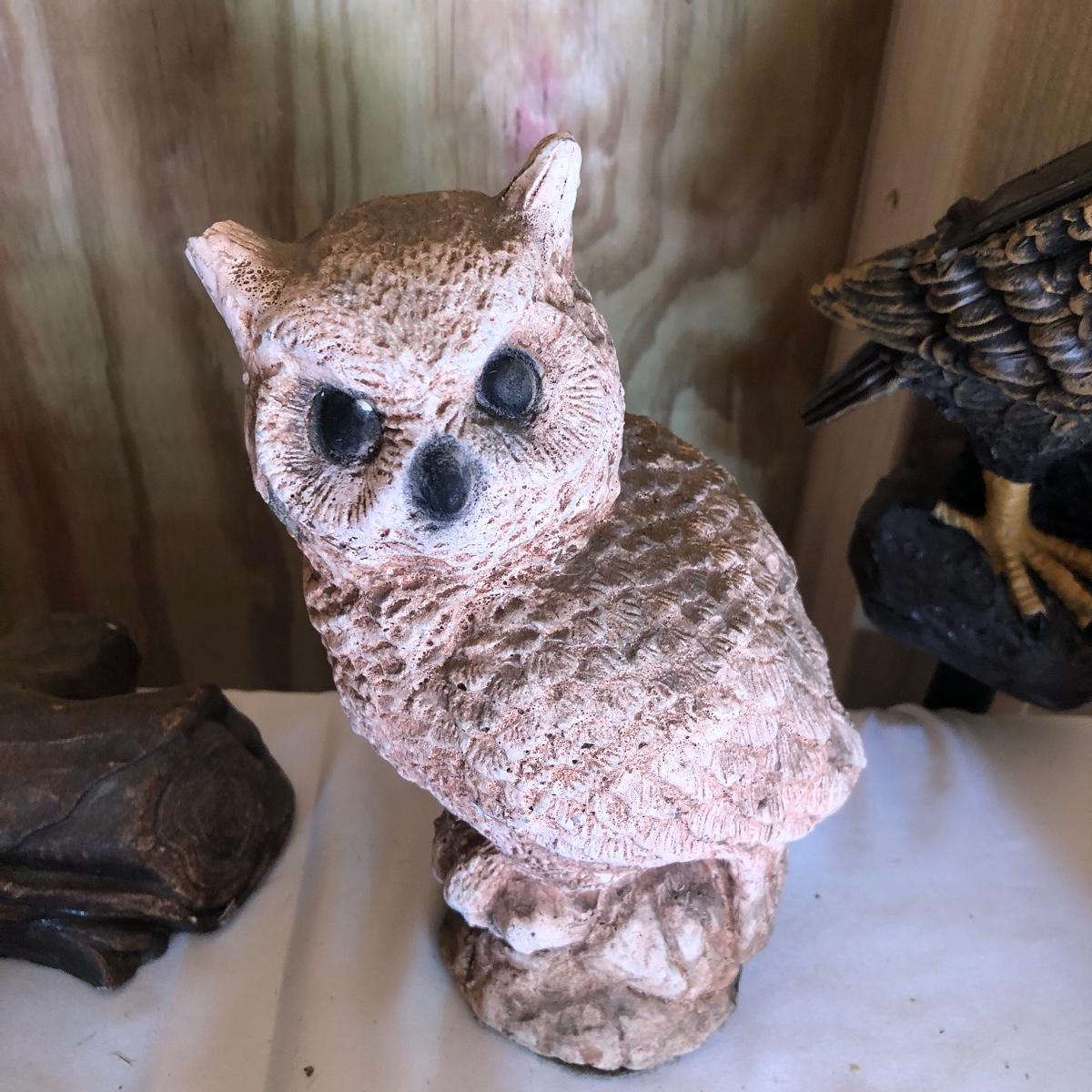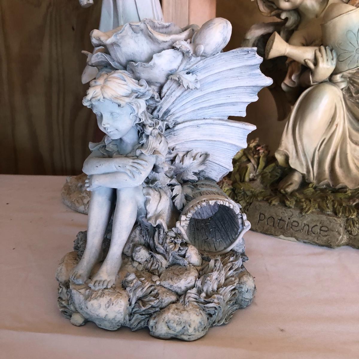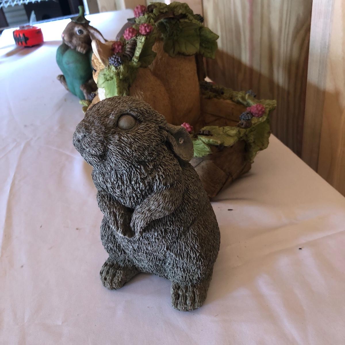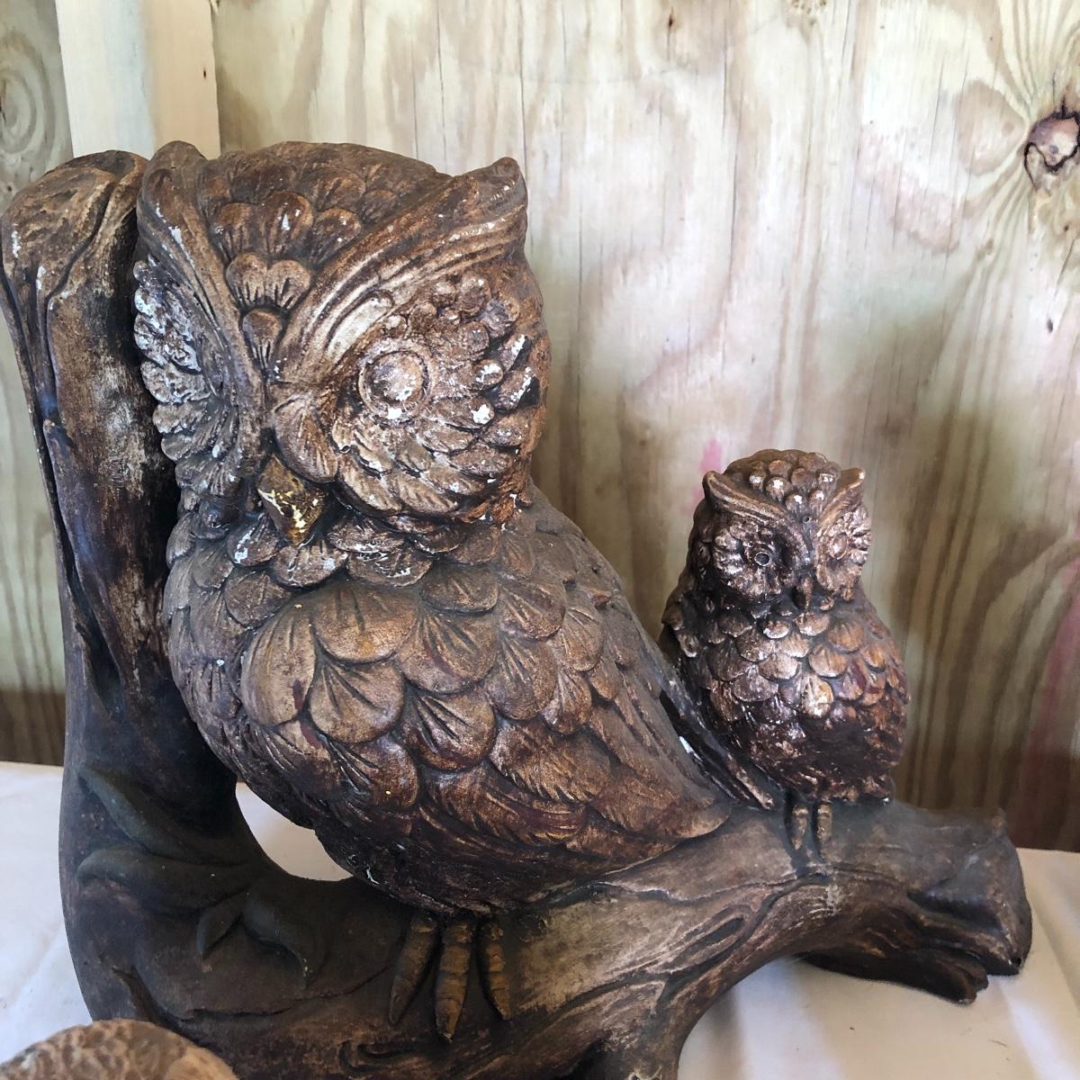 This lot will transform your flower beds and yard into a magical place! There are approximately twenty seven items in this unique lot! Most of the statues are made of a resin. There are three angel statues with the tallest being approximately 17” tall. There are two children playing that are about 18” tall (not including the jump rope). There are eight owl statues with the tallest owl being 19” tall. Note his head swivels. Also, note the piece that has four owls on a limb has a broken owl which could easily be glued. There are four bunny statues, three baskets and nine other statues comprising of frogs, turtles, bears and squirrels. The lot is completed with three terra cotta plaques, two of which are in boxes. Local pick up only.