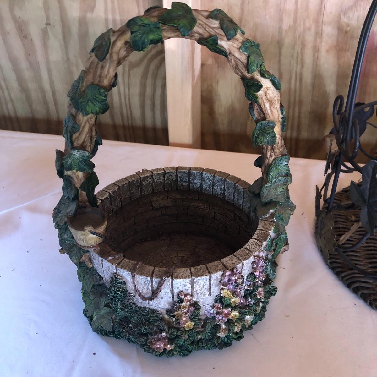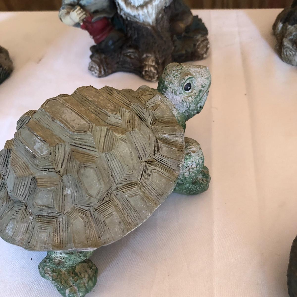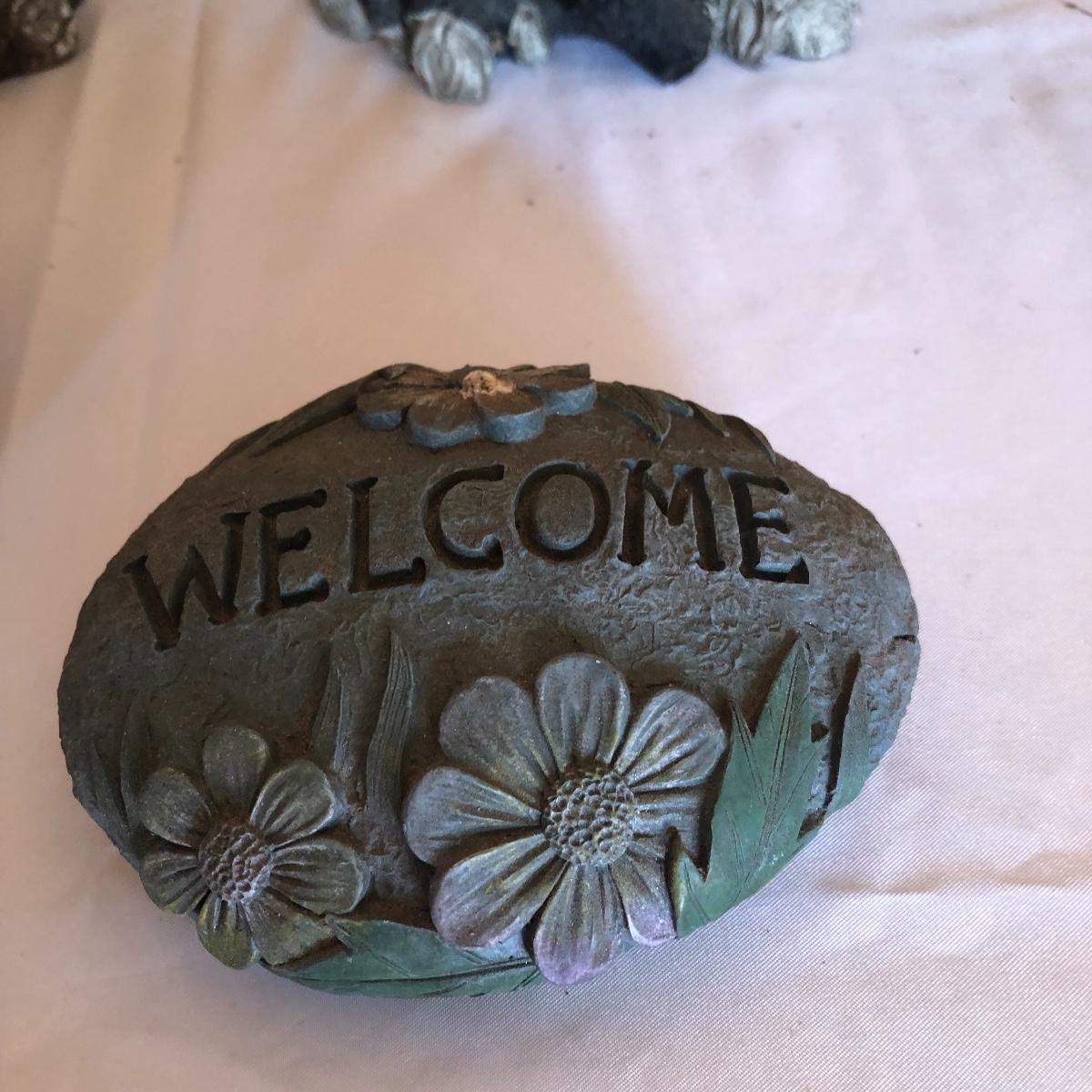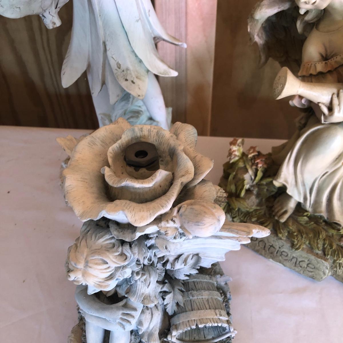 This lot will transform your flower beds and yard into a magical place! There are approximately twenty seven items in this unique lot! Most of the statues are made of a resin. There are three angel statues with the tallest being approximately 17” tall. There are two children playing that are about 18” tall (not including the jump rope). There are eight owl statues with the tallest owl being 19” tall. Note his head swivels. Also, note the piece that has four owls on a limb has a broken owl which could easily be glued. There are four bunny statues, three baskets and nine other statues comprising of frogs, turtles, bears and squirrels. The lot is completed with three terra cotta plaques, two of which are in boxes. Local pick up only.
