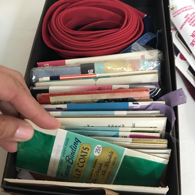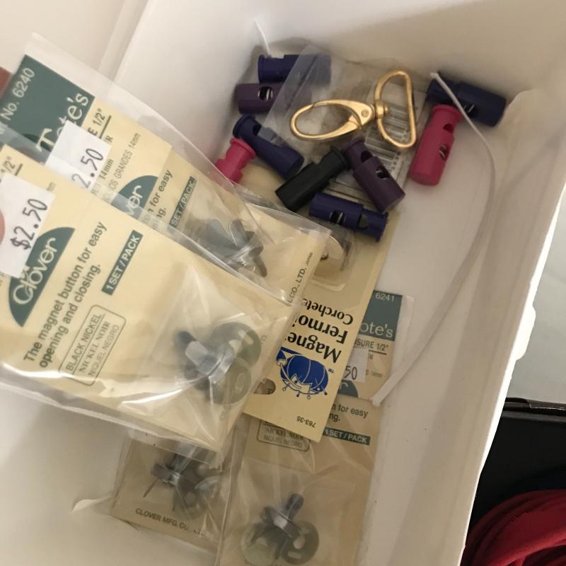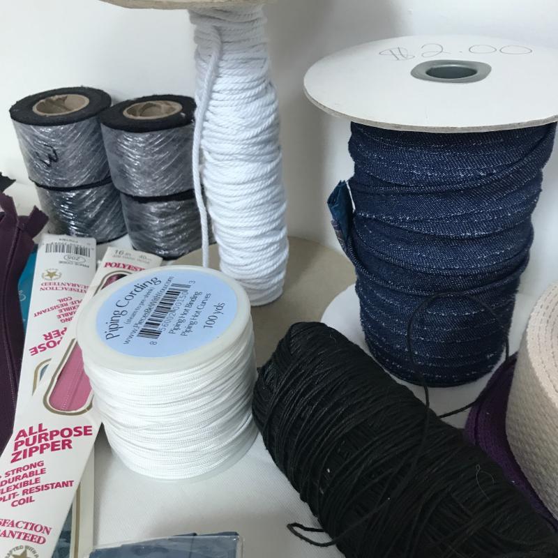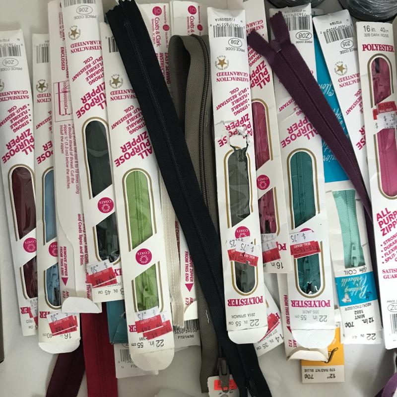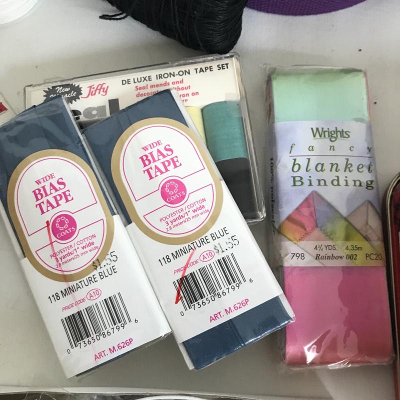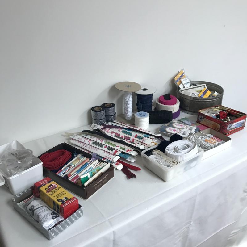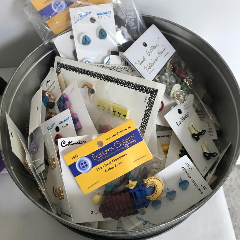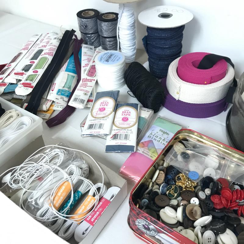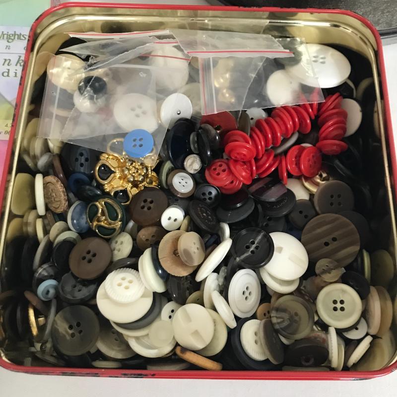 This lot of notions will help you finish your project. Two large tins full of buttons, zippers in a variety of colors, tape, piping, Velcro, bias tape, elastic, and more! See photos. Shipping available.