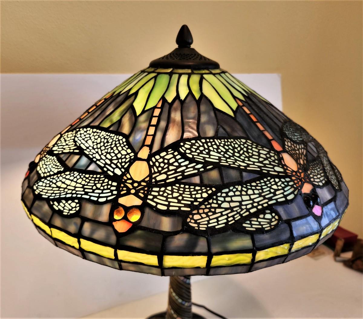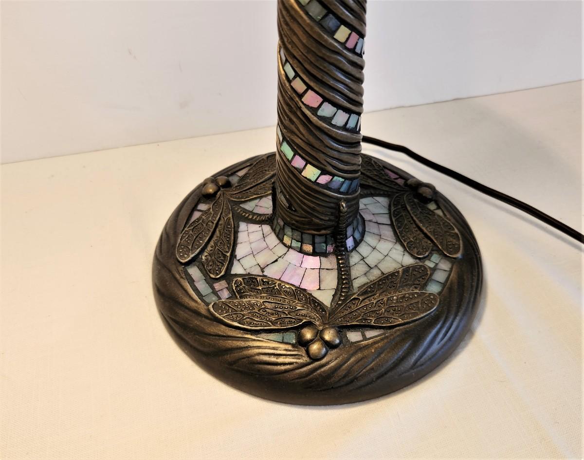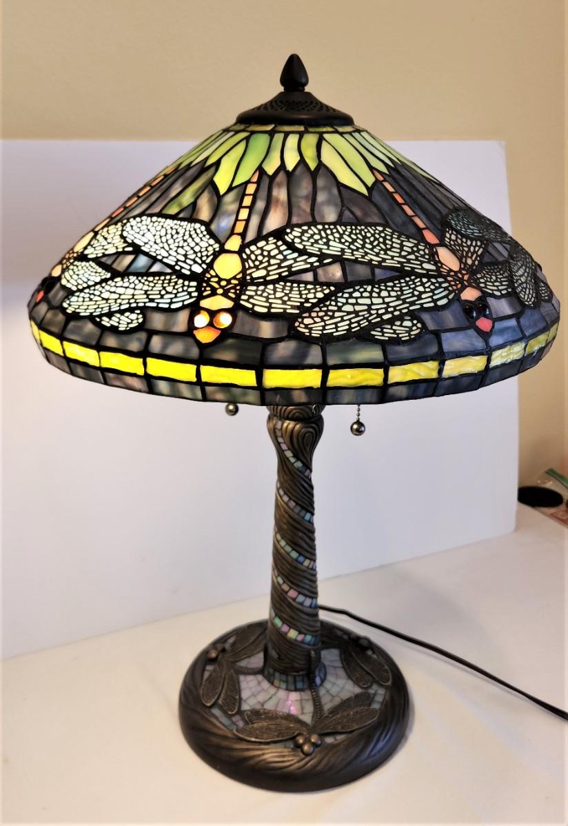 Lovely decorator table lamp - contemporary - Tiffany-style with dragonfly motif. Good working condition - 22" tall.
