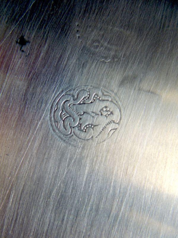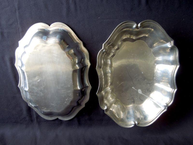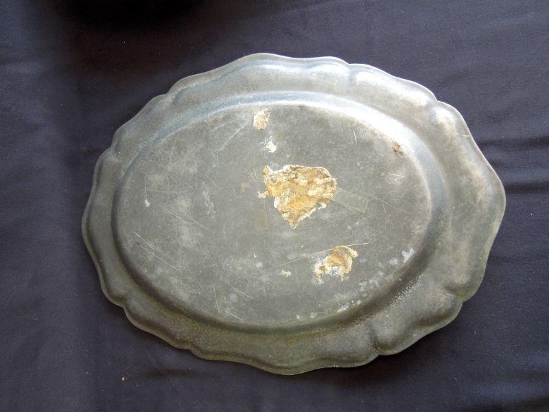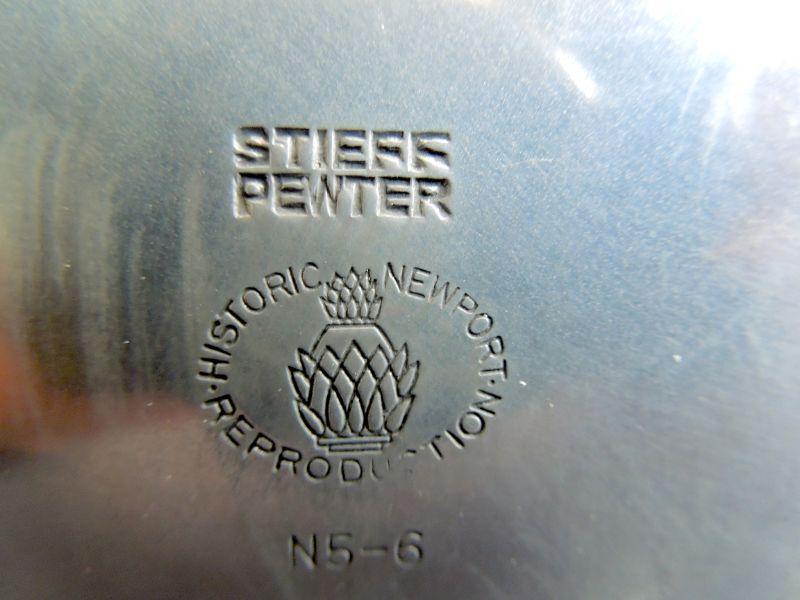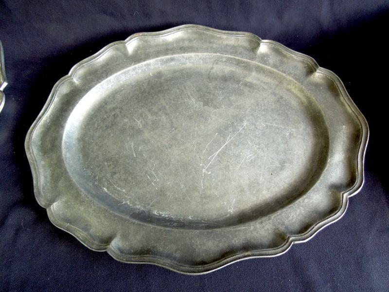 17" platter has some putty type substance stuck to back and surface scratches. Teapot with wooden handle is 6.75" H and marked on bottom "Stieff Historic Newport Reproduction". Finally two 13" scalloped raised edge serving trays that may be buffet inserts.
