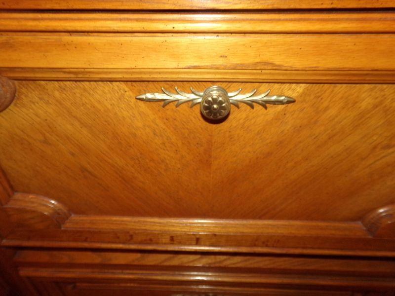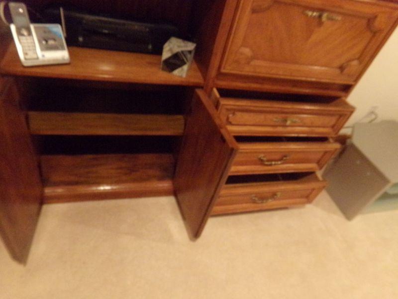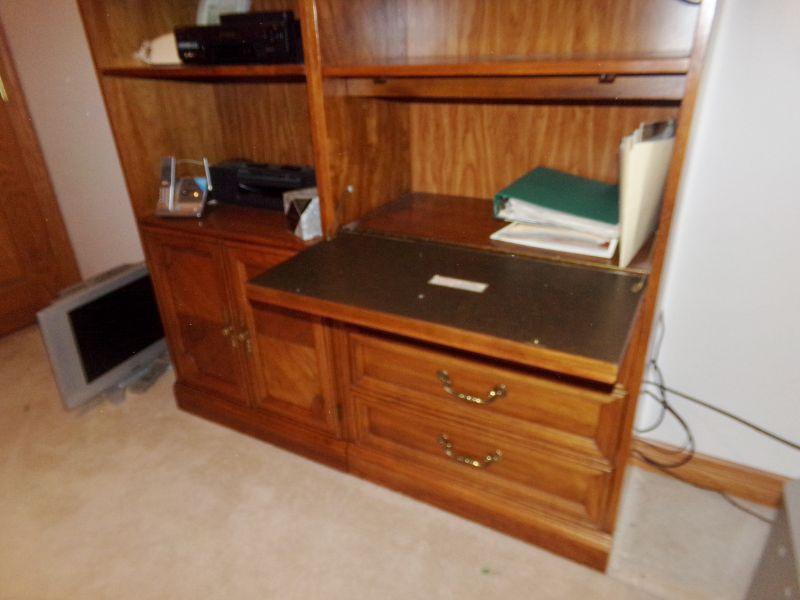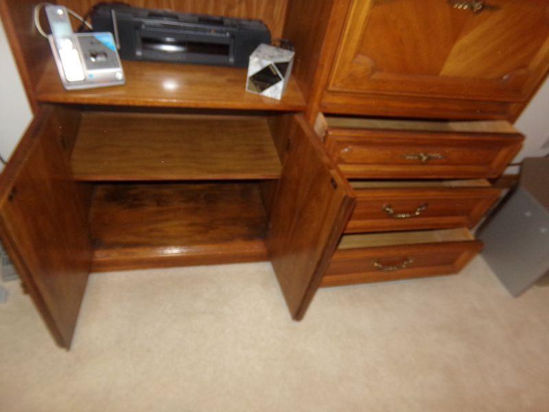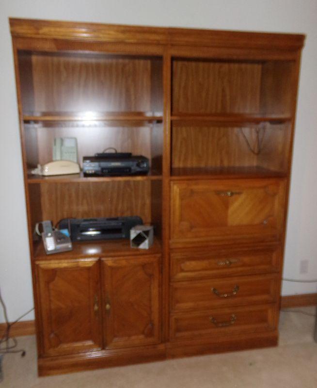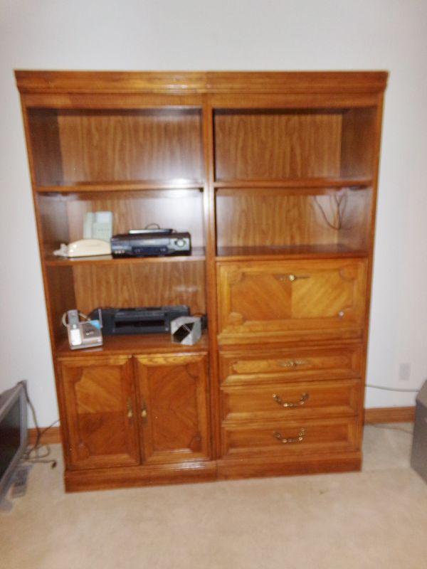 2 PIECE UNIT THAT HAS OPEN SHELVING, DROP DOWN SECRETARY, DRAWERS AND CUPBOARD WITH SHELF.