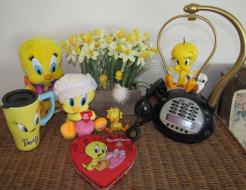 Lot 130-Large Lot of original Tweety Bird Items. Two Stuffed Tweety Birds, Tweety Bird Phone, Tweety Bird Cup, flowers etc.