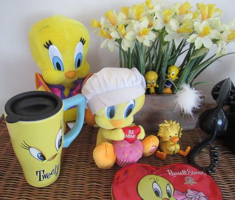 Large Lot of original Tweety Bird Items. Two Stuffed Tweety Birds, Tweety Bird Phone, Tweety Bird Cup, flowers etc. $55.00