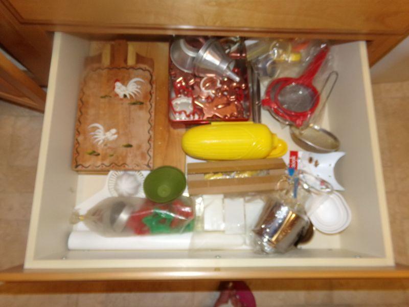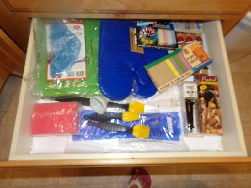 2 DRAWERS FULL OF - STRAINERS, CORN HOLDERS, CUTTING BOARDS, SILICON OVEN MIT, BIRTHDAY CANDLES AND MORE