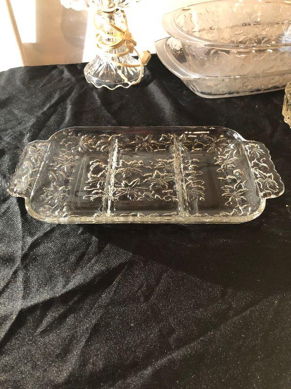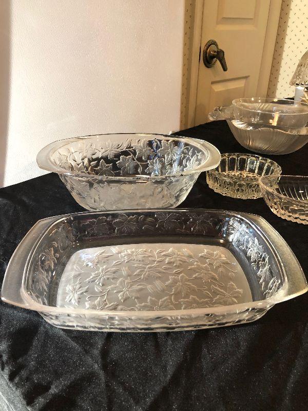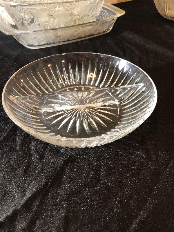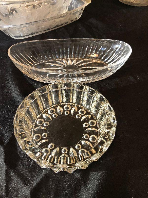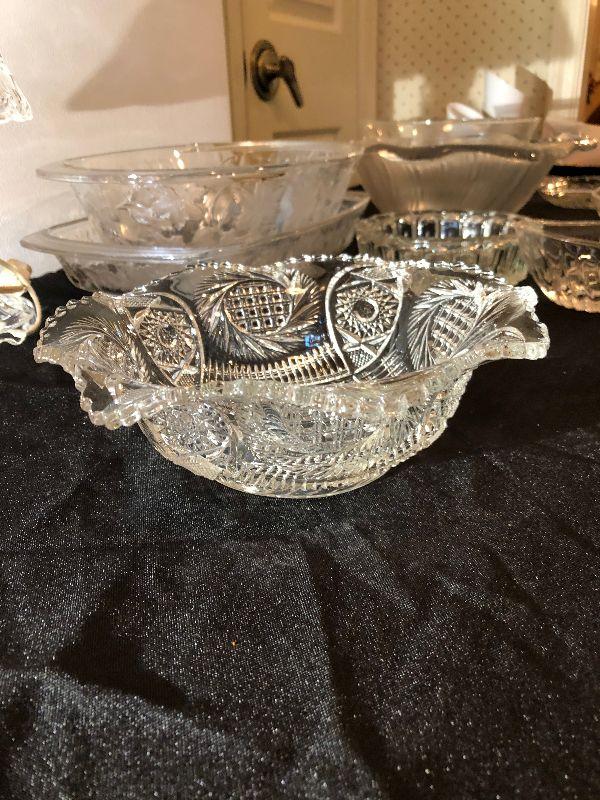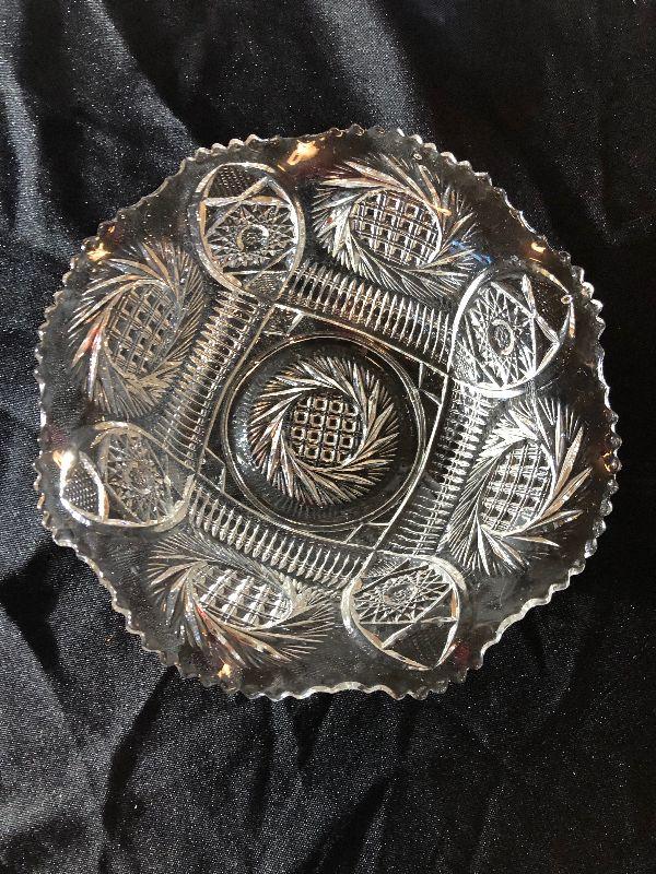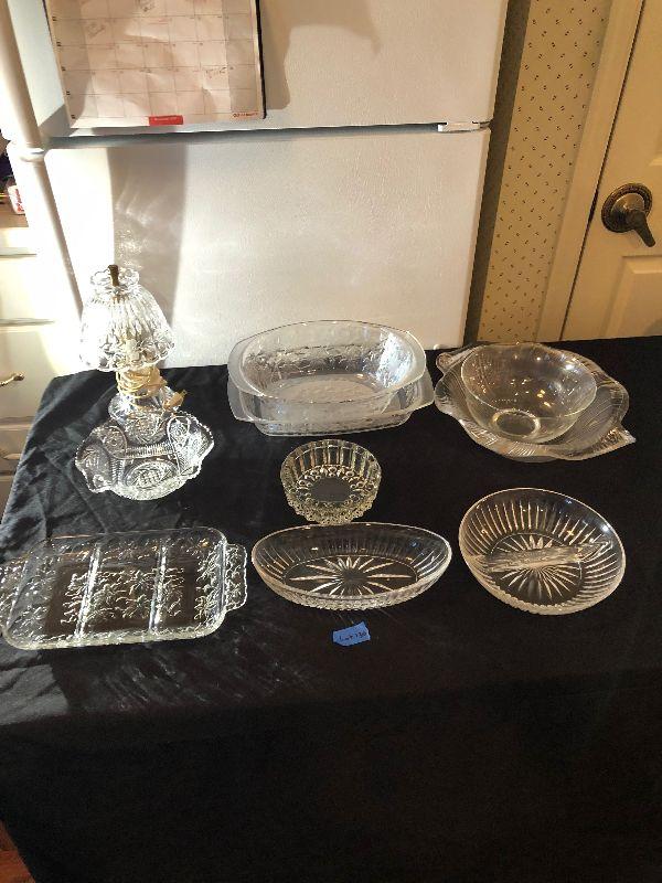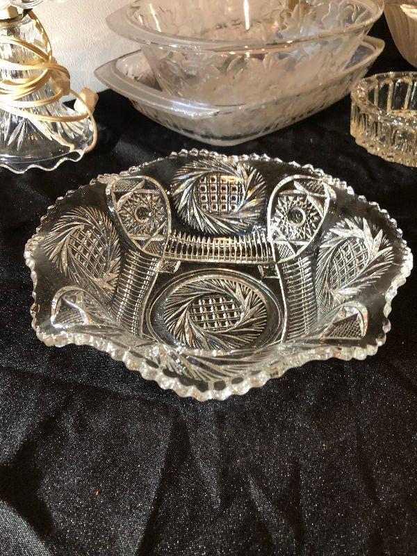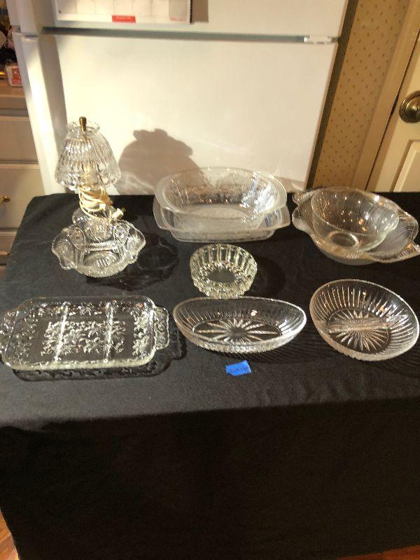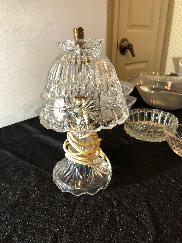 Assortment of Crystal and Glass Pieces (Some Vintage) including an American Brilliant Bowl, a Crystal Lamp and Other Fine Decorative Serving Pieces..
