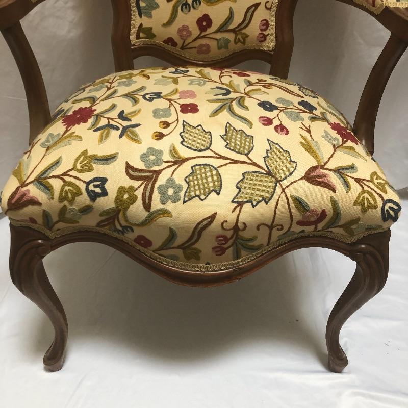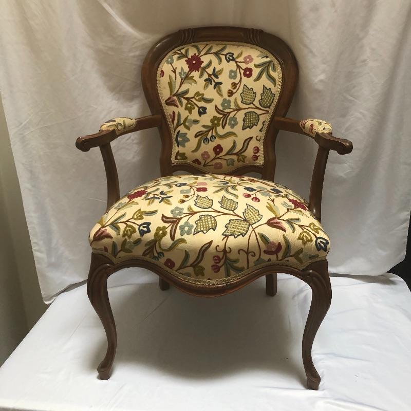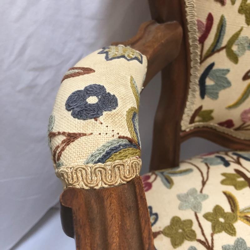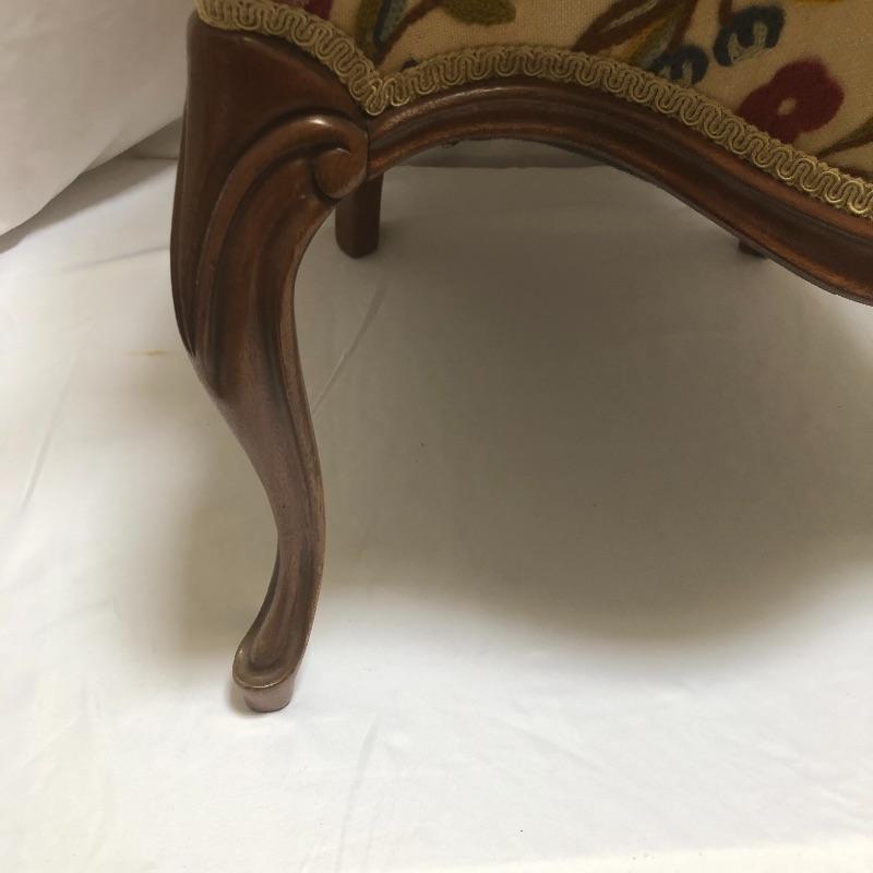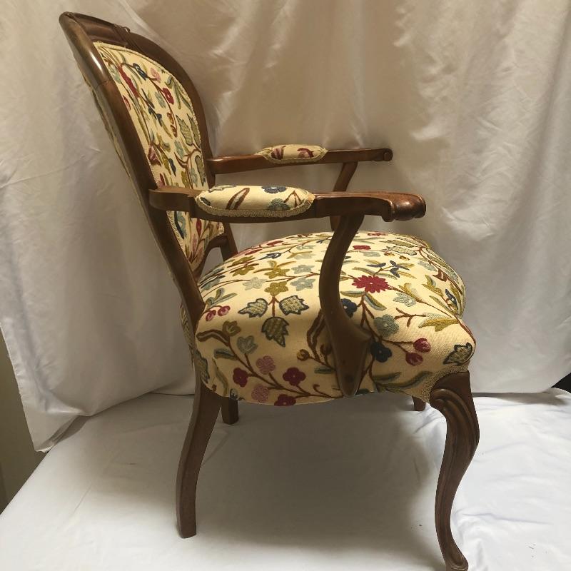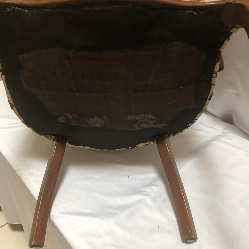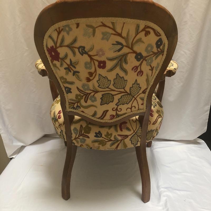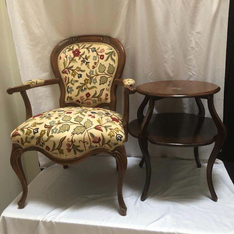 This classic armchair has a wooden frame with padded back and seat with embroidery. Also includes a wooden side table with shelf underneath. Side table appears to have been repaired underneath and has a mark on top, see pictures. Chair measures 27” x 27” x 35” with a seat height of 18”.