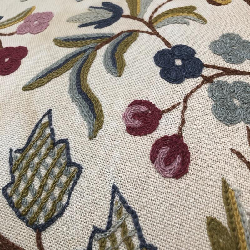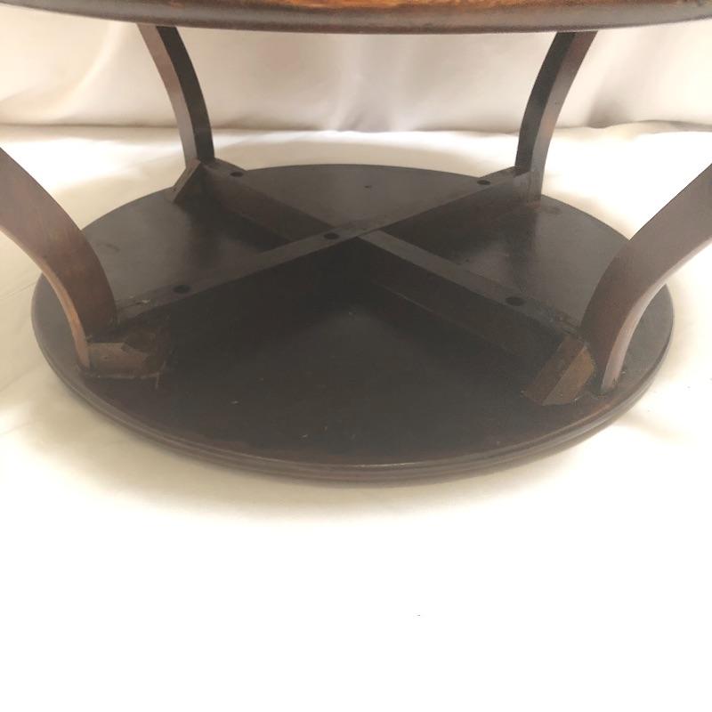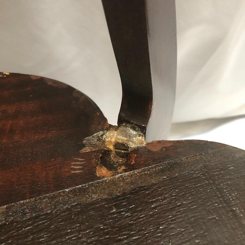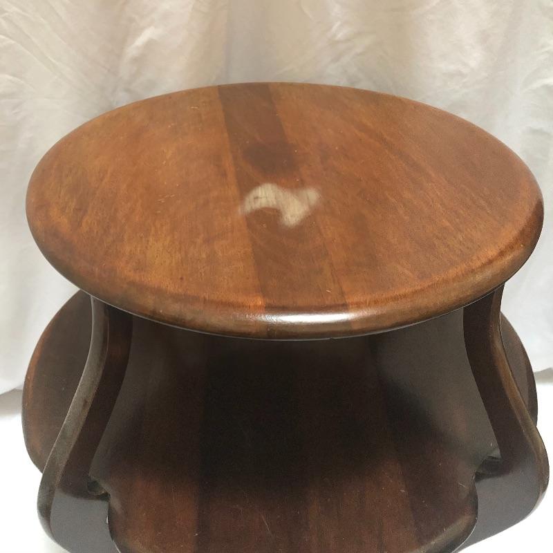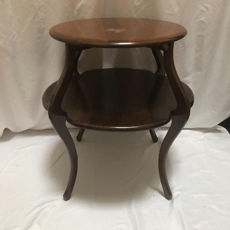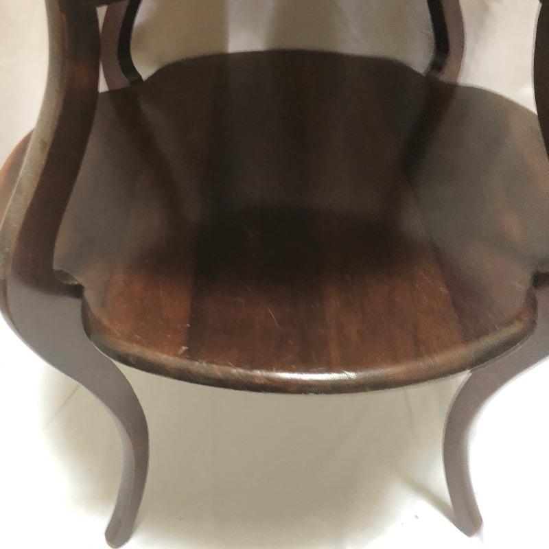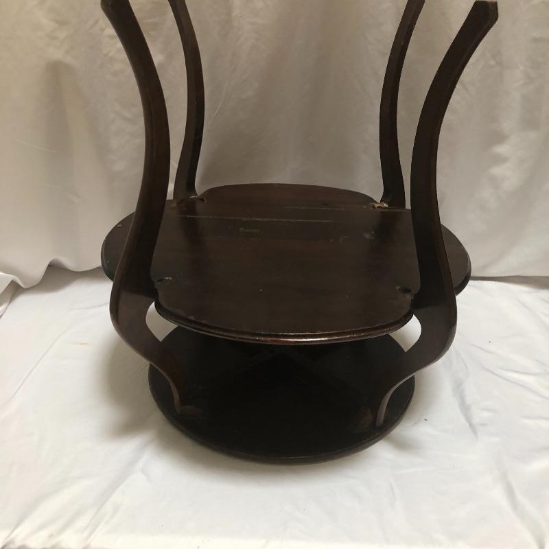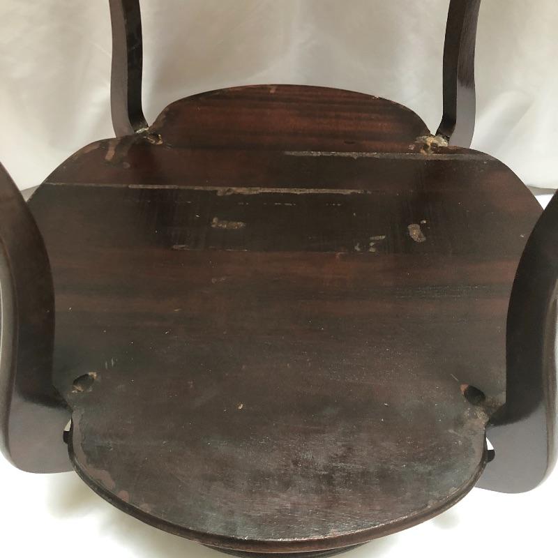 This classic armchair has a wooden frame with padded back and seat with embroidery. Also includes a wooden side table with shelf underneath. Side table appears to have been repaired underneath and has a mark on top, see pictures. Chair measures 27” x 27” x 35” with a seat height of 18”.
