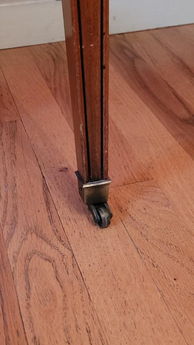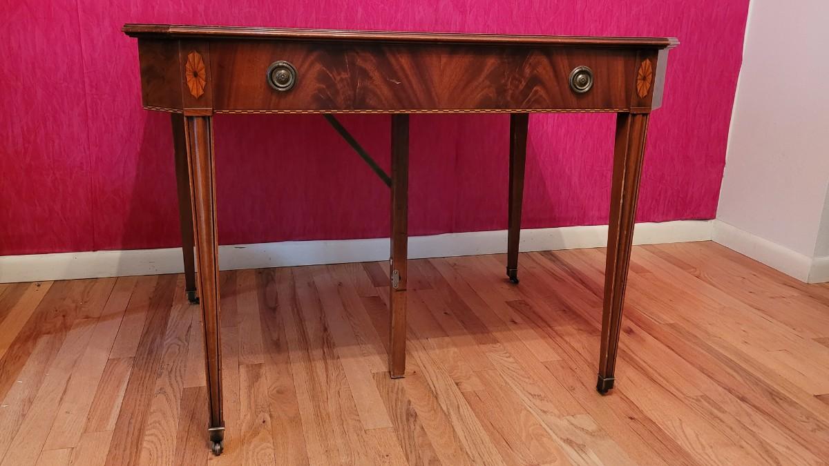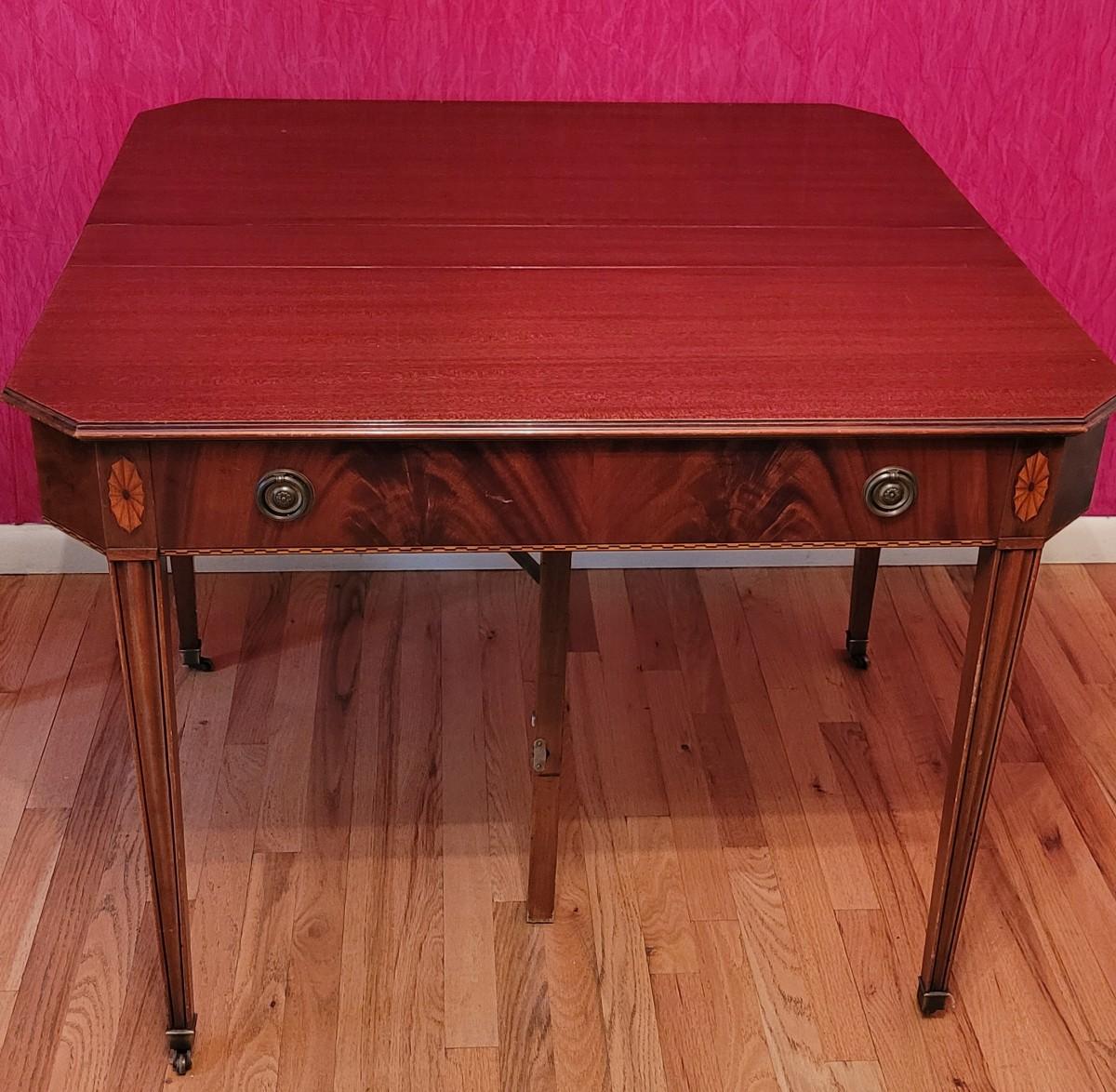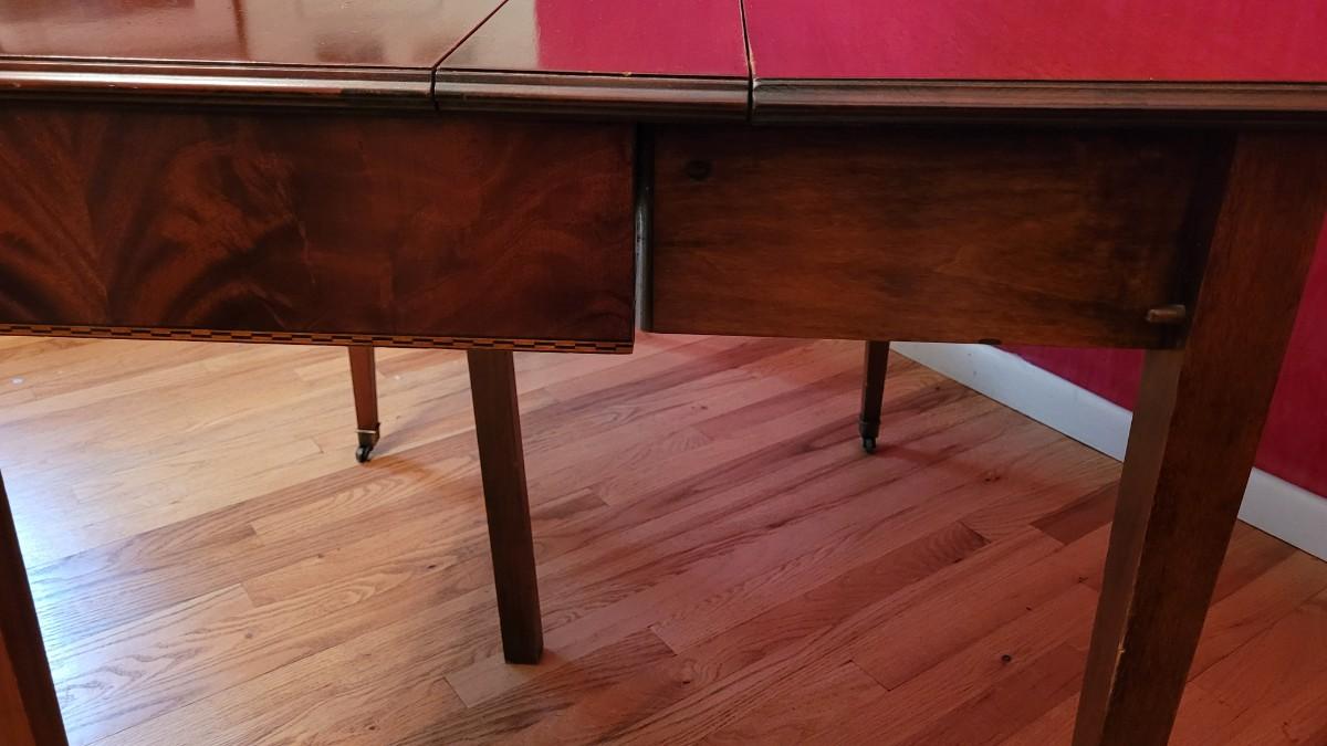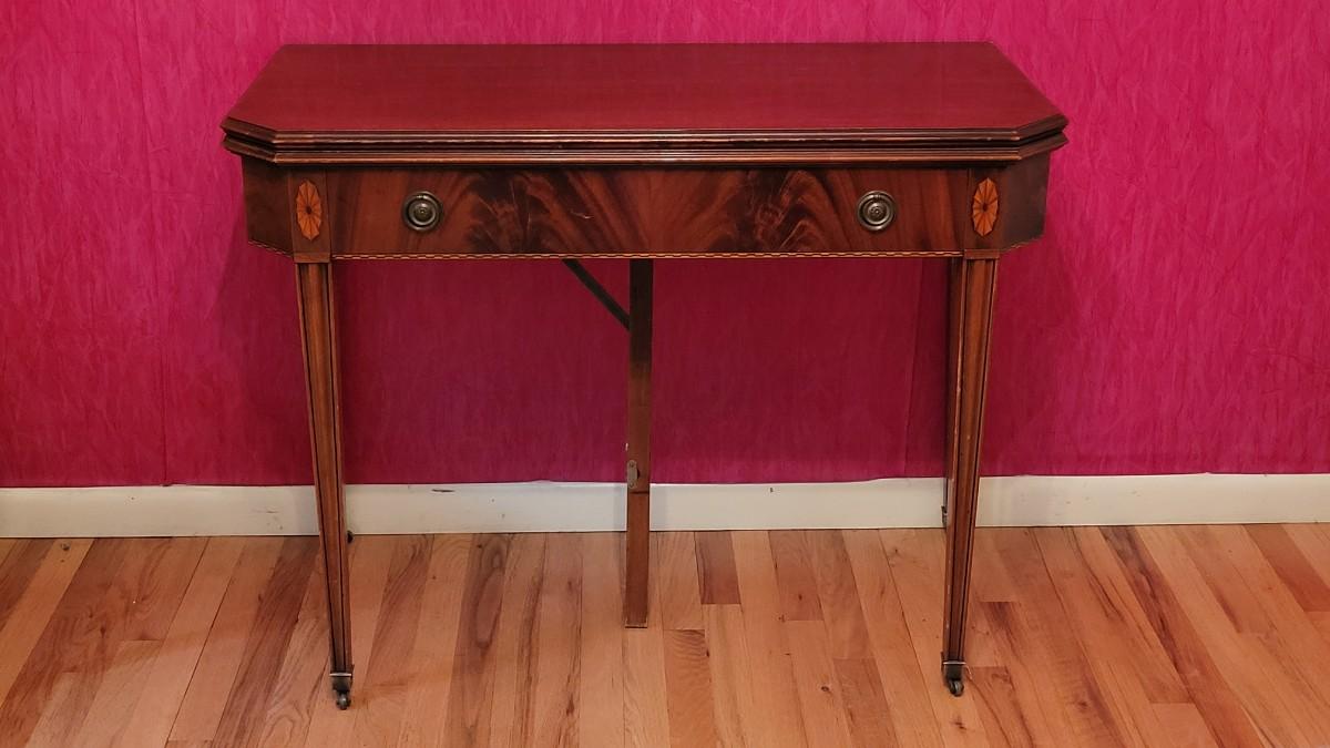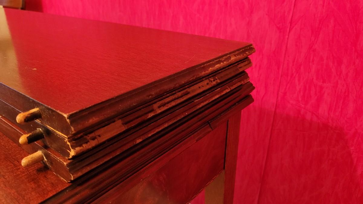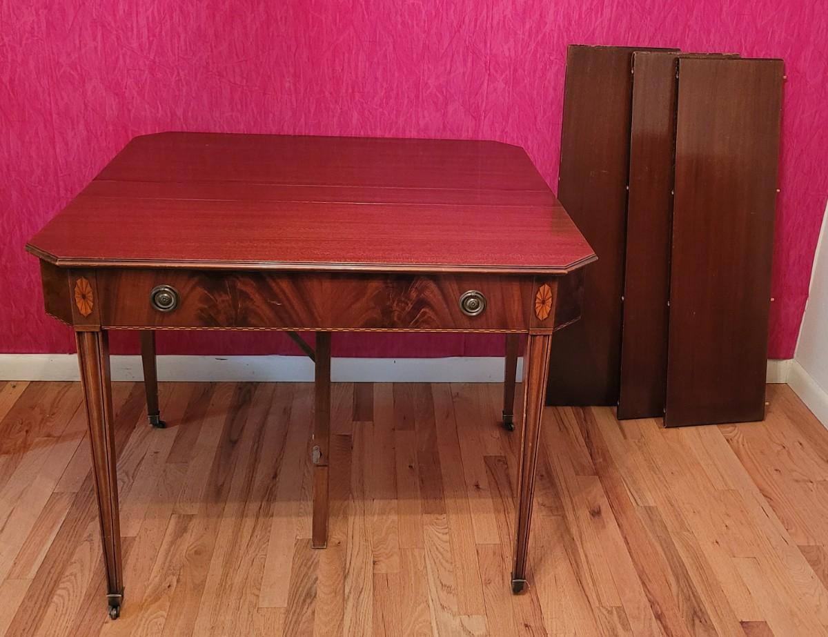 Beautiful wood inlay flowers grace the tops of 2 of the legs and checkered inlay adorns the bottom rim. This fantastic convertible table has multiple uses. It is a console table that has a flip top and slides out to be the perfect game table size. There are also 3 additional leaves that can be added to create a dining table.