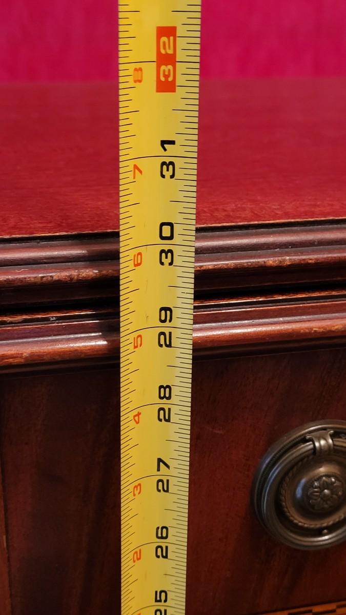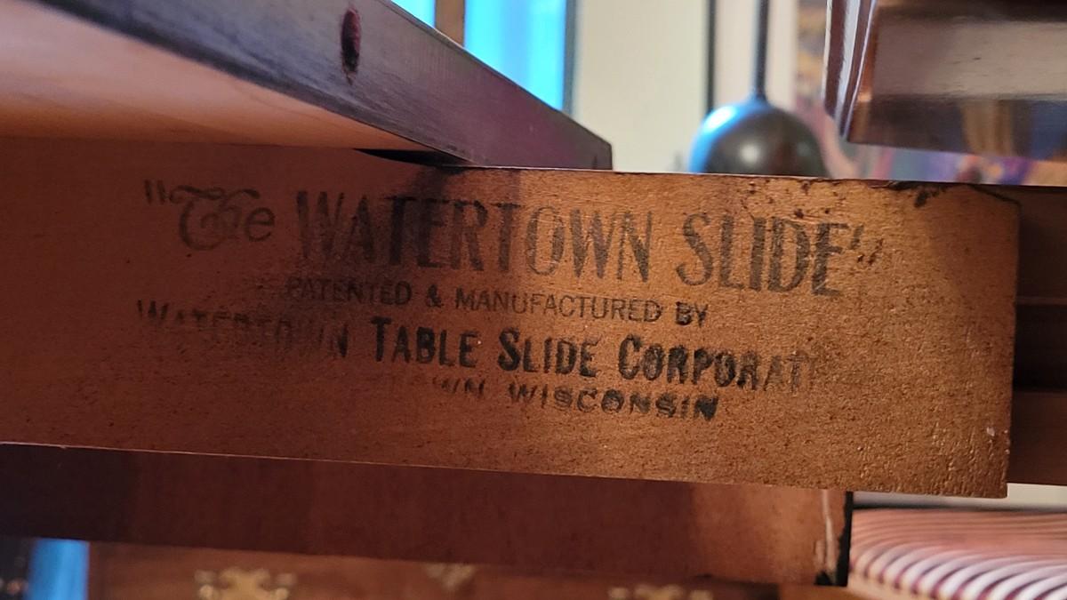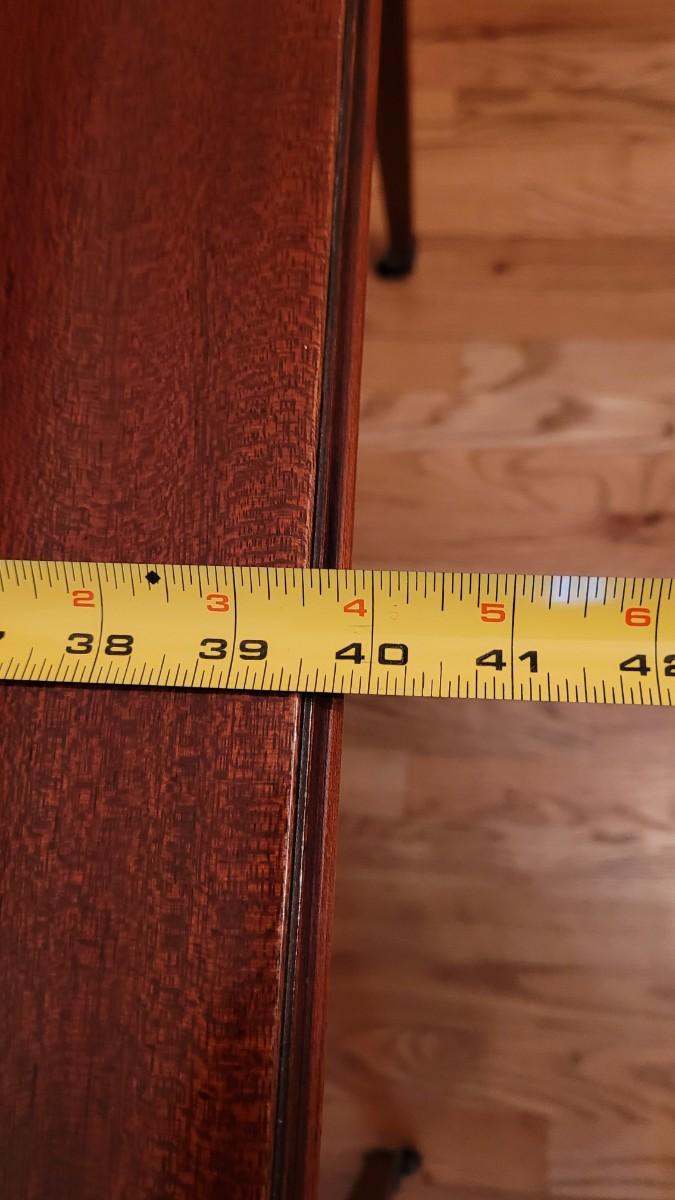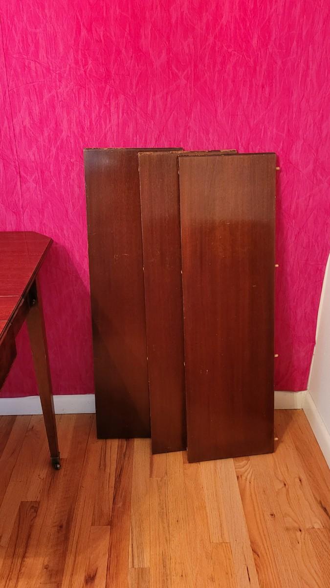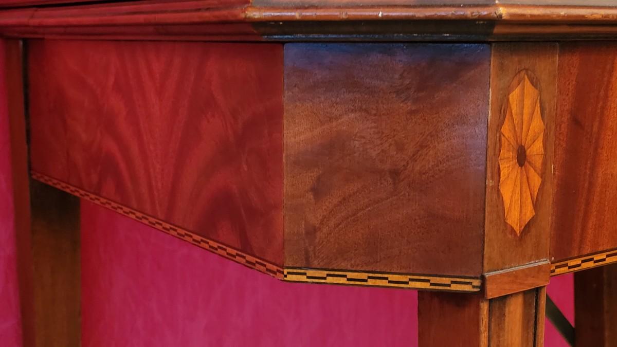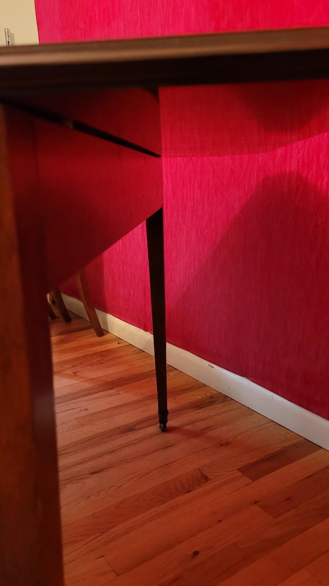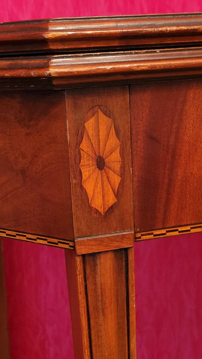 Beautiful wood inlay flowers grace the tops of 2 of the legs and checkered inlay adorns the bottom rim. This fantastic convertible table has multiple uses. It is a console table that has a flip top and slides out to be the perfect game table size. There are also 3 additional leaves that can be added to create a dining table.