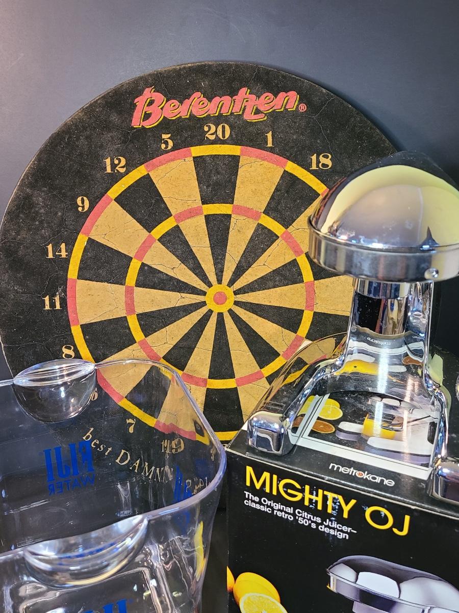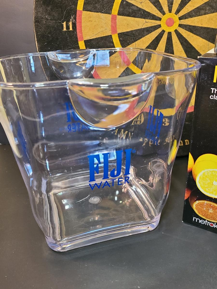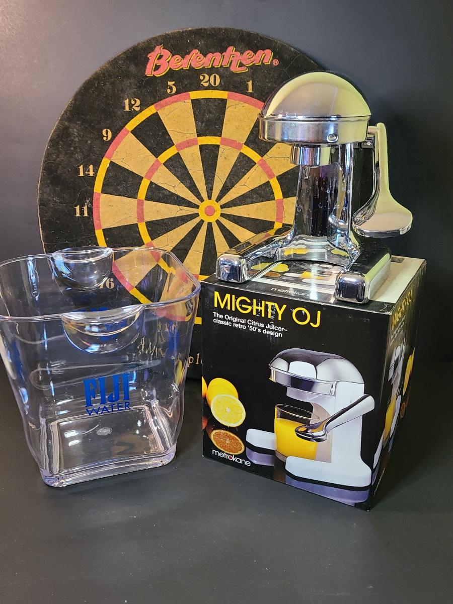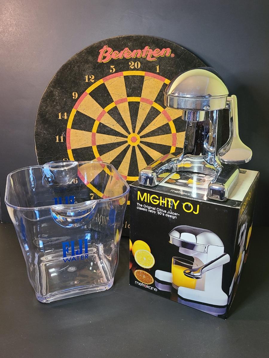 Lot 130: Might Joe Chrome Juicer, Dartboard, and Fiji Water Icebucket
