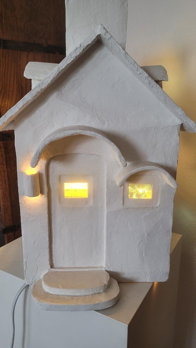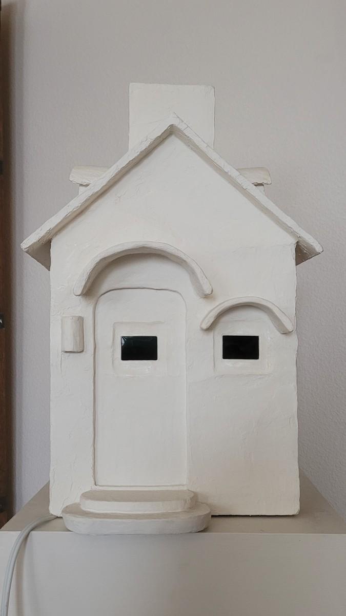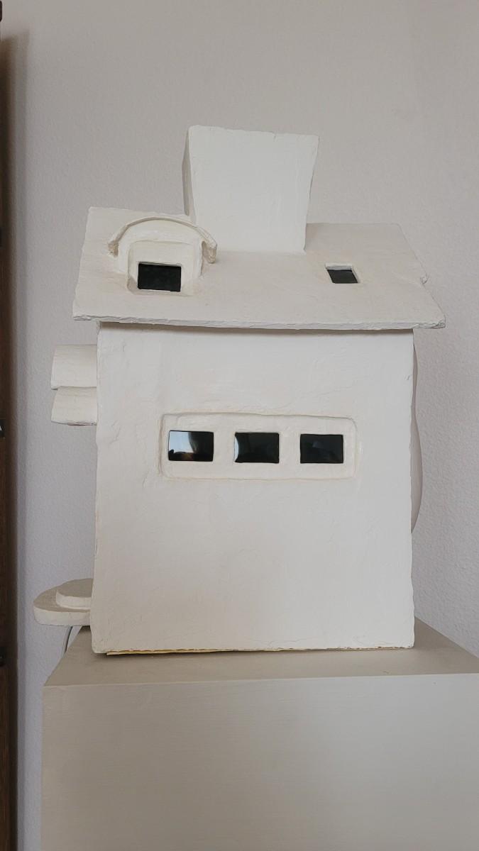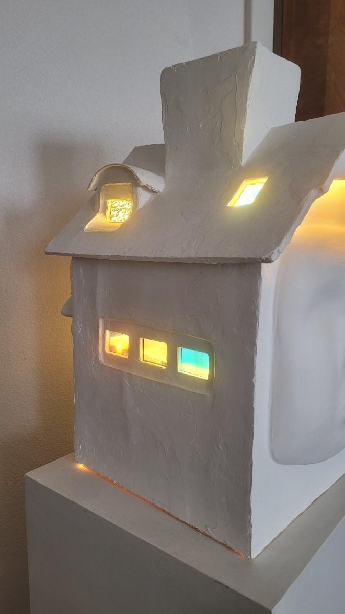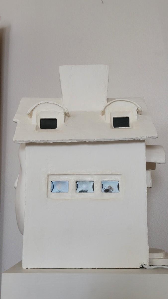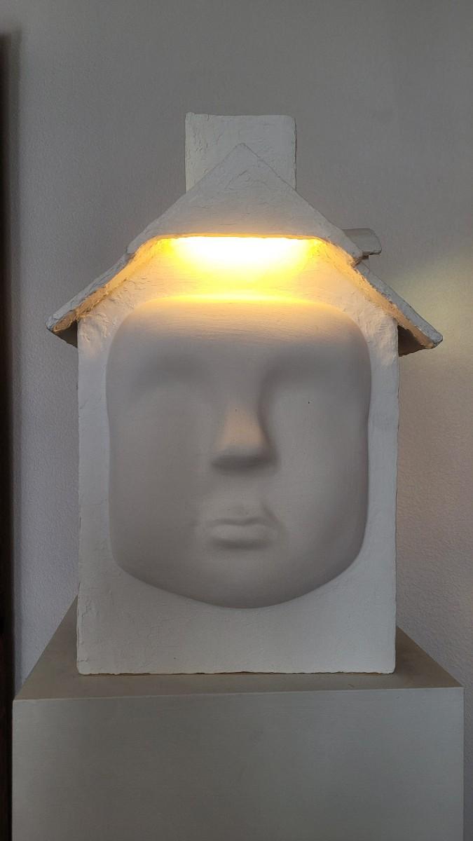 This beautiful sculpture captures the imagination from all angles. When the light is on, a variety of film negatives are illuminated in all the windows which draws you into the intimate house. The mask adds a dreamy depth to the piece.