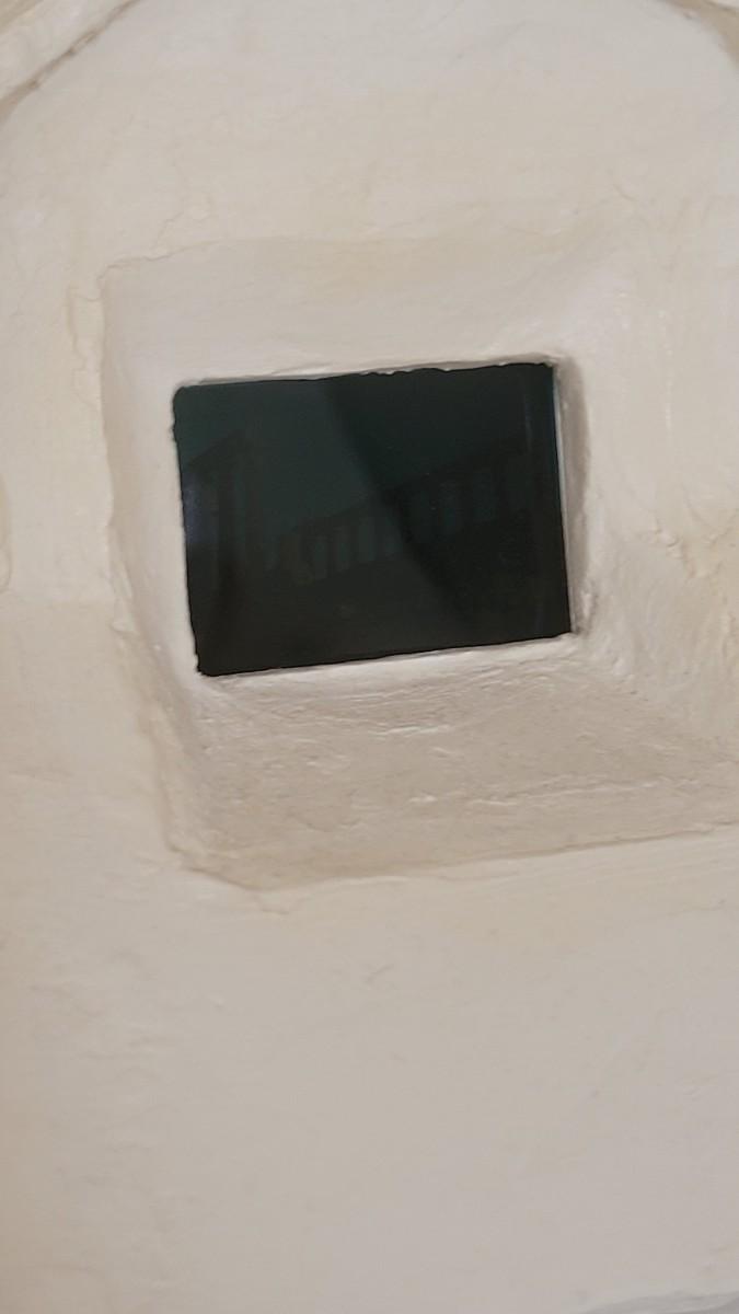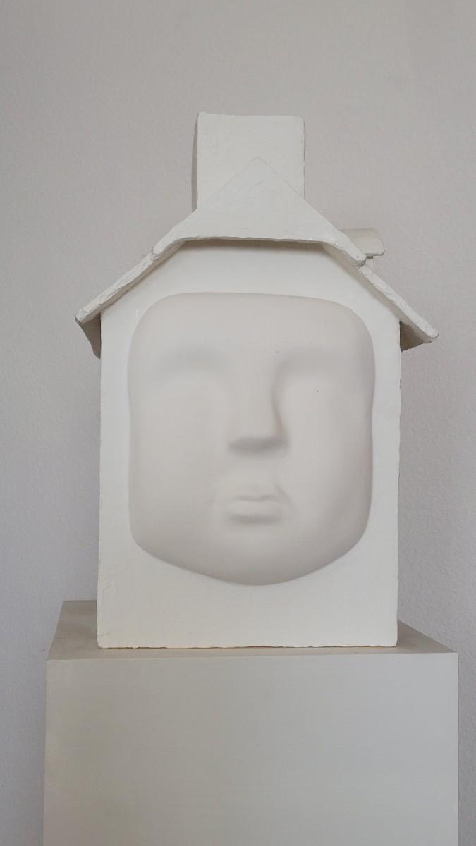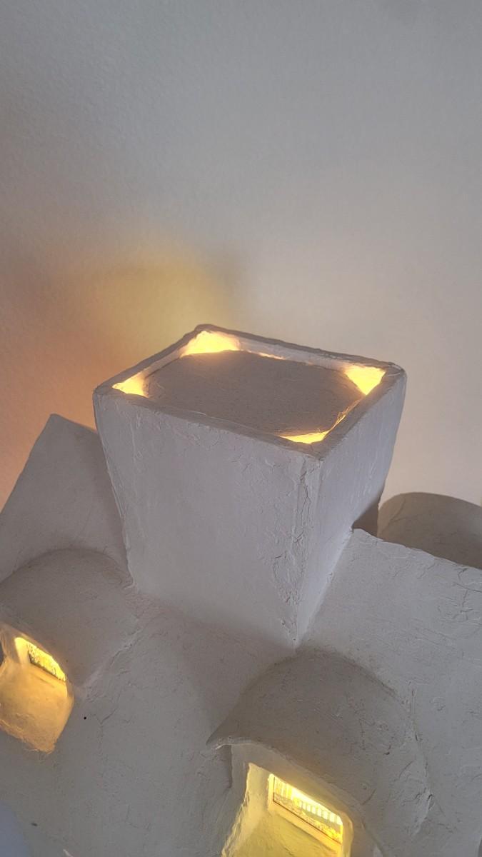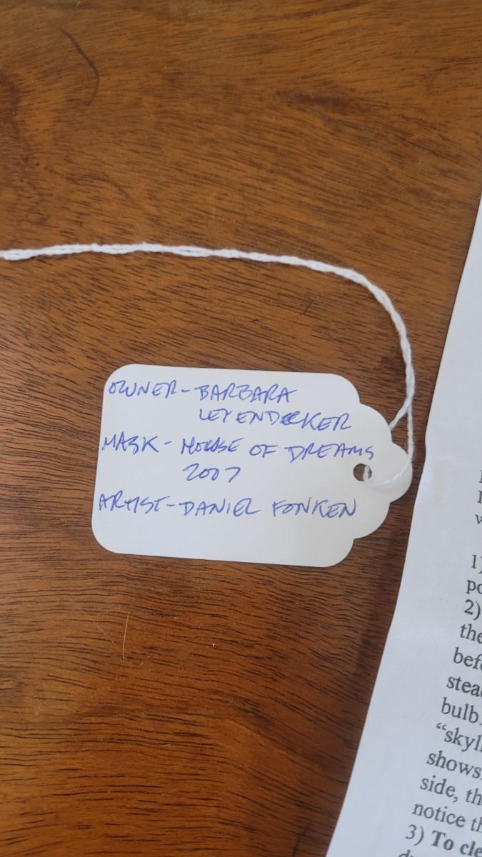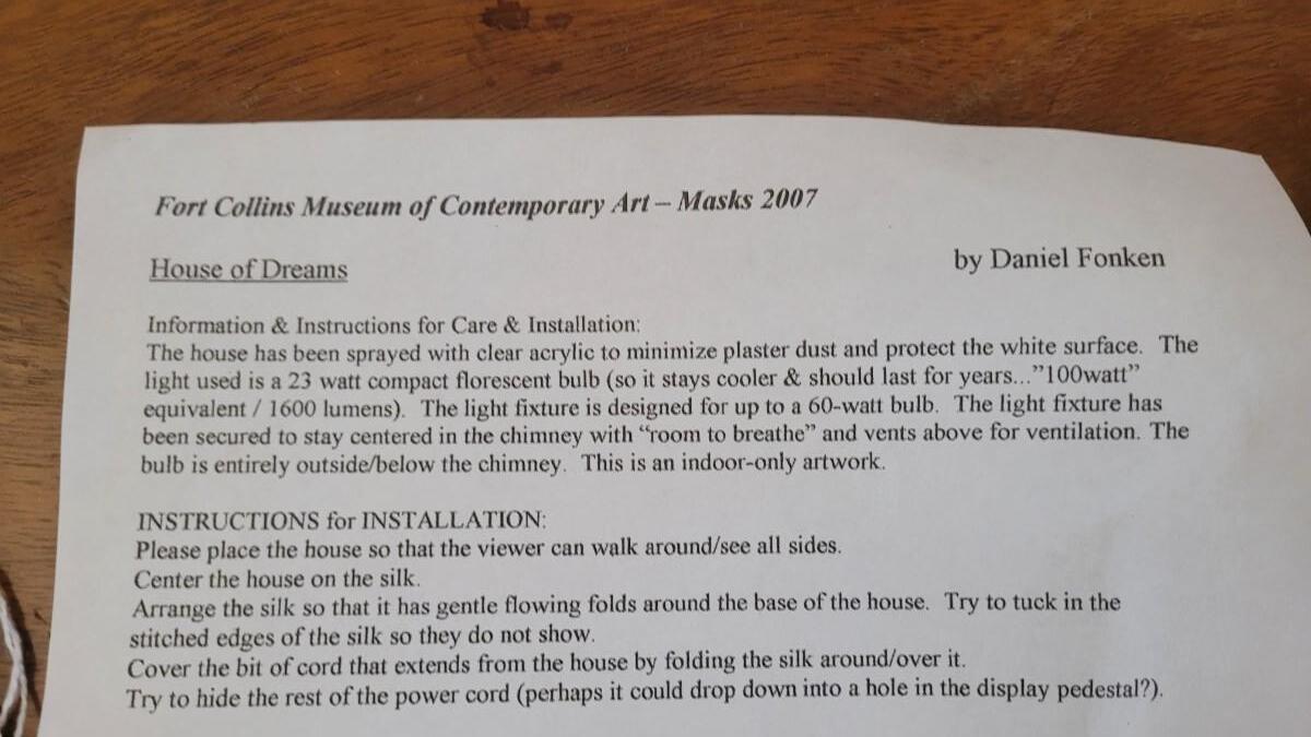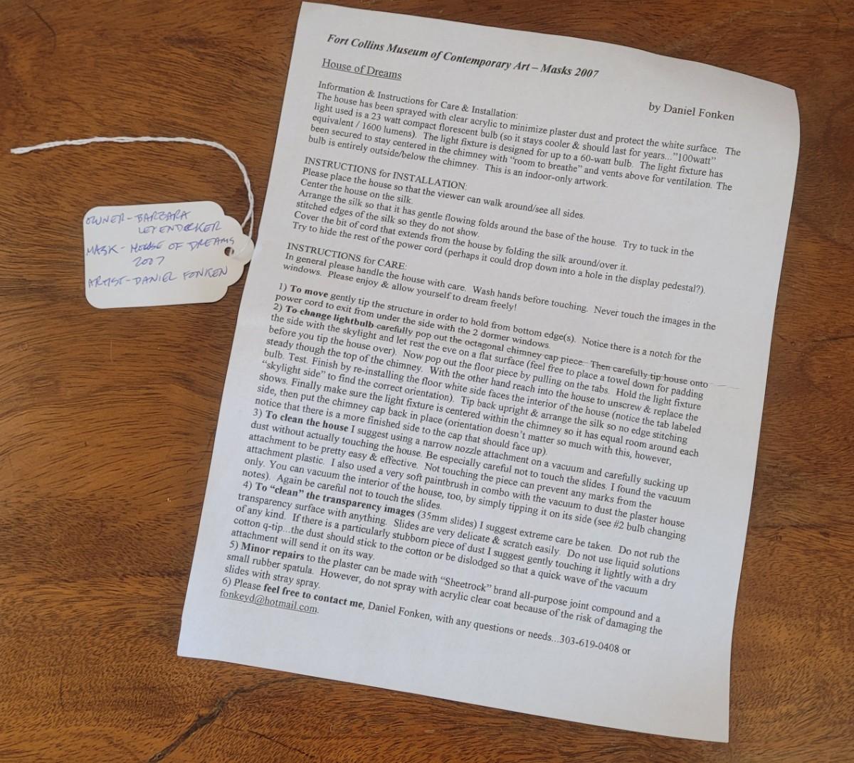 This beautiful sculpture captures the imagination from all angles. When the light is on, a variety of film negatives are illuminated in all the windows which draws you into the intimate house. The mask adds a dreamy depth to the piece.