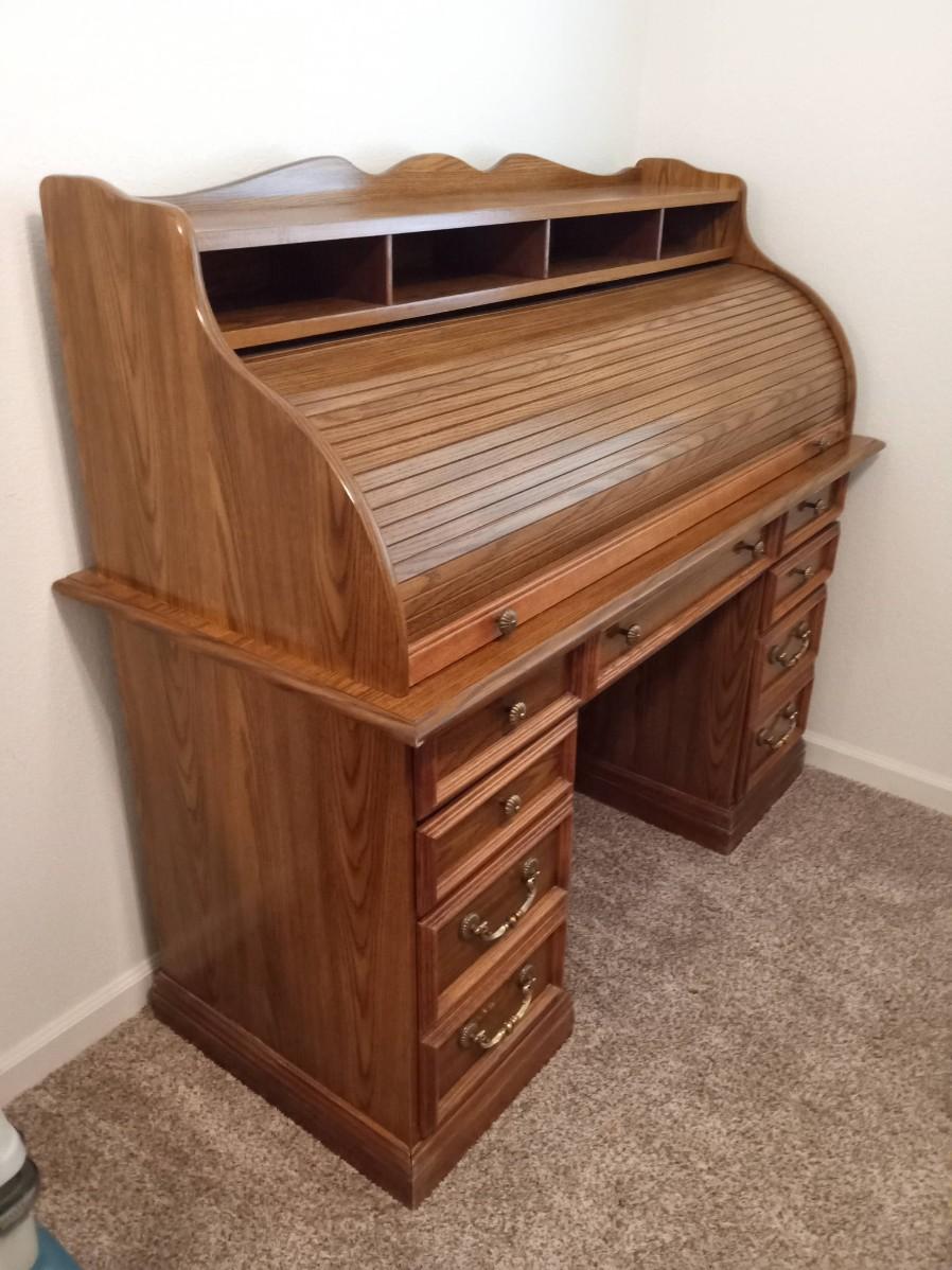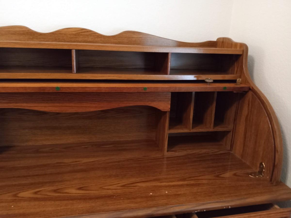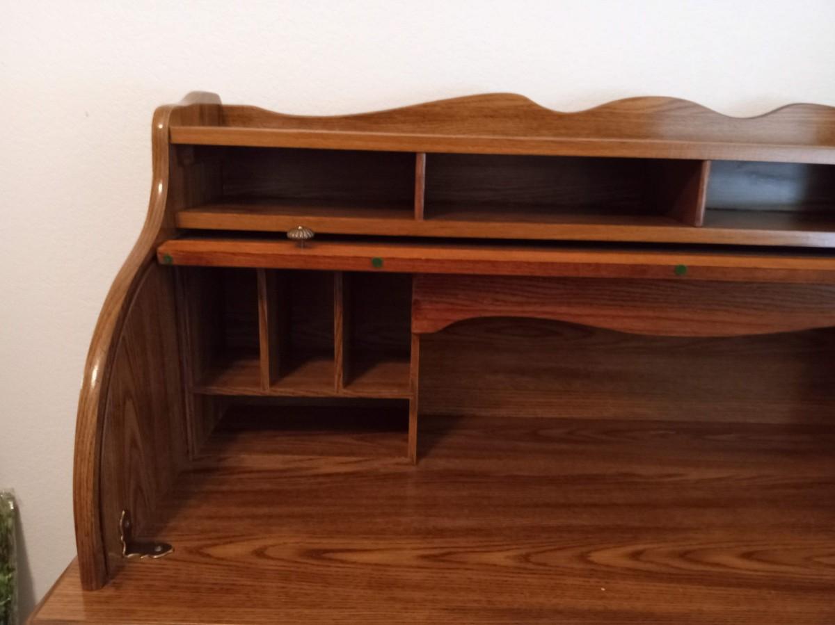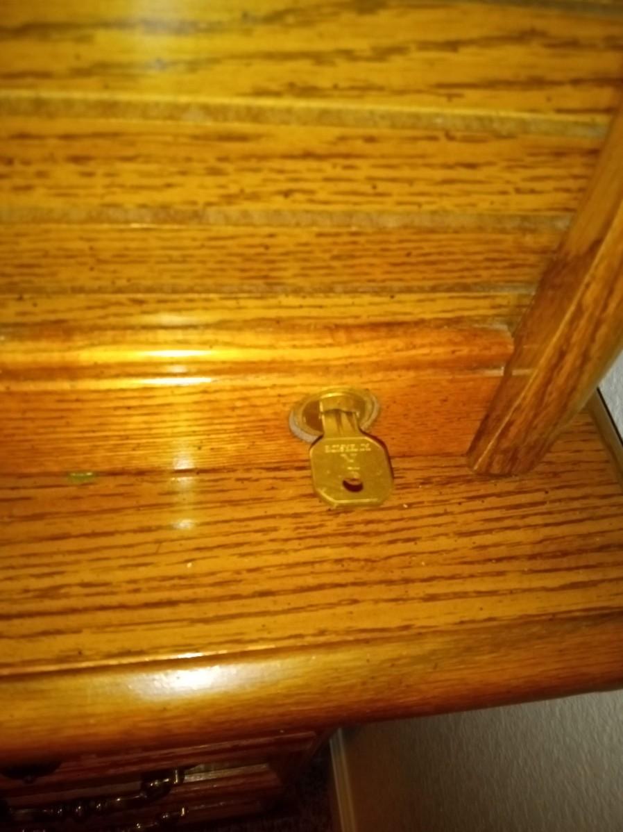 THE ROLLTOP LOCKS WITH A KEY THAT IS PRESENT, THERE IS LIGHT SCRAPS WHERE THE ROLLTOP MEETS THE TOP OF THE DESK