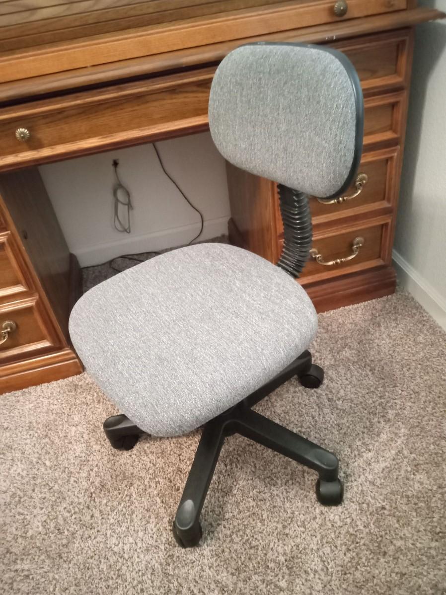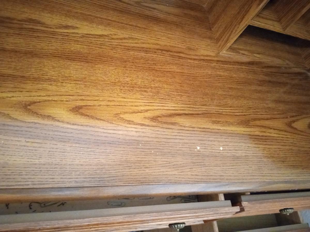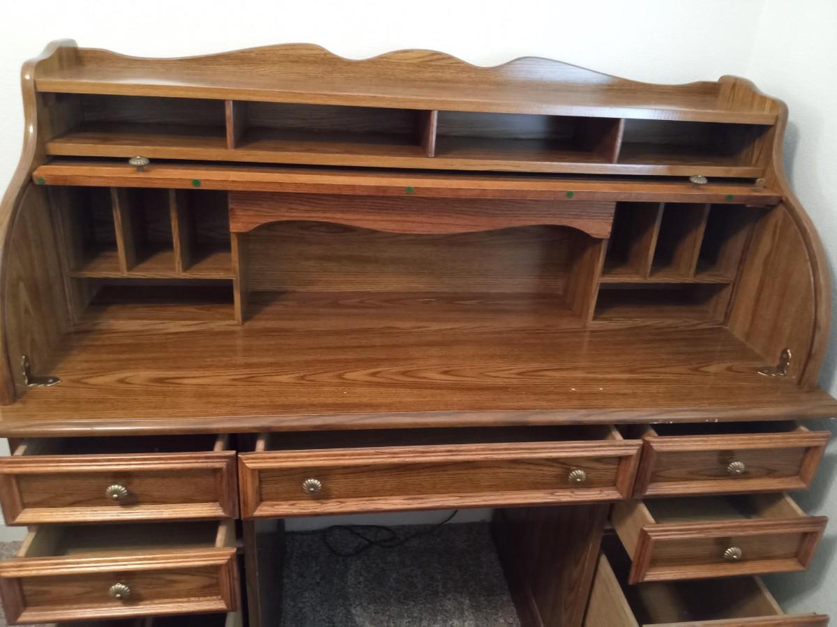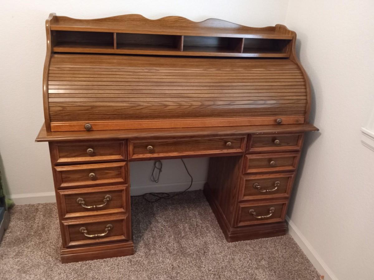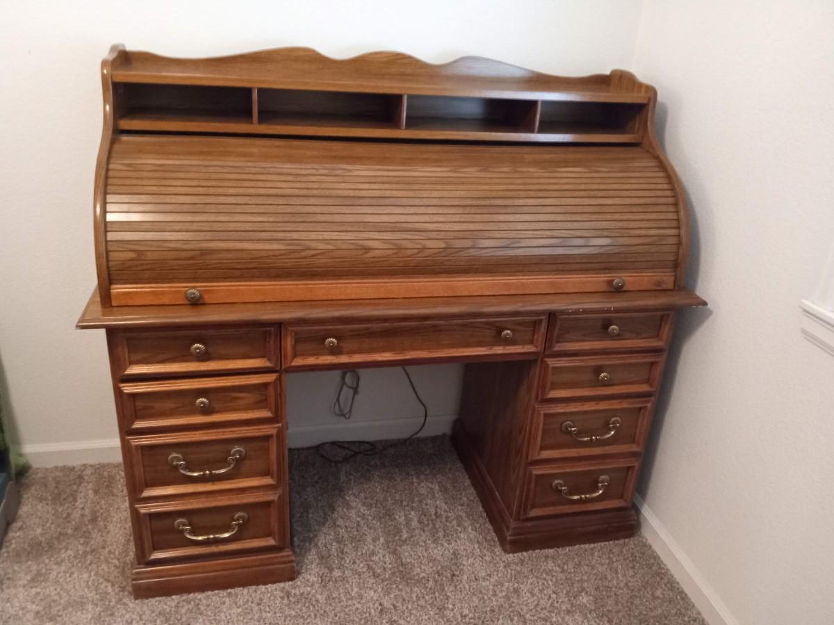 THE ROLLTOP LOCKS WITH A KEY THAT IS PRESENT, THERE IS LIGHT SCRAPS WHERE THE ROLLTOP MEETS THE TOP OF THE DESK