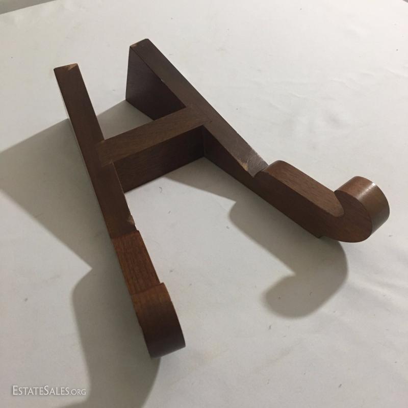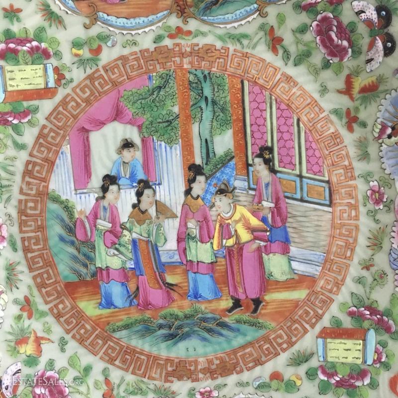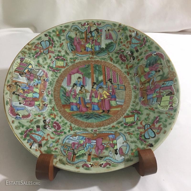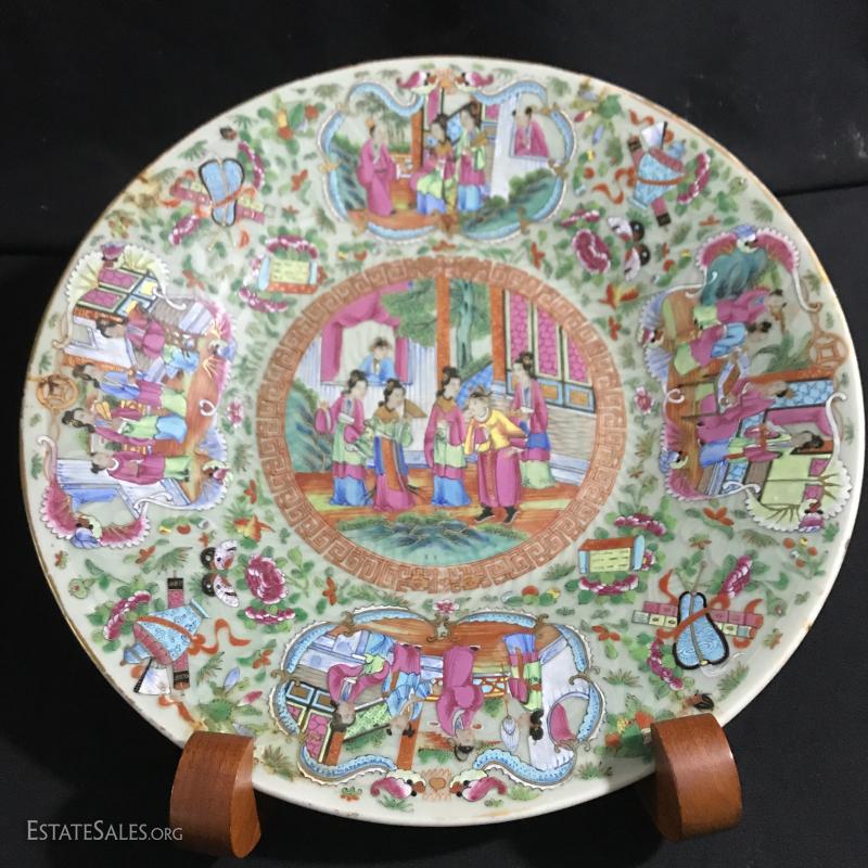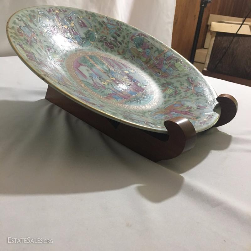 Asian plate with stand. No markings on back. Slight gold fading around rim of plate. 13.5" diameter. wood stand is unique and seems custom to this bowl. Great display piece.